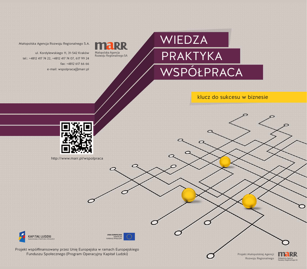Małopolska Agencja Rozwoju Regionalnego S.A. ul. Kordylewskiego 11, 31-542 Kraków tel.: +4812 417 74 22, +4812 417 74 07, 617 99 24 fax: +4812 617 66 66 e-mail: [email protected] WIEDZA PRAKTYKA WSPÓŁPRACA klucz do sukcesu w biznesie http://www.marr.pl/wspolpraca Projekt współfinansowany przez Unię Europejska w ramach Europejskiego Funduszu Społecznego (Program Operacyjny Kapitał Ludzki) Projekt Małopolskiej Agencji Rozwoju Regionalnego Staże pracowników naukowych w firmach Nowa oferta! Sieć wiedzy i współpracy (Sieć WW) dla kogo? »» małopolskie firmy »» pracownicy naukowi jak to działa? sieć WW to nowy wymiar kontaktów firm i naukowców korzyści: »» dla firm: poprawa konkurencyjności, wprowadzenie innowacyjnych rozwiązań »» dla pracowników naukowych: nabycie kompetencji biznesowych, komercjalizacja wyników badań Staż trwa do 6 miesięcy (3 500 zł/miesięcznie). Rekrutacja od kwietnia 2013 roku. Staże i szkolenia pracowników firm w jednostkach naukowych dla kogo? »» pracownicy małopolskich firm MŚP »» jednostki naukowe z siedzibą w Małopolsce korzyści: »» dla pracowników firm: podniesienie kompetencji zawodowych »» dla jednostek naukowych: wzmocnienie współpracy z biznesem, włączenie praktyki biznesowej do badań naukowych Staż trwa do 3 miesięcy (3 500 zł/miesięcznie). Rekrutacja kwiecień/maj 2013 roku. jeśli chcesz: »» nawiązać współpracę biznesową »» wymieniać wiedzę naukową i praktykę biznesową »» uzyskać dostęp do: »» baz pracowników naukowych, jednostek naukowych, przedsiębiorstw, ekspertów etc. »» ofert zasobów technicznych i infrastruktury badawczej »» wypracowanych procesów biznesowych, wyników badań i ekspertyz »» znaleźć członków interdyscyplinarnych zespołów zadaniowych »» dzielić się wiedzą i wymieniać doświadczenia zarejestruj się w nowej, interaktywnej bazie projektu MARR. Nawiąż kontakty biznesowe on-line, wykorzystaj wiedzę do realizacji własnych pomysłów. Zarejestruj się bezpłatnie na marr.pl/wspolpraca. Do współpracy zapraszamy pracowników naukowych, jednostki naukowe i firmy. Sieć WW powstaje w ramach projektu: „Wiedza, praktyka, współpraca — klucz do sukcesu w biznesie”, realizowanego od stycznia 2013 r. do grudnia 2014 r. Szczegóły na marr.pl/wspolpraca
