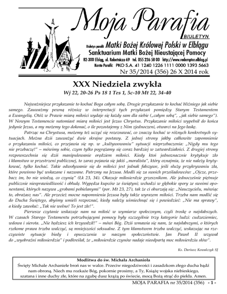 Nr 35/2014 (356) 26 X 2014 rok I XXX Niedziela zwykła Wj 22, 20-26 Ps 18 1 Tes 1, 5c-10 Mt 22, 34-40 Najważniejsze przykazanie to kochać Boga całym sobą. Drugie przykazanie to kochać bliźniego jak siebie samego. Zauważmy pewną różnicę w interpretacji tych przykazań pomiędzy Starym Testamentem a Ewangelią. Otóż w Prawie miarą miłości wydaje się każdy sam dla siebie („całym sobą”, „jak siebie samego”). W Nowym Testamencie natomiast miarą miłości jest Jezus Chrystus. Przykazanie miłości wypełnił do końca jedynie Jezus, a my możemy tego dokonać, o ile pozostajemy z Nim zjednoczeni, otwarci na Jego łaskę. Patrząc na Chrystusa, możemy też uczyć się rozeznawać, co znaczy kochać w różnych konkretnych sytuacjach. Można dziś zauważyć dwie skrajne postawy. Z jednej strony jakby całkowite zapomnienie o przykazaniu miłości, co przejawia się np. w „kultywowaniu” sytuacji nieprzebaczenia: „Nigdy mu tego nie przebaczę!” – mówimy sobie, czym tylko pogrążamy się coraz bardziej w zatwardziałości. Z drugiej strony rozpowszechnia się dziś manipulowanie orędziem miłości. Kiedy ktoś jednoznacznie krytykuje zło i kłamstwo w przestrzeni publicznej, to zaraz pojawia się jakiś „moralista”, który oznajmia, że nie należy krytykować, tylko kochać. Takie odwoływanie się do miłości jest jednak fałszywe, jeśli służy przykrywaniu zła, które powinno być wskazane i nazwane. Patrzmy na Jezusa. Modli się za swoich prześladowców: „Ojcze, przebacz im, bo nie wiedzą, co czynią” (Łk 23, 34). Okazuje miłosierdzie grzesznikom. Ale jednocześnie piętnuje publicznie niesprawiedliwość i obłudę. Wypędza kupców ze świątyni; wchodzi w głębokie spory ze swoimi oponentami, których nazywa „grobami pobielanymi” (por. Mt 23, 27), tak że ci oburzają się: „Nauczycielu, mówiąc to, obrażasz nas”. Ale przecież mocne napomnienia Jezusa były także wyrazem miłości. Trzeba nam modlić się do Ducha Świętego, abyśmy umieli rozpoznać, kiedy należy uśmiechnąć się i powiedzieć: „Nie ma sprawy”, a kiedy zawołać: „Tak nie wolno! To jest złe!”. Pierwsze czytanie wskazuje nam na miłość w wymiarze społecznym, czyli troskę o najsłabszych. W czasach Starego Testamentu potrzebującymi pomocy były szczególnie trzy kategorie ludzi: cudzoziemiec, wdowa i sierota. „Nie będziesz ich krzywdził!” – mówi Bóg. Dziś wmawia się nam, że najsłabszymi, o których rzekome prawa trzeba walczyć, są mniejszości seksualne. Z tym kłamstwem trzeba walczyć, wskazując na rzeczywiste sytuacje biedy i opuszczenia w naszym społeczeństwie. Jan Paweł II wzywał do „wyobraźni miłosierdzia” i podkreślał, że „miłosierdzie czynów nadaje nieodpartą moc miłosierdziu słów”. Ks. Dariusz Kowalczyk SJ Modlitwa do św. Michała Archanioła Święty Michale Archaniele broń nas w walce. Przeciw niegodziwości i zasadzkom złego ducha bądź nam obroną. Niech mu rozkaże Bóg, pokornie prosimy, a Ty, Książę wojska niebieskiego, szatana i inne duchy złe, które na zgubę dusz krążą po świecie, mocą Bożą strąć do piekła. Amen. MOJA PARAFIA nr 35/2014 (356) - 1 - Kancelaria Parafialna czynna od wtorku do piątku w godz. 1000 – 1200 i 1600 – 1730. Sprawy związane z pogrzebem można zgłaszać w każdym dniu. Nabożeństwo różańcowe w październiku odprawiamy: W niedzielę, poniedziałek, środę, czwartek, piątek o godz. 17:30 We wtorek o godz. 7:30 W sobotę o godz. 9:30 Nabożeństwo różańcowe dla dzieci w poniedziałek, środę i w piątek o godz. 16:30 Nabożeństwo różańcowe dla kandydatów do bierzmowania w każdy czwartek o 17:30 Dar odpustu Nawiedzając z modlitwą kościół lub kaplicę w uroczystość Wszystkich Świętych oraz w Dniu Zadusznym, możemy pod zwykłymi warunkami uzyskać odpust zupełny, czyli całkowite darowanie kar dla dusz w czyśćcu cierpiących. Ponadto wypełniając określone warunki, możemy uzyskać odpust zupełny od 1 do 8 listopada za pobożne (czyli modlitewne) nawiedzenie cmentarza. Odpust zupełny możemy uzyskać raz dziennie. Warunki uzyskania odpustu zupełnego: 1. Wzbudzić intencję jego otrzymania. 2. Być w stanie łaski uświęcającej. 3. Wyzbyć się przywiązania do jakiegokolwiek grzechu. 4. Przyjąć w tym dniu Komunię Świętą. 5. Odnowić naszą jedność ze wspólnotą Kościoła poprzez odmówienie: “Ojcze nasz”, “Wierzę w Boga” oraz modlitwy w intencjach bliskich Ojcu Świętemu. Więcej możesz przeczytać na stronie internetowej Radia Maryja: http://www.radiomaryja.pl/kosciol/warunki-odpustu-zupelnego-1-8-listopada/ NABOŻEŃSTWA NA CK „DĘBICA” W ELBLĄGU W uroczystość Wszystkich Świętych 2014 roku na Cmentarzu Komunalnym „Dębica” w Elblągu będzie celebrowana msza święta przy starej kaplicy o godzinie 1200. Mszy świętej będzie przewodniczył Bp Józef Wysocki, Biskup Pomocniczy Diecezji Elbląskiej. We Wspomnienie wszystkich wiernych zmarłych 2014 roku na Cmentarzu Komunalnym „Dębica” w Elblągu będzie celebrowana msza święta przy nowej kaplicy o godzinie 1300. Mszy świętej będzie przewodniczył Bp Józef Wysocki, Biskup Pomocniczy Diecezji Elbląskiej. Ks. mgr Andrzej Klukowski, Proboszcz Parafii Św. Floriana w Elblągu WSZYSTKICH ŚWIĘTYCH NA AGRYKOLA W ELBLĄGU Dnia 1 listopada 2014 roku (uroczystość Wszystkich Świętych) Msza święta odpustowa w kościele parafialnym o godz. 1130, a po niej procesja na cmentarzu na Agrykola. Ks. mgr Stanisław Drozdowski MIC, Proboszcz Parafii Wszystkich Świętych w Elblągu Kartki na nabożeństwo wypominkowe za zmarłych, można składać w kancelarii parafialnej, w zakrystii i przy furcie klasztornej. Nabożeństwo wspominkowe za zmarłych, będzie odprawiane w listopadzie o godz. 17:30 w poniedziałek, środę, czwartek, piątek i w niedzielę, o godz. 7:30 we wtorek i w sobotę, z wyjątkiem soboty 1 listo