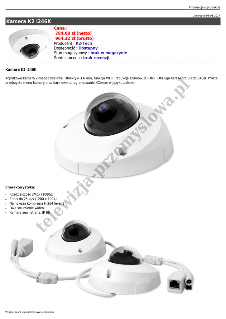 Informacje o produkcie Utworzono 08-03-2017 Kamera K2 i246K Cena : 784,00 zł (netto) 964,32 zł (brutto) Producent : K2-Tech Dostępność : Dostępny Stan magazynowy : brak w magazynie Średnia ocena : brak recenzji Kamera K2 i246K Charakterystyka: ● ● ● te ● Rozdzielczość 2Mpx (1080p) Zapis do 25 kl/s (1280 x 1024) Najnowsza kompresja H.264 level 3 Dwa strumienie wideo Kamera zewnętrzna, IP 66 le ● w iz ja -p r ze m ys lo w a. pl Kopułkowa kamera 2-megapikselowa. Obiektyw 3.6 mm, funkcja WDR, redukcja szumów 3D-DNR. Obsługa kart Micro SD do 64GB. Proste i przejrzyste menu kamery oraz darmowe oprogramowanie XCenter w języku polskim. Wygenerowano w programie www.oscGold.com pl a. ze m ys lo w -p r w iz ja Specyfikacja te Rozdzielczość 1/2.8" 2.1MPx Sensor Low Light Progressive Scan Sony CMOS ARM9 Hilsilicon Hi 3516 500MHz 3.6 mm MPx 0,05 Lux / F1.2 (kolor); 0,005 Lux (B/W) Nie H.264 Level 3/MJPEG Tak Strumień 1 1920 x 1080, 1280 x 720 le Przetwornik CPU Obiektyw Czułość Doświetlenie IR Kompresja wideo Dwustrumieniowość Prędkość zapisu Bitrate Funkcje Dodatkowe Wyjścia wideo Kompresja audio Wej. / Wyj. audio Wej. / Wyj. alarmowe Strefy prywatności Detekcja ruchu Karta pamięci Interfejs systemowy Powiadamianie e-mail Protokoły sieciowe Dostęp mobilny WiFi Oprogramowanie Pozostałe Funkcje Zasilanie Pobór mocy Szczelność Strumień 2 960 x 528, 640 x 352, 480 x 256 25kl/s (1920 x 1080) 32Kbit/s - 16Mbit/s 3DNR, WDR, AGC Nie G.726, G711A, G711U Nie Nie Tak, 4 strefy Tak, 4 strefy Micro SD, max. 64GB Ethernet 10Base-T/100Base-TX Tak (ze zdjęciem) RTP, RTSP,HTTP,TCP/IP,UDP,SMTP,DDNS,DHCP,FTP,UPnP, IPv4, IPv6, NTP Tak (tel.kom typu smartphone) Brak Darmowy XCenter / dostęp IE Multicast, harmonogram, maski DC 12V, POE (802.3af) ≤ 2W Kamera zewnętrzna, IP 66 Informacje o produkcie Wymiary Temperatura pracy 107 x 53 mm -20°C ~ +50°C Wymagania sprzętowe komputera Minimalna konfiguracja sprzętowa: • Procesor: 2,8 Ghz • Pamięć: 512 MB • Karta graficzna: TNT 2 • Karta dźwiękowa: głośnik, mikrofon w przypadku komunikacji dwukierunkowej • Dysk twardy: Min 40 GB do rejestracji obrazu pl Zalecana konfiguracja sprzętowa: • Procesor: Dual-Core 2,6 Ghz • Pamięć: 1 GB • Karta graficzna: Nvidia Geforce FX5200 lub ATI RADEON 7000 (9000), 256MB pamięci, możliwość skalowania obrazu ze m ys lo w a. System operacyjny: Windows 2000/ Windows XP/ Windows Vista/ Windows 7 Oprogramowanie: • Przeglądarka Iternet Explorer 6.0 lub nowsza • DirectX 8.0 lub nowszy • Obsługa protokołu TCP/IP Karta graficzna: Karta graficzna musi obsługiwać konwersję i powiększanie obrazu. Producent przetestował następujące karty: • Nvidia Tnt/Tnt2, • Geforce Mx200/400/420/440, Fx5200/5600 i ich serie; • ATI Radeon 7000/7200/7500/8500/9000/9200/9500/9600 i ich serie, • MatroxG450/550; • INTEL 845G/865G i ich serie. te le w iz ja -p r Tabela: specyfikacja Wygenerowano w programie www.oscGold.com pl a. ze m ys lo w -p r w iz ja le te zadzwoń i zapytaj o rabat (22 672-36-36) (505-130-571)