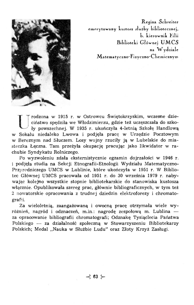 R e g in a S cb r e ite r e m e r y t o w a n y k u sto s z .słu żb y b i b li o t e c z n e j , b. k i e r o w n i k ł i l u B ib lio te k i G łó w n e j U M C S na W y j z ia le A i a t e m a t y c z n o " F i z y c z n o ‘' C b e m i c z n y i n rodzona w 1915 r. w Ostrowcu Świętokrzyskim, wczesne dzie ciństwo spędziła we Włodzimierzu, gdzie też uczęszczała do szko ły powszechnej. W 1935 r. ukończyła 4-letnią Szkołę Handlową w Sokalu niedaleko Lwowa i podjęła pracę w Urzędzie Pocztowym w Bereznym nad Słuczem. Losy wojny rzuciły ją w Lubelskie do mia steczka Łęczna. Tam przeżyła okupację pracując jako likwidator w ra chubie Syndykatu Rolniczego. Po wyzwoleniu zdała eksternistycznie egzamin dojrzałości w 1946 r. 1 podjęła studia na Sekcji Etnografii-Etnologii Wydziału MatematycznoPrzyrodniczego' UMCS w Lublinie, które ukończyła w 1951 r. W Bibliotec Głównej UMCS pracowała od 1951 r. do 30 września 1979 r. naby wając kolejno wszystkie stopnie bibliotekarskie do stanowiska kustosza włącznie. Opublikowała szereg prac, głównie bibliograficznych, w tym też 2 nowatorskie opracowania z trudnej dziedzin elektroforezy i chromato grafii. Za wieloletnią, zaangażowaną i owocną pracę otrzymała wiele wy różnień, nagród i odznaczeń, m.in.: nagrodę zespołową m. Lublina — za opracowanie bibliografii chromatograf i; Odznakę Tysiąclecia Państwa Polskiego — za działalność społeczną w Stowarzyszeniu Bibliotekarzy Polskich; Medal ,,Nauka w Służbie Ludu” oraz Złoty Krzyż Zasługi. DWADZIEŚCIA LAT DZIEJÓW BIBLIOTEK ZAKŁADOWYCH CHEMII I FIZYKI UMCS 1955-1975 Z arys dziejów Filii Biblioteki Głównej UMCS uwzględnia specy ficzne warunki w jakich powstawała i stanowi, zdaniem autora, interesujący wkład do jej histroii. Podjęcie tematu uzasadniała troska o zabezpieczenie kronikarskie pionierskich prac ludzi miłujących książką oraz okoliczność, że w naszym piśmiennictwie pomija się rolę i znaczenie bibliotek filialnych w ośrodkach naukowych. Opracowanie oparto głównie na materiałach źródłowych, jak: spra wozdania miesięczne i roczne, przekazy archiwalne, sprawozdania dru kowane z działalności Biblioteki Głównej UMCS, Biuletyn Biblioteki UMCS, itp. Luki w dokumentach wypełniano pamięcią własną i współ pracowników. 1. ZMIANY ORGANIZACYJNE I LOKALOWE Biblioteka Instytutu Fizyki UMCS, jedna z najstarszych bibliotek specjalistycznych na uniwersytecie, faktycznie istnieje od chwili pow stania uczelni, mimo że znacznie później otrzymała swój statut. Wielo krotnie też zmieniała swoją nazwę i lokale. Jeszcze w roku 1944, kiedy powstał na uniwersytecie Wydział Przyrodniczy, w nowo utworzonych katedrach fizyki i chemii zbierano książki i czasopisma, tworząc pod ręczny księgozbiór dla pracowników i studentów. Biblioteka Główna nie wiele mogła pomóc bowiem sama znajdowała się „na dorobku”, a jej agendy były porozrzucane w różnych punktach miasta. Stąd księgozbio ry gromadzone przy zakładach naukowych spełniały tak doniosłą rolę. W miesiącu listopadzie 1955 roku do dyrekcji Biblioteki Głównej, mieszczącej się wówczas w budynku przy ul. Narutowicza 4, zgłosili się profesorowie: Marian Janczewski — kierownik Katedry Chemii Orga nicznej i Andrzej Waksmundzki — kierownik Katedry Chemii Fizycznej z propozycją utworzenia biblioteki wydziałowej. Oczekiwali pomocy i od delegowania energicznego, doświadczonego bibliotekarza. Zdecydowano powierzyć stanowisko organizatora i przyszłego kierownika biblioteki mgr Reginie Schreiter. Ustalono, że nowo organizowana placówka będzie nosiła nazwę Biblioteki Sekcji Chemicznej Wydziału Matematyki, Fi zyki i Chemii. Miała się ona mieścić w wygospodarowanych pomiesz czeniach części parterowej gmachu Fizyki przy ul. Nowotki 8. Początki, jak to bywa najczęściej, nie należały do łatwych. Niewielki pokój, w nim trzy metrowej długości regały, trochę zrzuconych w kącie książek i czasopism, stanowiły podstawę startu. Marzeniem było zdobycie niezbędnych regałów, szaf, stolików, krzeseł i innych urządzeń, nikomu nie śniła się maszyna do pisania czy kserograf. Pomieszczenie przydzielo ne bibliotece miało zaledwie 12 m2, należało w nim pomieścić zbiory, bi bliotekarza i czytelników. Z początkiem roku 1956 przystąpiono do gro madzenia księgozbioru i mebli. Dwa stoły z hallu przyniósł prof. dr A. Waksmundzki, 4 regały ze skromnych zasobów przydzielił dyr. T. Smół ka, skrzynkę katalogową wypożyczyli pracownicy Zakładu Chemii Fi zycznej, a dwanaście starych krzeseł dostarczył Oddział Gospodarczy UMCS. Po zakończeniu prac organizacyjnych, w dniu 1 października 1957 r. nastąpiło otwarcie Biblioteki Sekcji Chemicznej Wydziału Fizyki i Chemii UMCS. Mimo ciasnoty wygospodarowano czytelnikom 10 miejsc, lokując część zbiorów na korytarzu. W kilka lat potem biblioteka otrzymała drugi pokój na pomieszczenia magazynowe. Nieznaczną poprawę przyniósł rok 1964, kiedy to, w wyniku prze mieszczeń, przydzielono bibliotece dwa dalsze pokoje o powierzchni 46 m2. W tymże roku zmieniła ona swoją nazwę na: Filia Biblioteki Głównej UMCS. Kiedy w roku 1971 został oddany do użytku drugi pawilon gmachu Fizyki, dyrektor Instytutu Fizyki prof. dr hab. S. Szpikowski poszerzył dotychczasowe pomieszczenia biblioteki o dalsze 3 pokoje powierzchnią 105 m2. Wówczas też powiększono czytelnię studencką na 20 miejsc, wy gospodarowano ,,kącik” czytelniany dla pracowników nauki, urządzono właściwie magazyny książek i czasopism oraz wydzielono odrębne po mieszczenie na akcesję i obsługę czytelników. W tymże pokoju mieścił się katalog. Księgozbiór biblioteki do tego czasu tak się już rozrósł, że nie mieścił się w powiększonych przestrzennie magazynach i z koniecz ności jego część przechowywano w 24 szafach ustawionych na koryta rzach. Kolejna reor