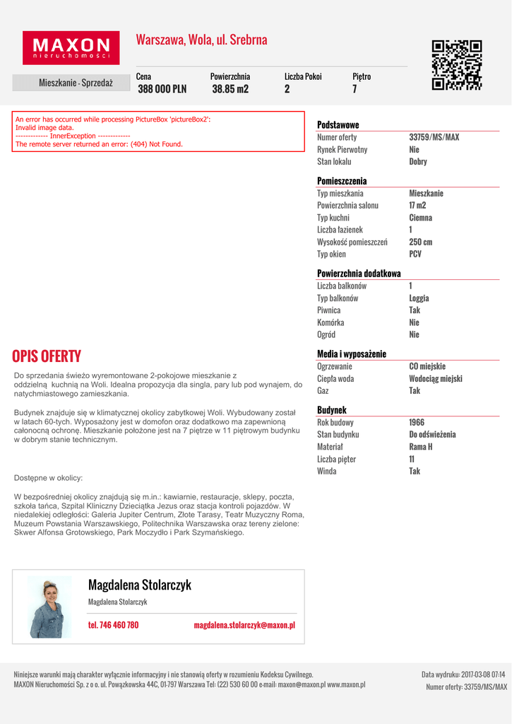 Warszawa, Wola, ul. Srebrna Mieszkanie - Sprzedaż Cena 388 000 PLN Powierzchnia 38.85 m2 Liczba Pokoi 2 An error has occurred while processing PictureBox 'pictureBox2': Invalid image data. ------------- InnerException ------------The remote server returned an error: (404) Not Found. Piętro 7 Podstawowe Numer oferty 33759/MS/MAX Rynek Pierwotny Nie Stan lokalu Dobry Pomieszczenia Typ mieszkania Mieszkanie Powierzchnia salonu 17 m2 Typ kuchni Ciemna Liczba łazienek 1 Wysokość pomieszczeń 250 cm Typ okien PCV Powierzchnia dodatkowa Liczba balkonów 1 Typ balkonów Loggia Piwnica Tak Komórka Nie Ogród Nie OPIS OFERTY Media i wyposażenie Do sprzedania świeżo wyremontowane 2-pokojowe mieszkanie z oddzielną kuchnią na Woli. Idealna propozycja dla singla, pary lub pod wynajem, do natychmiastowego zamieszkania. Ogrzewanie CO miejskie Ciepła woda Wodociąg miejski Gaz Tak Budynek znajduje się w klimatycznej okolicy zabytkowej Woli. Wybudowany został w latach 60-tych. Wyposażony jest w domofon oraz dodatkowo ma zapewnioną całonocną ochronę. Mieszkanie położone jest na 7 piętrze w 11 piętrowym budynku w dobrym stanie technicznym. Dostępne w okolicy: Budynek Rok budowy 1966 Stan budynku Do odświeżenia Materiał Rama H Liczba pięter 11 Winda Tak W bezpośredniej okolicy znajdują się m.in.: kawiarnie, restauracje, sklepy, poczta, szkoła tańca, Szpital Kliniczny Dzieciątka Jezus oraz stacja kontroli pojazdów. W niedalekiej odległości: Galeria Jupiter Centrum, Złote Tarasy, Teatr Muzyczny Roma, Muzeum Powstania Warszawskiego, Politechnika Warszawska oraz tereny zielone: Skwer Alfonsa Grotowskiego, Park Moczydło i Park Szymańskiego. Magdalena Stolarczyk Magdalena Stolarczyk tel. 746 460 780 [email protected] Niniejsze warunki mają charakter wyłącznie informacyjny i nie stanowią oferty w rozumieniu Kodeksu Cywilnego. MAXON Nieruchomości Sp. z o o. ul. Powązkowska 44C, 01-797 Warszawa Tel: (22) 530 60 00 e-mail: [email protected] www.maxon.pl Data wydruku: 2017-03-08 07:14 Numer oferty: 33759/MS/MAX