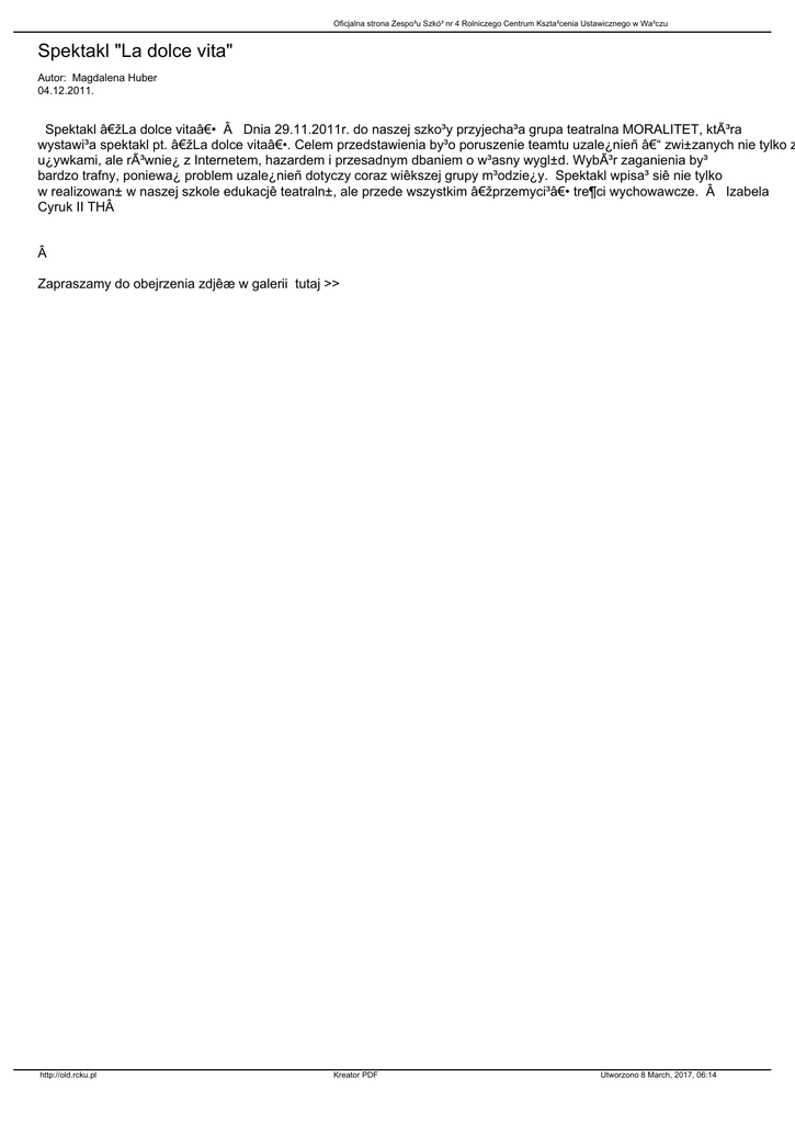 Oficjalna strona Zespo³u Szkó³ nr 4 Rolniczego Centrum Kszta³cenia Ustawicznego w Wa³czu Spektakl "La dolce vita" Autor: Magdalena Huber 04.12.2011. Spektakl „La dolce vita―  Dnia 29.11.2011r. do naszej szko³y przyjecha³a grupa teatralna MORALITET, która wystawi³a spektakl pt. „La dolce vita―. Celem przedstawienia by³o poruszenie teamtu uzale¿nieñ – zwi±zanych nie tylko z u¿ywkami, ale równie¿ z Internetem, hazardem i przesadnym dbaniem o w³asny wygl±d. Wybór zaganienia by³ bardzo trafny, poniewa¿ problem uzale¿nieñ dotyczy coraz wiêkszej grupy m³odzie¿y. Spektakl wpisa³ siê nie tylko w realizowan± w naszej szkole edukacjê teatraln±, ale przede wszystkim „przemyci³â€• tre¶ci wychowawcze.  Izabela Cyruk II TH  Zapraszamy do obejrzenia zdjêæ w galerii tutaj >> http://old.rcku.pl Kreator PDF Utworzono 8 March, 2017, 06:14