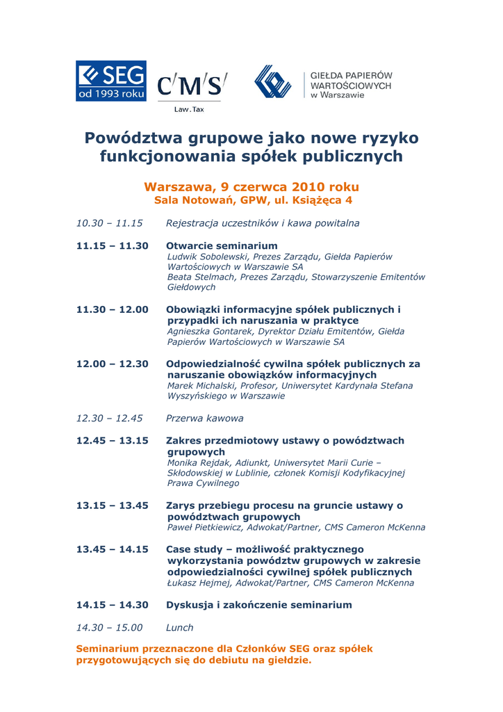 Powództwa grupowe jako nowe ryzyko funkcjonowania spółek publicznych Warszawa, 9 czerwca 2010 roku Sala Notowań, GPW, ul. Książęca 4 10.30 – 11.15 Rejestracja uczestników i kawa powitalna 11.15 – 11.30 Otwarcie seminarium Ludwik Sobolewski, Prezes Zarządu, Giełda Papierów Wartościowych w Warszawie SA Beata Stelmach, Prezes Zarządu, Stowarzyszenie Emitentów Giełdowych 11.30 – 12.00 Obowiązki informacyjne spółek publicznych i przypadki ich naruszania w praktyce Agnieszka Gontarek, Dyrektor Działu Emitentów, Giełda Papierów Wartościowych w Warszawie SA 12.00 – 12.30 Odpowiedzialność cywilna spółek publicznych za naruszanie obowiązków informacyjnych Marek Michalski, Profesor, Uniwersytet Kardynała Stefana Wyszyńskiego w Warszawie 12.30 – 12.45 Przerwa kawowa 12.45 – 13.15 Zakres przedmiotowy ustawy o powództwach grupowych Monika Rejdak, Adiunkt, Uniwersytet Marii Curie – Skłodowskiej w Lublinie, członek Komisji Kodyfikacyjnej Prawa Cywilnego 13.15 – 13.45 Zarys przebiegu procesu na gruncie ustawy o powództwach grupowych Paweł Pietkiewicz, Adwokat/Partner, CMS Cameron McKenna 13.45 – 14.15 Case study – możliwość praktycznego wykorzystania powództw grupowych w zakresie odpowiedzialności cywilnej spółek publicznych Łukasz Hejmej, Adwokat/Partner, CMS Cameron McKenna 14.15 – 14.30 Dyskusja i zakończenie seminarium 14.30 – 15.00 Lunch Seminarium przeznaczone dla Członków SEG oraz spółek przygotowujących się do debiutu na giełdzie.