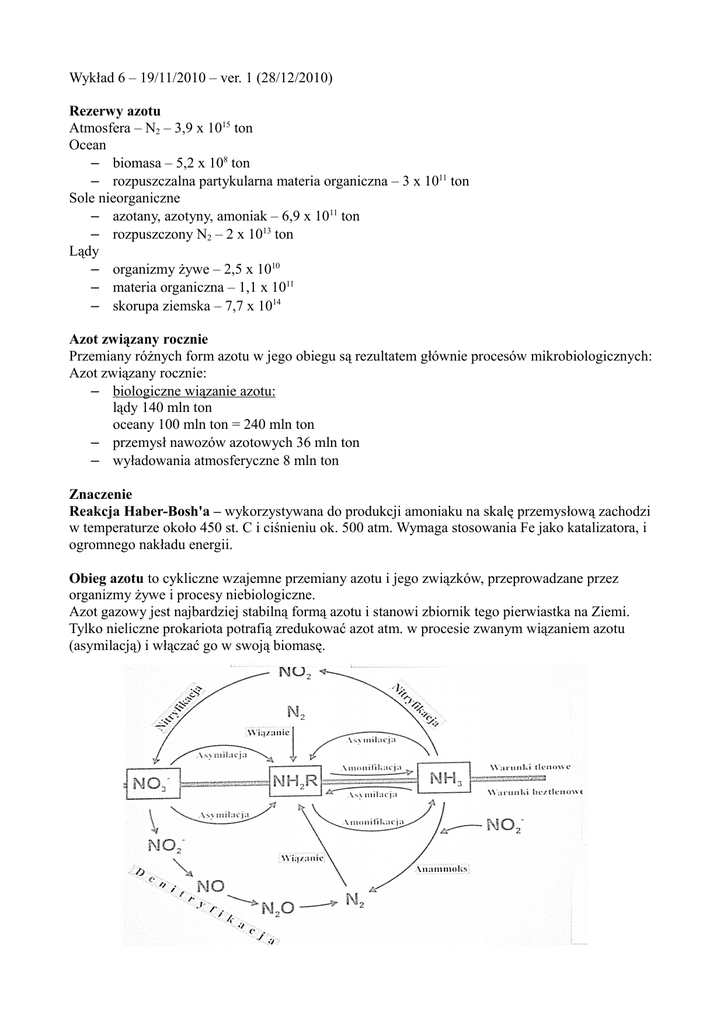 Wykład 6 – 19/11/2010 – ver. 1 (28/12/2010) Rezerwy azotu Atmosfera – N2 – 3,9 x 1015 ton Ocean – biomasa – 5,2 x 108 ton – rozpuszczalna partykularna materia organiczna – 3 x 1011 ton Sole nieorganiczne – azotany, azotyny, amoniak – 6,9 x 1011 ton – rozpuszczony N2 – 2 x 1013 ton Lądy – organizmy żywe – 2,5 x 1010 – materia organiczna – 1,1 x 1011 – skorupa ziemska – 7,7 x 1014 Azot związany rocznie Przemiany różnych form azotu w jego obiegu są rezultatem głównie procesów mikrobiologicznych: Azot związany rocznie: – biologiczne wiązanie azotu: lądy 140 mln ton oceany 100 mln ton = 240 mln ton – przemysł nawozów azotowych 36 mln ton – wyładowania atmosferyczne 8 mln ton Znaczenie Reakcja Haber-Bosh'a – wykorzystywana do produkcji amoniaku na skalę przemysłową zachodzi w temperaturze około 450 st. C i ciśnieniu ok. 500 atm. Wymaga stosowania Fe jako katalizatora, i ogromnego nakładu energii. Obieg azotu to cykliczne wzajemne przemiany azotu i jego związków, przeprowadzane przez organizmy żywe i procesy niebiologiczne. Azot gazowy jest najbardziej stabilną formą azotu i stanowi zbiornik tego pierwiastka na Ziemi. Tylko nieliczne prokariota potrafią zredukować azot atm. w procesie zwanym wiązaniem azotu (asymilacją) i włączać go w swoją biomasę. – procesami biologicznymi w których powstaje N2 jest denitryfikacja i reakcja anammox; – po rozłożeniu związków organicznych zawierających azot dochodzi do uwolnienia amoniaku (amonifikacja); – amoniak jest bdb źródłem azotu dla wszystkich organizmów prokariotycznych; – amoniak jest utleniany przez bakterie nitryfikacyjne (chemolitoautotrofy) do NO2-, a azotyn do azotanu; – azotan może być wykorzystywany jako źródło azotu zarówno przez rośliny jak i przez prokariota mające reduktazę azotanową asymilacyjną; – w warunkach beztlenowych azotan może być wykorzystywany jako końcowy akceptor elektronów (oddychanie azotanowe); – denitryfikacja to oddychanie azotanowe w którym powstają produkty gazowe – N2O i N2. Reakcje mikrobiologiczne Pięć podstawowych reakcji to transformacja jednej formy azotu w drugą: 1. wiązanie N2 - konwersja do amoniaku przy udziale kompleksu enzymatycznego zwanego nitrogenazą; 2. nitryfikacja – biologiczna transformacja jonów amonowych do azotynów i/lub azotanów; 3. denitryfikacja – biologiczna redukcja azotanów do azotu cząsteczkowego; 4. amonifikacja – uwalnianie amoniaku ze struktur organicznych głównie w procesach degradacji białek; 5. asymilacja – włączanie amoniaku do struktur azotu organicznego i budowy biomasy; 6. anammox – to utlenianie amoniaku przy pomocy NO2 do N2. Reakcje niebiologiczne pozostałe procesy niebiologiczne dominujące w obiegu azotu to: – fotolityczna konwersja NO2- do N2O do N2; – tworzenie NO i następczo NO2- w czasie wyładowań atmosferycznych z N2. Organizmy wiążące N2 (diazotrofy) są reprezentantami różnych grup fizjologicznych prokariota, również bakterie i sinice. Bakterie wiążące azot atmosferyczny 1. bakterie wolnożyjące – tlenowe, beztlenowe i fakultatywnie beztlenowe 2. bakterie żyjące w symbiozie z roślinami motylkowymi i niemotylkowymi Sinice wiążące azot atmosferyczny Niesymbiotyczne wiązanie azotu - to wiązanie azotu atmosferycznego przez gatunki wolnożyjące bakterii. Bakterie z rodziny Azotobacteraceae to: – bezwzględne tlenowce, – nitrogenaza tych bakterii jest podobnie jak inne nitrogenazy wrażliwa na obecność tlenu, – uważa się że u Azotobacteraceae rolę ochronną przed dopływem tlenu spełnia intensywne oddychanie oraz wytwarzanie dużej ilości śluzu, – w systematyce Azotobacteraceae brane są pod uwagę takie cechy jak: ruchliwość, zdolność do tworzenia cyst, tworzenie śluzu, barwników, wymagania pokarmowe. Wyróżniamy dwie rodziny: Azotobacter i Azomonas. 1. Rodzaj Azotobacter: bakterie wytwarzają formy spoczynkowe zwane cystami oraz charakterystyczne barwniki, np. Azotobacter chroocoocum wytwarza czarny barwnik – melaninę. 2. Rodzaj Azomonas: bakterie zaliczane do tego rodzaju nie wytwarzają cyst, należą tu następujące gatunki: Azomonas agilis, insignis i makrocytogenes. Symbiotyczne wiązanie azotu Szacuje się, że tylko około 25% związanego biologicznie azotu pochodzi z działalności bakterii wolnożyjących, pozostała ilość jest wynikiem działalności mikroorganizmów żyjących w symbiozie z roślinami motylkowymi i niemotylkowymi. Bakterie wiążące N2 w symbiozie Typy symbiotycznego wiązania azotu cząsteczkowego Wyróżnia się 3 typy wiązania azotu cząsteczkowego w symbiozie: Parasponium, Cycas i Alnus. Parasponium to symbioza bakterii z rodzajów: Rhizobium, Mezorhizobium, Bradyrhizobium, Azorhizobium i Sinorhizobium z około 1100 gatunków roślin motylkowych. Korzenie roślin wydzielają aminokwasy i witaminy z grupy B oraz tryptofan, który bakterie przekształcają w IAA stymulujący rozwój włośników. Rośliny motylkowe są jedną z najliczniejszych rodzin, zawierają 750 rodzajów i 16000-19000 gatunków. Wchodzą w symbiozę z bakteriami należącymi do rodzaju Rhizobiaceae, zdolnymi jedynie do wiązania azotu w tych warunkach. Bakterie z rodzaju Rhizobiaceae najefektywniej wiążą azot cząsteczkowy. Ale tabelki z ilościami azotu związanymi rocznie przez poszczególne podgatunki nie będziemy zamieszczać (mogę jedynie ujawnić, że Vicia fabia rządzi – 210 kg N/ha). Rodzaj Rhizobium obejmuje następujące gatunki: R. leguminosarum (biowary: trifolii, viciae i phaseoli – koniczyna, wyka i fasola), tropici, etli, gallicum, giardini, galegae. Charakterystyka: krótki czas generacji, poniżej 6h; perytrychalne urzęsienie; zakwaszanie podłoża z mannitolem; niska odporność na antybiotyki; wysoka częstość przekazywania materiału genetycznego; lokalizacja genów symbiotycznych na plazmidach. Mezorhizobium – zaliczamy tu gatunki 