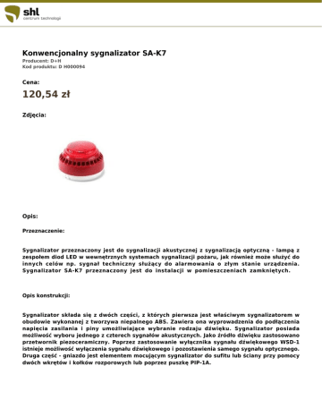 Konwencjonalny sygnalizator SA-K7 Producent: D+H Kod produktu: D H000094 Cena: 120,54 zł Zdjęcia: Opis: Przeznaczenie: Sygnalizator przeznaczony jest do sygnalizacji akustycznej z sygnalizacją optyczną - lampą z zespołem diod LED w wewnętrznych systemach sygnalizacji pożaru, jak również może służyć do innych celów np. sygnał techniczny służący do alarmowania o złym stanie urządzenia. Sygnalizator SA-K7 przeznaczony jest do instalacji w pomieszczeniach zamkniętych. Opis konstrukcji: Sygnalizator składa się z dwóch części, z których pierwsza jest właściwym sygnalizatorem w obudowie wykonanej z tworzywa niepalnego ABS. Zawiera ona wyprowadzenia do podłączenia napięcia zasilania i piny umożliwiające wybranie rodzaju dźwięku. Sygnalizator posiada możliwość wyboru jednego z czterech sygnałów akustycznych. Jako źródło dźwięku zastosowano przetwornik piezoceramiczny. Poprzez zastosowanie wyłącznika sygnału dźwiękowego WSD-1 istnieje możliwość wyłączenia sygnału dźwiękowego i pozostawienia samego sygnału optycznego. Druga część - gniazdo jest elementem mocującym sygnalizator do sufitu lub ściany przy pomocy dwóch wkrętów i kołków rozporowych lub poprzez puszkę PIP-1A.