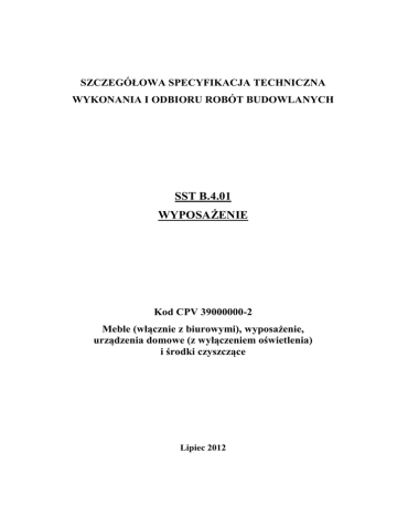 SZCZEGÓŁOWA SPECYFIKACJA TECHNICZNA WYKONANIA I ODBIORU ROBÓT BUDOWLANYCH SST B.4.01 WYPOSAŻENIE Kod CPV 39000000-2 Meble (włącznie z biurowymi), wyposażenie, urządzenia domowe (z wyłączeniem oświetlenia) i środki czyszczące Lipiec 2012 Przebudowa ośrodka szkoleniowo-sportowego WAT SST B.4.01 SPIS TREŚCI SZCZEGÓŁOWE SPECYFIKACJE TECHNICZNE ........................................................................................ 171 1. WSTĘP ........................................................................................................................................................... 172 1.1. 1.2. 1.3. 1.4. 1.5. 2. PRZEDMIOT SST ..................................................................................................................................... 172 ZAKRES STOSOWANIA SST ..................................................................................................................... 172 OKREŚLENIA PODSTAWOWE ................................................................................................................... 172 ZAKRES ROBÓT OBJĘTYCH SST .............................................................................................................. 172 OGÓLNE WYMAGANIA DOTYCZĄCE ROBÓT ............................................................................................. 173 MATERIAŁY ................................................................................................................................................ 173 2.1. 2.2. WYMAGANIA OGÓLNE ............................................................................................................................ 173 MATERIAŁY POTRZEBNE DO WYKONANIA ROBÓT ................................................................................... 173 3. SPRZĘT ......................................................................................................................................................... 173 4. TRANSPORT ................................................................................................................................................ 174 4.1. 4.2. 4.3. 5. WYKONANIE ROBÓT. ............................................................................................................................... 174 5.1. 6. WYMAGANIA OGÓLNE ............................................................................................................................ 174 TRANSPORT MATERIAŁÓW ...................................................................................................................... 174 PAKOWANIE I MAGAZYNOWANIE MATERIAŁÓW METALOWYCH .............................................................. 174 WYMAGANIA OGÓLNE ............................................................................................................................ 174 KONTROLA JAKOŚCI ROBÓT ................................................................................................................ 175 6.1. 6.2. WYMAGANIA OGÓLNE ............................................................................................................................ 175 KONTROLA JAKOŚCI WYROBÓW.............................................................................................................. 175 7. OBMIAR ROBÓT ......................................................................................................................................... 175 8. ODBIÓR ROBÓT ......................................................................................................................................... 175 8.1. 8.2. WYMAGANIA OGÓLNE ............................................................................................................................ 175 ODBIÓR ELEMENTÓW PO MONTAŻU ........................................................................................................ 175 9. PODSTAWA PŁATNOŚCI .......................................................................................................................... 176 10. PRZEPISY ZWIĄZANE .............................................................................................................................. 176 Szczegółowa specyfikacja techniczna – Wyposażenie Strona 170 Przebudowa ośrodka szkoleniowo-sportowego WAT SST B.4.01 SZCZEGÓŁOWE SPECYFIKACJE TECHNICZNE wykonania i odbioru robót budowlanych SST B.1.00 ROBOTY PRZYGOTOWAWCZE SST B.1.01 Roboty rozbiórkowe SST B.2.00 ROBOTY ZWIĄZANE Z WYKONANIEM KONSTRUKCJI OBIEKTU SST B.2.01 Podłoża i podkłady SST B.2.02 Roboty murowe SST B.2.03 Hydroizolacje SST B.2.04 Izolacje termiczne i akustyczne SST B.2.05 Pokrycia dachowe SST B.2.06 Obróbki blacharskie, rynny i rury spustowe SST B.2.07 Elewacja SST B.2.08 Rusztowania SST B.3.00 ROBOTY ZWIĄZANE Z WYKOŃCZENIEM OBIEKTU SST B.3.01 Tynki wewnętrzne SST B.3.02 Okładziny ceramiczne SST B.3.03 Posadzki ceramiczne SST B.3.04 Wykładziny podłogowe SST B.3.05 Posadzki przemysłowe SST B.3.06 Powłoki malarskie SST B.3.07 Stolarka i ślusarka SST B.3.08 Sufity podwieszane SST B.4.00 WYPOSAŻENIE SST B.4.01 Wyposażenie Szczegółowa specyfikacja techniczna – Wyposażenie Strona 171 Przebudowa ośrodka szkoleniowo-sportowego WAT SST B.4.01 1. WSTĘP 1.1. Przedmiot SST Przedmiotem niniejszej szczegółowej specyfikacji technicznej są wymagania dotyczące wykonania i odbioru robót polegających na montażu elementów wyposażenia w związku z przebudową ośrodka szkoleniowo-sportowego Wojskowej Akademii Technicznej im. Jarosława Dąbrowskiego przy ul. Kartezjusza w Warszawie, działka oznaczona numerem ewid. 322. Klasyfikacja wg Wspólnego Słownika Zamówień (CPV) Grupa Klasa Kategoria Opis Meble (włącznie z biurowymi), wyposażenie, urządzenia domowe (z wyłączeniem oświetlenia) i środki czyszczące 39000000-2 39100000-3 Meble. 39130000-2 Meble biurowe Wyposażenie domowe 39200000-4 39220000-0 Sprzęt kuchenny, artykuły gos