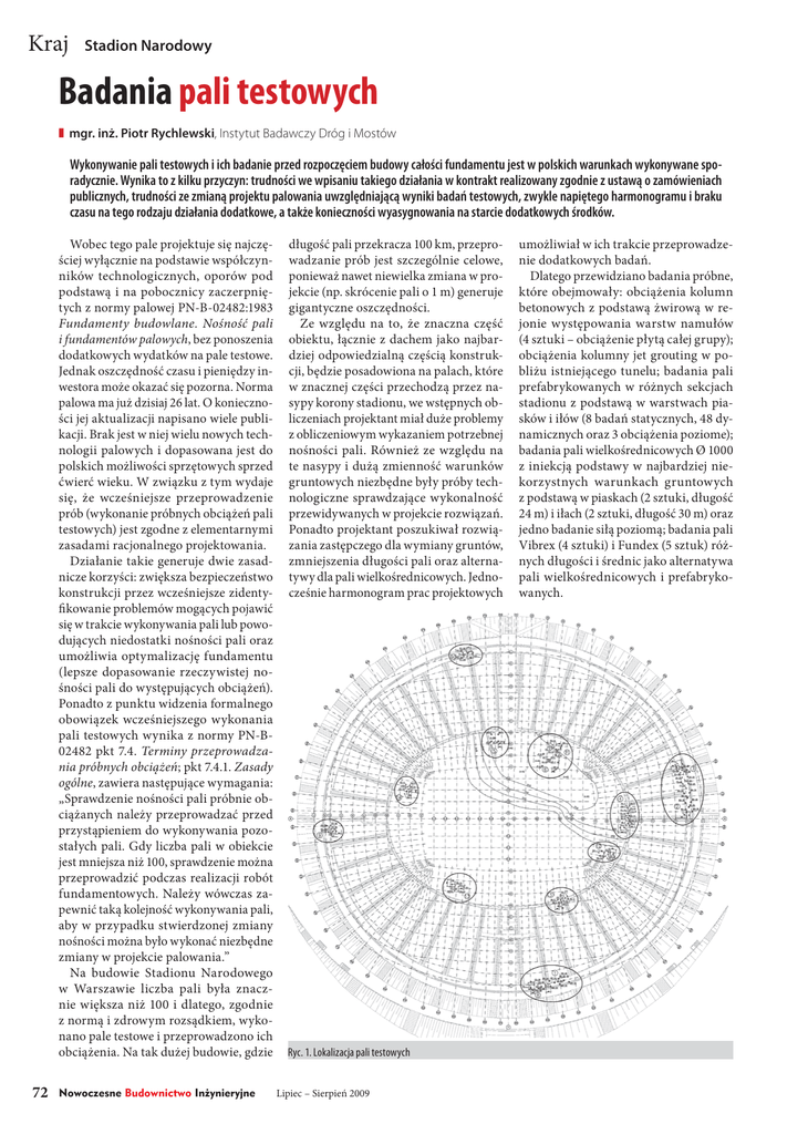 Kraj Stadion Narodowy Badania pali testowych ] mgr. inż. Piotr Rychlewski, Instytut Badawczy Dróg i Mostów Wykonywanie pali testowych i ich badanie przed rozpoczęciem budowy całości fundamentu jest w polskich warunkach wykonywane sporadycznie. Wynika to z kilku przyczyn: trudności we wpisaniu takiego działania w kontrakt realizowany zgodnie z ustawą o zamówieniach publicznych, trudności ze zmianą projektu palowania uwzględniającą wyniki badań testowych, zwykle napiętego harmonogramu i braku czasu na tego rodzaju działania dodatkowe, a także konieczności wyasygnowania na starcie dodatkowych środków. Wobec tego pale projektuje się najczęściej wyłącznie na podstawie współczynników technologicznych, oporów pod podstawą i na pobocznicy zaczerpniętych z normy palowej PN-B-02482:1983 Fundamenty budowlane. Nośność pali i fundamentów palowych, bez ponoszenia dodatkowych wydatków na pale testowe. Jednak oszczędność czasu i pieniędzy inwestora może okazać się pozorna. Norma palowa ma już dzisiaj 26 lat. O konieczności jej aktualizacji napisano wiele publikacji. Brak jest w niej wielu nowych technologii palowych i dopasowana jest do polskich możliwości sprzętowych sprzed ćwierć wieku. W związku z tym wydaje się, że wcześniejsze przeprowadzenie prób (wykonanie próbnych obciążeń pali testowych) jest zgodne z elementarnymi zasadami racjonalnego projektowania. Działanie takie generuje dwie zasadnicze korzyści: zwiększa bezpieczeństwo konstrukcji przez wcześniejsze zidentyfi kowanie problemów mogących pojawić się w trakcie wykonywania pali lub powodujących niedostatki nośności pali oraz umożliwia optymalizację fundamentu (lepsze dopasowanie rzeczywistej nośności pali do występujących obciążeń). Ponadto z punktu widzenia formalnego obowiązek wcześniejszego wykonania pali testowych wynika z normy PN-B02482 pkt 7.4. Terminy przeprowadzania próbnych obciążeń; pkt 7.4.1. Zasady ogólne, zawiera następujące wymagania: „Sprawdzenie nośności pali próbnie obciążanych należy przeprowadzać przed przystąpieniem do wykonywania pozostałych pali. Gdy liczba pali w obiekcie jest mniejsza niż 100, sprawdzenie można przeprowadzić podczas realizacji robót fundamentowych. Należy wówczas zapewnić taką kolejność wykonywania pali, aby w przypadku stwierdzonej zmiany nośności można było wykonać niezbędne zmiany w projekcie palowania.” Na budowie Stadionu Narodowego w Warszawie liczba pali była znacznie większa niż 100 i dlatego, zgodnie z normą i zdrowym rozsądkiem, wykonano pale testowe i przeprowadzono ich obciążenia. Na tak dużej budowie, gdzie 72 Nowoczesne Budownictwo Inżynieryjne długość pali przekracza 100 km, przeprowadzanie prób jest szczególnie celowe, ponieważ nawet niewielka zmiana w projekcie (np. skrócenie pali o 1 m) generuje gigantyczne oszczędności. Ze względu na to, że znaczna część obiektu, łącznie z dachem jako najbardziej odpowiedzialną częścią konstrukcji, będzie posadowiona na palach, które w znacznej części przechodzą przez nasypy korony stadionu, we wstępnych obliczeniach projektant miał duże problemy z obliczeniowym wykazaniem potrzebnej nośności pali. Również ze względu na te nasypy i dużą zmienność warunków gruntowych niezbędne były próby technologiczne sprawdzające wykonalność przewidywanych w projekcie rozwiązań. Ponadto projektant poszukiwał rozwiązania zastępczego dla wymiany gruntów, zmniejszenia długości pali oraz alternatywy dla pali wielkośrednicowych. Jednocześnie harmonogram prac projektowych Ryc. 1. Lokalizacja pali testowych Lipiec – Sierpień 2009 umożliwiał w ich trakcie przeprowadzenie dodatkowych badań. Dlatego przewidziano badania próbne, które obejmowały: obciążenia kolumn betonowych z podstawą żwirową w rejonie występowania warstw namułów (4 sztuki – obciążenie płytą całej grupy); obciążenia kolumny jet grouting w pobliżu istniejącego tunelu; badania pali prefabrykowanych w różnych sekcjach stadionu z podstawą w warstwach piasków i iłów (8 badań statycznych, 48 dynamicznych oraz 3 obciążenia poziome); badania pali wielkośrednicowych Ø 1000 z iniekcją podstawy w najbardziej niekorzystnych warunkach gruntowych z podstawą w piaskach (2 sztuki, długość 24 m) i iłach (2 sztuki, długość 30 m) oraz jedno badanie siłą poziomą; badania pali Vibrex (4 sztuki) i Fundex (5 sztuk) różnych długości i średnic jako alternatywa pali wielkośrednicowych i prefabrykowanych. Stadion Narodowy Kraj Ryc. 3. Krzywa osiadanie – obciążenie pala Ø 1000 L = 30 m Ryc. 2. Jeden z przekrojów zawierający przykładowe stanowiska badawcze Lokalizacja pali testowych musiała spełniać dwa warunki. Po pierwsze, wykonane pale nie powinny kolidować z docelowym fundamentem, a po drugie, pale należało wykonać w różnych częściach stadionu, tak aby wykonane były w różnych warunkach gruntowych. Na rycinie 1 pokazano lokalizację stanowisk badawczych. Na rycinie 2 przedstawiono przykładowy schematyczny przekrój przez stanowiska badawcze. Pale różnych technologii wykonywane były generalnie w różnych miejscach. Jedynie stanowiska 2 i 7 znajdowały się bardzo blisko siebie i możliwe jest porównanie zachowania się różnych pali w podobnych warunkach gruntowych. Krzywe osiadań pali ze stanowisk 2 i 7 (rycina 2 – po prawej stronie na koronie stadionu) pokazano na rycinach 3–7. Próbne obciążenia i ich interpretacja przeprowadzane były przez wykonawców pali (firmy Aarsleff i Energopol Szczecin). W tablicy 1 podano wyniki próbnych obciążeń. Interpretacji wyników dokonano zgodnie z normą PN-B-02482:1983 na podstawie krzywej przemieszczenie – obciążenie. W pierwszej części tablicy znajdują się wyniki badań pionowych na wciskanie, a w drugiej obciążeń poziomych. Ryc. 4. Krzywa osiadanie – obciążenie pala Ø 1000 L = 24 m Tab. 1. Wyniki próbn