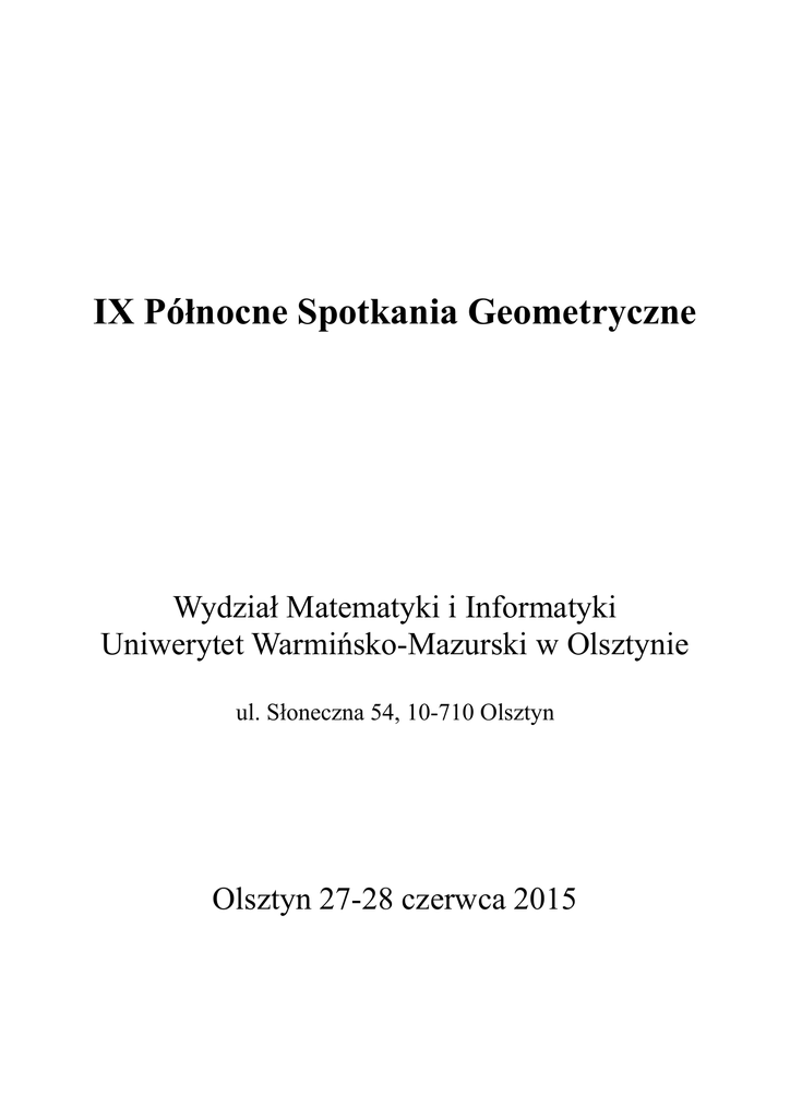 IX Północne Spotkania Geometryczne Wydział Matematyki i Informatyki Uniwerytet Warmińsko-Mazurski w Olsztynie ul. Słoneczna 54, 10-710 Olsztyn Olsztyn 27-28 czerwca 2015 Spis uczestników Imię i Nazwisko Afiliacja E-mail Bogdan Balcerzak Instytut Matematyki, Politechnika Łódzka [email protected] Edyta Bartnicka Wydział Matematyki i Informatyki, Uniwersytet Warmińsko-Mazurski w Olsztynie [email protected] Waldemar Cieślak Politechnika Lubelska [email protected] Adam Doliwa Wydział Matematyki i Informatyki, Uniwersytet Warmińsko-Mazurski w Olsztynie [email protected] Jan Jakóbowski Wydział Matematyki i Informatyki, Uniwersytet Warmińsko-Mazurski w Olsztynie [email protected] Sławomir Kapka Wydział Matematyki i Informatyki, Uniwersytet Łódzki [email protected] Anna Kaźmierczak Wydział Matematyki i Informatyki, Uniwersytet Łódzki [email protected] Jarosław Kosiorek Wydział Matematyki i Informatyki, Uniwersytet Warmińsko-Mazurski w Olsztynie [email protected] Mariusz Kwiatkowski Wydział Matematyki i Informatyki, Uniwersytet Warmińsko-Mazurski w Olsztynie [email protected] Andrzej Matraś Wydział Matematyki i Informatyki, Uniwersytet Warmińsko-Mazurski w Olsztynie [email protected] Witold Mozgawa Uniwersytet Marii CurieSkłodowskiej w Lublinie [email protected] Michał Musielak Instytut Matematyki i Fizyki, Uniwersytet TechnologicznoPrzyrodniczy im. Jana i Jędrzeja Śniadeckich w Bydgoszczy [email protected] Agnieszka Najberg Wydział Matematyki i Informatyki, Uniwersytet Łódzki [email protected] Monika Nowicka Instytut Matematyki i Fizyki, Uniwersytet TechnologicznoPrzyrodniczy im. Jana i Jędrzeja Śniadeckich w Bydgoszczy [email protected] Andriy Panasyuk Wydział Matematyki i Informatyki, Uniwersytet Warmińsko-Mazurski w Olsztynie [email protected] Imię i Nazwisko Afiliacja E-mail Mark Pankov Wydział Matematyki i Informatyki, Uniwersytet Warmińsko-Mazurski w Olsztynie [email protected] Krzysztof Petelczyc Wydział Matematyki i Informatyki, Uniwersytet w Białymstoku [email protected] Małgorzata Prażmowska Wydział Matematyki i Informatyki, Uniwersytet w Białymstoku [email protected] Krzysztof Prażmowski Wydział Matematyki i Informatyki, Uniwersytet w Białymstoku [email protected] Artur Siemaszko Wydział Matematyki i Informatyki, Uniwersytet Warmińsko-Mazurski w Olsztynie [email protected] Izabela Stępniak Wydział Matematyki i Informatyki, Uniwersytet Łódzki [email protected] Andrzej Szczepański Wydział Matematyki, Fizyki i Informatyki, Uniwersytet Gdański [email protected] Aleksy Tralle Wydział Matematyki i Informatyki, Uniwersytet Warmińsko-Mazurski w Olsztynie [email protected] Artur Woike Wydział Matematyki i Informatyki, Uniwersytet Warmińsko-Mazurski w Olsztynie [email protected] Łukasz Zielonka Instytut Matematyki i Fizyki, Uniwersytet TechnologicznoPrzyrodniczy im. Jana i Jędrzeja Śniadeckich w Bydgoszczy [email protected] Mariusz Żynel Wydział Matematyki i Informatyki, Uniwersytet w Białymstoku [email protected] Bogdan Balcerzak Instytut Matematyki, Politechnika Łódzka ul. Wólczańska 215, 90-924 Łódź [email protected] Egzotyczne klasy charakterystyczne dla algebroidów Liego Przedstawiona będzie konstrukcja egzotycznych klas charakterystycznych dla pewnych par rozszerzeń pseudoalgebr Liego oraz przykłady klas charakterystycznych dla modułów wyposażonych w niezdegenerowane odwzorowanie dwuliniowe. W szczególności omówione będą charakterystyczne klasy egzotyczne dla par algebroidów Liego oraz płaskiej koneksji. Edyta Bartnicka Wydział Matematyki i Informatyki, Uniwersytet Warmińsko-Mazurski w Olsztynie [email protected] Graf relacji połączalności wolnych podmodułów cyklicznych Niech R będzie pierścieniem skończonym łącznym z jedynką. Opisuję grafy relacji połączalności wolnych podmodułów cyklicznych R(a, b) generowanych przez pary dopuszczalne. Pokazuję, że są one spójne, regularne, a stopień wierzchołka jest równy rzędowi pierścienia R. Ponadto, przedstawiam graf jako sumę rozłączną klik maksymalnych i dowodzę, że grafy nieizomorficznych pierścieni lokalnych tego samego rzędu z taką samą strukturą ideałów maksymalnych są izomorficzne. Wynika to z faktu, że liczba elementów kliki maksymalnej w przypadku pierścieni lokalnych jest równa R/M + 1, gdzie M jest ideałem maksymalnym pierscienia R. Pozwala to scharakteryzować grafy dowolnych pierścieni przemiennych (także nielokalnych). Opisuję również własności grafów w przypadku, gdy R jest pierścieniem nielokalnym nieprzemiennym. Podaję charakterystykę grafów pewnych pierścieni o rzędach będących potęgami liczb pierwszych. Waldemar Cieślak Politechnika Lubelska [email protected] Twierdzenia typu Holditcha W 1858 roku H.Holditch opublikował następujące twierdzenie: Odcinek, którego oba końce leżą na danej zamkniętej krzywej wypukłej C , ślizga się po krzywej. Punkt P , który dzieli odcinek w stosunku a:b, wykreśla pewna krzywą C (P). Pole pierścienia ograniczonego przez C i C (P) wynosi π a b . W 1981 A.Broman uogólnił wynik Holditcha i podał pewne zastosowania tego twierdzenia. Podamy konstrukcję, istotnie różniącą się od konstrukcji Holditcha, która prowadzi do twierdzeń podobnych do wyniku Holditcha. Jedna z różnic między konstrukcją Holditcha a naszą polega na budowie rozważanego pierścienia. Pierścień rozpatrywany przez Holditcha leży we wnętrzu obszaru ograniczonego przez C , w przeciwieństwie do naszego pierścienia, który leży w zewnętrzu. Ponadto, podamy warunek, kiedy odcinek, którego końce leżą na C , może ślizgać się po C. Adam Doliwa Wydział Matematyki i Informatyki, Uniwersytet Warmińsko-Mazurski w Olsztynie [email protected] Odwzorowanie Yanga-Baxtera w zmiennych nieprzemiennych Przedstawimy rodzinę rozwiązań funkcyjnego równania Yanga-Baxtera w dowolnej liczbie zmiennych nieprzemiennych. Wersja przemienna tych odwzorowań 
