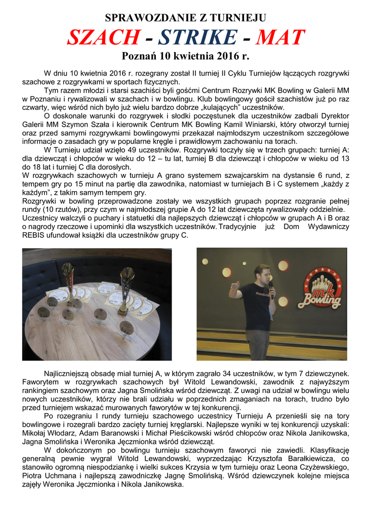 SPRAWOZDANIE Z TURNIEJU SZACH - STRIKE - MAT Poznań 10 kwietnia 2016 r. W dniu 10 kwietnia 2016 r. rozegrany został II turniej II Cyklu Turniejów łączących rozgrywki szachowe z rozgrywkami w sportach fizycznych. Tym razem młodzi i starsi szachiści byli gośćmi Centrum Rozrywki MK Bowling w Galerii MM w Poznaniu i rywalizowali w szachach i w bowlingu. Klub bowlingowy gościł szachistów już po raz czwarty, więc wśród nich było już wielu bardzo dobrze „kulających” uczestników. O doskonale warunki do rozgrywek i słodki poczęstunek dla uczestników zadbali Dyrektor Galerii MM Szymon Szała i kierownik Centrum MK Bowling Kamil Winiarski, który otworzył turniej oraz przed samymi rozgrywkami bowlingowymi przekazał najmłodszym uczestnikom szczegółowe informacje o zasadach gry w popularne kręgle i prawidłowym zachowaniu na torach. W Turnieju udział wzięło 49 uczestników. Rozgrywki toczyły się w trzech grupach: turniej A: dla dziewcząt i chłopców w wieku do 12 – tu lat, turniej B dla dziewcząt i chłopców w wieku od 13 do 18 lat i turniej C dla dorosłych. W rozgrywkach szachowych w turnieju A grano systemem szwajcarskim na dystansie 6 rund, z tempem gry po 15 minut na partię dla zawodnika, natomiast w turniejach B i C systemem „każdy z każdym”, z takim samym tempem gry. Rozgrywki w bowling przeprowadzone zostały we wszystkich grupach poprzez rozgranie pełnej rundy (10 rzutów), przy czym w najmłodszej grupie A do 12 lat dziewczęta rywalizowały oddzielnie. Uczestnicy walczyli o puchary i statuetki dla najlepszych dziewcząt i chłopców w grupach A i B oraz o nagrody rzeczowe i upominki dla wszystkich uczestników. Tradycyjnie już Dom Wydawniczy REBIS ufundował książki dla uczestników grupy C. Najliczniejszą obsadę miał turniej A, w którym zagrało 34 uczestników, w tym 7 dziewczynek. Faworytem w rozgrywkach szachowych był Witold Lewandowski, zawodnik z najwyższym rankingiem szachowym oraz Jagna Smolińska wśród dziewcząt. Z uwagi na udział w bowlingu wielu nowych uczestników, którzy nie brali udziału w poprzednich zmaganiach na torach, trudno było przed turniejem wskazać murowanych faworytów w tej konkurencji. Po rozegraniu I rundy turnieju szachowego uczestnicy Turnieju A przenieśli się na tory bowlingowe i rozegrali bardzo zacięty turniej kręglarski. Najlepsze wyniki w tej konkurencji uzyskali: Mikołaj Włodarz, Adam Baranowski i Michał Pieścikowski wśród chłopców oraz Nikola Janikowska, Jagna Smolińska i Weronika Jęczmionka wśród dziewcząt. W dokończonym po bowlingu turnieju szachowym faworyci nie zawiedli. Klasyfikację generalną pewnie wygrał Witold Lewandowski, wyprzedzając Krzysztofa Barałkiewicza, co stanowiło ogromną niespodziankę i wielki sukces Krzysia w tym turnieju oraz Leona Czyżewskiego, Piotra Uchmana i najlepszą zawodniczkę Jagnę Smolińską. Wśród dziewczynek kolejne miejsca zajęły Weronika Jęczmionka i Nikola Janikowska. W klasyfikacji końcowej wśród chłopców zdecydowanie I miejsce zajął Witold Lewandowski zdobywając 1060 pkt., przed Adamem Baranowskim i Mikołajem Włodarzem. W klasyfikacji dziewcząt wygrała pewnie Jagna Smolińska zdobywając 1025 pkt przed Weroniką Jęczmionką i Nikolą Janikowską. Witold i Jagna prowadzą w klasyfikacji generalnej w tej grupie po II turniejach Cyklu. W Turnieju B udział wzięło 7 uczestników, w tym 2 zawodniczki. Tym razem nie było zdecydowanego faworyta. W trakcie rozgrywek szachowych okazało się jednak, że w tym dniu doskonałą formą wykazała się Majka Andrzejewska wygrywając wszystkie partie szachowe, a w trudnym turnieju bowlingowym zajęła II miejsce, przegrywając tylko nieznacznie z najlepszym w tej konkurencji Mateuszem Dokowiczem. Pozwoliło to Majce wygrać klasyfikację generalną turnieju zdobywając 1170 pkt i wyprzedzając Mateusza Dokowicza i Macieja Gamalczyka. Dla Majki ten sukces to kolejny dobry wynik i prowadzenie w klasyfikacji łącznej tej grupy po II turniejach Cyklu. Turniej C zgromadził na starcie 8 uczestników. Zdecydowanym faworytem w rozgrywkach bowlingowych był Piotr Smoliński, jednak trudno było przewidzieć jak ułoży się klasyfikacja generalna, gdyż nieznane były umiejętności kręglarskie faworyta turnieju szachowego Wladimira Rogos z Ukrainy. Obaj faworyci pewnie wygrali swoje konkurencja, ale dzięki lepszej postawie Piotra Smolińskiego w szachach niż Wladimira w bowlingu, klasyfikację generalną wygrał ten pierwszy zdobywając 1140 i wyprzedzając Wladimira Rogos i Mateusza Pieścikowskiego. Jedyna zawodniczka Joanna Dokowicz z wynikiem 1005 pkt. zajęła wysokie IV miejsce. Piotr Smoliński prowadzi zdecydowanie w klasyfikacji generalnej tej grupy po II turniejach Cyklu. Turniej sędziowali: Hanna, Marcin i Marek Zboroń. Marek Zboroń /-/ Kierownik i Sędzia Główny Turnieju