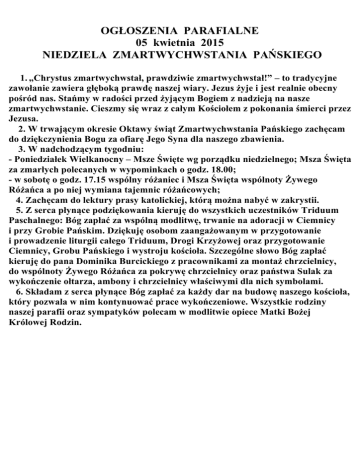 OGŁOSZENIA PARAFIALNE 05 kwietnia 2015 NIEDZIELA ZMARTWYCHWSTANIA PAŃSKIEGO 1. „Chrystus zmartwychwstał, prawdziwie zmartwychwstał!” – to tradycyjne zawołanie zawiera głęboką prawdę naszej wiary. Jezus żyje i jest realnie obecny pośród nas. Stańmy w radości przed żyjącym Bogiem z nadzieją na nasze zmartwychwstanie. Cieszmy się wraz z całym Kościołem z pokonania śmierci przez Jezusa. 2. W trwającym okresie Oktawy świąt Zmartwychwstania Pańskiego zachęcam do dziękczynienia Bogu za ofiarę Jego Syna dla naszego zbawienia. 3. W nadchodzącym tygodniu: - Poniedziałek Wielkanocny – Msze Święte wg porządku niedzielnego; Msza Święta za zmarłych polecanych w wypominkach o godz. 18.00; - w sobotę o godz. 17.15 wspólny różaniec i Msza Święta wspólnoty Żywego Różańca a po niej wymiana tajemnic różańcowych; 4. Zachęcam do lektury prasy katolickiej, którą można nabyć w zakrystii. 5. Z serca płynące podziękowania kieruję do wszystkich uczestników Triduum Paschalnego: Bóg zapłać za wspólną modlitwę, trwanie na adoracji w Ciemnicy i przy Grobie Pańskim. Dziękuję osobom zaangażowanym w przygotowanie i prowadzenie liturgii całego Triduum, Drogi Krzyżowej oraz przygotowanie Ciemnicy, Grobu Pańskiego i wystroju kościoła. Szczególne słowo Bóg zapłać kieruję do pana Dominika Burcickiego z pracownikami za montaż chrzcielnicy, do wspólnoty Żywego Różańca za pokrywę chrzcielnicy oraz państwa Sulak za wykończenie ołtarza, ambony i chrzcielnicy właściwymi dla nich symbolami. 6. Składam z serca płynące Bóg zapłać za każdy dar na budowę naszego kościoła, który pozwala w nim kontynuować prace wykończeniowe. Wszystkie rodziny naszej parafii oraz sympatyków polecam w modlitwie opiece Matki Bożej Królowej Rodzin.