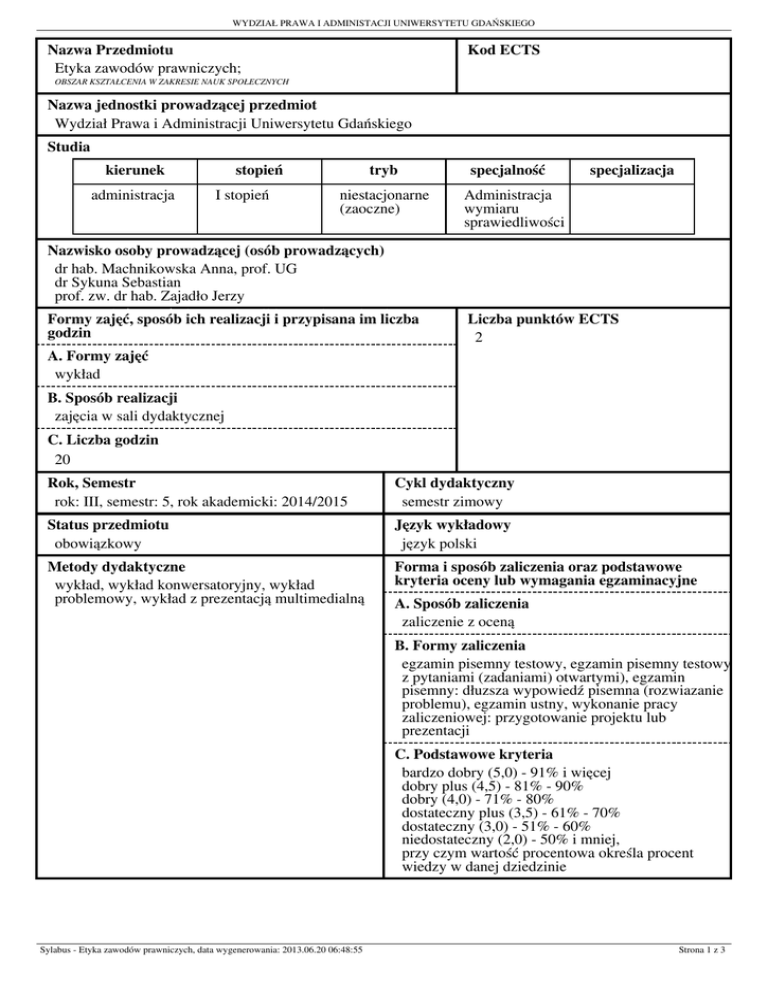 WYDZIAŁ PRAWA I ADMINISTACJI UNIWERSYTETU GDAŃSKIEGO Nazwa Przedmiotu Etyka Etyka zawodów zawodów prawniczych; prawniczych; Kod ECTS OBSZAR KSZTAŁCENIA W ZAKRESIE NAUK SPOŁECZNYCH Nazwa jednostki prowadzącej przedmiot Wydział Prawa i Administracji Uniwersytetu Gdańskiego Studia kierunek administracja administracja stopień II stopień stopień tryb niestacjonarne (zaoczne) niestacjonarne (zaoczne) Nazwisko osoby prowadzącej (osób prowadzących) dr hab. Machnikowska Anna, prof. UG dr Sykuna Sebastian prof. zw. dr hab. Zajadło Jerzy Formy godzin Formy zajęć, zajęć, sposób sposób ich ich realizacji realizacji ii przypisana przypisana im im liczba liczba godzin A. Formy zajęć wykład wykład specjalność Administracja wymiaru Administracja sprawiedliwości wymiaru sprawiedliwości specjalizacja Liczba punktów ECTS 2 B. Sposób realizacji zajęcia zajęcia w w sali sali dydaktycznej dydaktycznej C. Liczba godzin 20 20 Rok, Semestr rok: III, semestr: 5, rok akademicki: 2014/2015 Cykl dydaktyczny semestr zimowy Status przedmiotu obowiązkowy Język wykładowy język polski Metody dydaktyczne wykład, wykład konwersatoryjny, wykład problemowy, wykład z prezentacją multimedialną Forma i sposób zaliczenia oraz podstawowe kryteria oceny lub wymagania egzaminacyjne A. Sposób zaliczenia zaliczenie z oceną B. Formy zaliczenia egzamin pisemny testowy, egzamin pisemny testowy z pytaniami (zadaniami) otwartymi), egzamin pisemny: dłuzsza wypowiedź pisemna (rozwiazanie problemu), egzamin ustny, wykonanie pracy zaliczeniowej: przygotowanie projektu lub prezentacji C. Podstawowe kryteria bardzo dobry (5,0) - 91% i więcej dobry plus (4,5) - 81% - 90% dobry (4,0) - 71% - 80% dostateczny plus (3,5) - 61% - 70% dostateczny (3,0) - 51% - 60% niedostateczny (2,0) - 50% i mniej, przy czym wartość procentowa określa procent wiedzy w danej dziedzinie Sylabus - Etyka zawodów prawniczych, data wygenerowania: 2013.06.20 06:48:55 Strona 1 z 3 WYDZIAŁ PRAWA I ADMINISTACJI UNIWERSYTETU GDAŃSKIEGO Określenie przedmiotów wprowadzających wraz z wymogami wstępnymi A. Wymagania formalne brak B. Wymagania wstępne brak Cele przedmiotu Celem wykładu jest zapoznanie studentów z tematyką etyki prawniczej, w tym z zasadami deontologii oraz metodami rozwiązywania dylematów etycznych występujących w związku z wykonywaniem profesji prawniczych Treści programowe 1. Podstawowe pojęcia etyki i etyki prawniczej 2. Zagadnienia związane z deontologią zawodów prawniczych - pojęcia i zasady 3. Struktura organizacyjna korporacji prawniczych i zasady odpowiedzialności dyscyplinarnej 4. Ogólne zasady etyki prawniczej 5. Zasady etyki zawodów prawniczych: sędzia, prokurator, adwokat, radca prawny, notariusz, komornik 6. Zasady etyki powiązane z wykonywaniem zawodów prawniczych: zasady etyczne lobbystów, zasady etyczne w działalności gospodarczej, zasady etyczne doradców organów władz publicznych 7. Identyfikacja i zasady rozwiązywania dylematów etycznych w związku z wykonywaniem profesji prawniczych 8. Rozwiązywanie trudnych przypadków z zakresu etyki prawniczej i filozofii prawa 9. Normy prawne a normy etyczne - zasady wykladni 10. Relacje między prawem a moralnością Wykaz literatury A. Literatura wymagana do ostatecznego zaliczenia zajęć (zdania egzaminu): A.1. wykorzystywana podczas zajęć 1. P. Skuczyński, S. Sykuna (re), Leksykon etyki prawniczej. 100 podstawowych pojęć, CH Beck, Warszawa 2013 2. J. Zajadło (red), Fascynujące ścieżki filozofii prawa, LexisNexis, Warszawa 2006 3. H. Izdebski, P. Skuczyński (red), Etyka prawnicza. Etyka zawodów prawniczych, LexisNexis, Warszawa 2006 4. H. Izdebski, P. Skuczyński (red), Etyka prawnicza. Stanowiska i perspektywy, LexisNexis, Warszawa 2008 5. S. Wronkowska, Z. Ziembiński, Zarys teorii prawa, Poznań 2001 A.2. studiowana samodzielnie przez studenta 1. R. Tokarczyk, Etyka prawnicza, LexisNexis, Warszawa 2010 2. Z. Krzemiński, Etyka adwokacka. Teksty, orzecznictwo, komentarz, Zakamycze, Kraków 2003 B. Literatura uzupełniająca 1. E. Łojko (red), Etyka prawnika, etyka nauczyciela zawodu prawnika, Wyd. Uniwersytetu Warszawskiego, Warszawa 2006 2. R. Sarkowicz, Amerykańska etyka prawnicza, Zakamycze, Kraków 2004 3.P. Skuczyński, Status etyki prawniczej, LexisNexis, Warszawa 2010 4. R. Sarkowicz, O tzw. moralnym kryzysie profesji prawniczej [w:] Studia z filozofii prawa 2, J. Stelmach (red), Kraków 2003, s. 159-164 Sylabus - Etyka zawodów prawniczych, data wygenerowania: 2013.06.20 06:48:55 Strona 2 z 3 WYDZIAŁ PRAWA I ADMINISTACJI UNIWERSYTETU GDAŃSKIEGO Efekty uczenia się Wiedza Student ma: - rozszerzoną wiedzę o pojęciach i instytucjach występujących w etyce prawniczej, zna terminologię z zakresu etyki - pogłębioną wiedzę o etyce prawniczej w odniesieniu do specyfiki poszczególnych profesji prawniczych, w tym o obowiązujacych systemach norm prawnych i etycznych oraz o strukturach organizacyjnych sankcjonujących ich stosowanie - wiedzę o różnych rodzajach więzi społecznych funkcjonujących w obszarze etyki prawniczej i występujących między nimi prawidłowściach oraz o źródłach i naturze związanych z nimi zmian Umiejętności Student: -rozumie i potrafi prawidłowo interpretować zasady deontologii prawniczej, w tym wzajemne relacje między etyką prawniczą, a profesjonalizmem zawodu prawnika - posiada umięjętność integrowania wiedzy z zakresu etyki prawniczej z praktyką wykonywania zawodu prawnika - potrafi właściwie analizować przyczyny i przebieg sytuacji konfliktowych w pracy prawnika oraz poszukiwać i samodzielnie stosować efektywne rozwiązania, wykorzystując zasady etyki prawniczej - sprawnie i ze zrozumieniem posługuje się systemami normatywnymi z zakresu etyki prawniczej i etyki zawodów prawniczych Kompetencje społeczne (postawy) Student: - ma świadomość zakresu swojej wiedzy na temat etyki prawniczej oraz potrzeby jej ustawicznego poszerzania - ma o