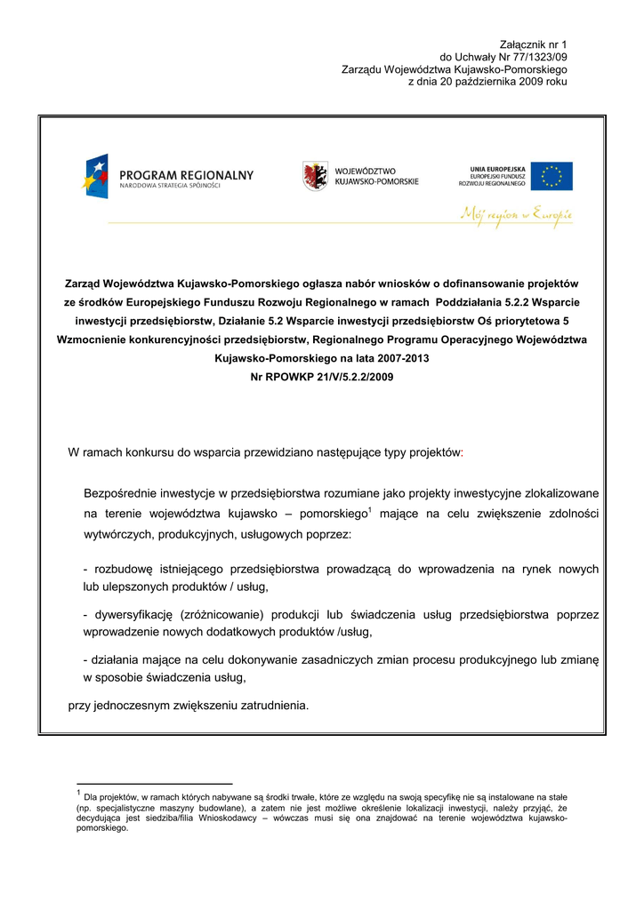 Załącznik nr 1 do Uchwały Nr 77/1323/09 Zarządu Województwa Kujawsko-Pomorskiego z dnia 20 października 2009 roku Zarząd Województwa Kujawsko-Pomorskiego ogłasza nabór wniosków o dofinansowanie projektów ze środków Europejskiego Funduszu Rozwoju Regionalnego w ramach Poddziałania 5.2.2 Wsparcie inwestycji przedsiębiorstw, Działanie 5.2 Wsparcie inwestycji przedsiębiorstw Oś priorytetowa 5 Wzmocnienie konkurencyjności przedsiębiorstw, Regionalnego Programu Operacyjnego Województwa Kujawsko-Pomorskiego na lata 2007-2013 Nr RPOWKP 21/V/5.2.2/2009 W ramach konkursu do wsparcia przewidziano następujące typy projektów: Bezpośrednie inwestycje w przedsiębiorstwa rozumiane jako projekty inwestycyjne zlokalizowane na terenie województwa kujawsko – pomorskiego1 mające na celu zwiększenie zdolności wytwórczych, produkcyjnych, usługowych poprzez: - rozbudowę istniejącego przedsiębiorstwa prowadzącą do wprowadzenia na rynek nowych lub ulepszonych produktów / usług, - dywersyfikację (zróŜnicowanie) produkcji lub świadczenia usług przedsiębiorstwa poprzez wprowadzenie nowych dodatkowych produktów /usług, - działania mające na celu dokonywanie zasadniczych zmian procesu produkcyjnego lub zmianę w sposobie świadczenia usług, przy jednoczesnym zwiększeniu zatrudnienia. 1 Dla projektów, w ramach których nabywane są środki trwałe, które ze względu na swoją specyfikę nie są instalowane na stałe (np. specjalistyczne maszyny budowlane), a zatem nie jest moŜliwe określenie lokalizacji inwestycji, naleŜy przyjąć, Ŝe decydująca jest siedziba/filia Wnioskodawcy – wówczas musi się ona znajdować na terenie województwa kujawskopomorskiego. Załącznik nr 1 do Uchwały Nr 77/1323/09 Zarządu Województwa Kujawsko-Pomorskiego z dnia 20 października 2009 roku O wsparcie mogą się ubiegać następujące typy beneficjentów: Mikroprzedsiębiorstwa, małe przedsiębiorstwa i średnie oraz duŜe przedsiębiorstwa mające siedzibę2 i prowadzące działalność na terenie województwa kujawsko - pomorskiego, działające min. 12 miesięcy, które planują realizację projektu w gminach, w których dotychczas nie udzielono wsparcia w ramach Działania 5.2. Wsparcie inwestycji przedsiębiorstw osi 5 RPO WK-P.3 Wielkość środków przewidziana do alokacji w ramach konkursu wynosi 4 274 864,47 EURO. Wielkość środków przewidziana do alokacji w PLN na dzień ogłoszenia naboru wynosi 18 012 141,44*. Maksymalny poziom dofinansowania projektów ze środków Regionalnego Programu Operacyjnego Województwa Kujawsko-Pomorskiego na lata 2007-2013 wynosi: − do 70% - mikroprzedsiębiorstwa − do 60% - małe przedsiębiorstwa − do 50% - średnie i duŜe przedsiębiorstwa. Minimalna wartość projektu dla mikroprzedsiębiorstw wynosi 500 tys. PLN, dla małych i średnich przedsiębiorstw 100 tys. PLN, dla duŜych przedsiębiorstw 500 tys. PLN. Maksymalna wartość projektu dla wyŜej wymienionych podmiotów wynosi 8 mln PLN. Wnioskodawca jest uprawniony do złoŜenia jednego wniosku o dofinansowanie w ramach danego konkursu. W przypadku bezpośredniego wsparcia dla duŜych przedsiębiorstw rozmiar inwestycji poniŜej 2 mln Euro, a efektem musi być jasna i znacząca korzyść dla regionu (regionalny charakter przedsięwzięcia). Konkurs ma charakter zamknięty bez preselekcji, o którym mowa w § 5 Trybu składania wniosków o dofinansowanie w ramach Regionalnego Programu Operacyjnego Województwa KujawskoPomorskiego na lata 2007-2013 dla Osi Priorytetowej 5 Wzmocnienie konkurencyjności przedsiębiorstw, Działania 5.2 Wsparcie inwestycji przedsiębiorstw, Poddziałania 5.2.2 Wsparcie inwestycji przedsiębiorstw. 2 3 Dopuszcza się posiadanie filii lub oddziału, jeśli wynika to z dokumentów rejestrowych W ramach edycji roku 2008 – konkursy nr RPOWKP 6/V/5.2.2/2008 oraz nr RPOWKP 4/V/5.2.1/2008. Wykaz gmin objętych wsparciem w ramach niniejszego konkursu określony jest w załączniku nr 2 do trybu składania wniosków o dofinansowanie. Załącznik nr 1 do Uchwały Nr 77/1323/09 Zarządu Województwa Kujawsko-Pomorskiego z dnia 20 października 2009 roku Wnioskodawca ma moŜliwość wyboru schematu pomocowego, na podstawie jednego ze wskazanych rozporządzeń: Rozporządzenie Ministra Rozwoju Regionalnego z dnia 11 października 2007 r. w sprawie udzielania regionalnej pomocy inwestycyjnej w ramach regionalnych programów operacyjnych (Dz.U. z 2007 r. Nr 193, poz. 1399 z późn. zm.); Rozporządzenie Ministra Rozwoju Regionalnego z dnia 2 października 2007 r. w sprawie udzielania pomocy de minimis w ramach regionalnych programów operacyjnych (Dz.U. z 2007 r. Nr 185, poz. 1317). Nabór wniosków o dofinansowanie projektu odbędzie sie w terminie od 15.01.2010 roku do 29.01.2010 roku, od poniedziałku do piątku w godzinach pracy urzędu, t.j. w poniedziałki, środy i czwartki od 7.30 do 15.30, we wtorki od 7.30 do 17.00, w piątki od 7.30 do 14.00. Wnioski, które wpłyną po terminie nie będą rozpatrywane. Miejscem składania wniosków jest Kancelaria Ogólna w Urzędzie Marszałkowskim Województwa Kujawsko-Pomorskiego w Toruniu, ul. Marii Skłodowskiej-Curie 73, pokój nr 112 a. Termin rozstrzygnięcia konkursu przewiduje się na lipiec 2010 roku. Wzór wniosku o dofinansowanie projektu, wzór umowy o dofinansowanie projektu oraz Tryb składania wniosków o dofinansowanie projektów w ramach Regionalnego Programu Operacyjnego Województwa Kujawsko-Pomorskiego na lata 2007-2013 dla Osi Priorytetowej 5 Wzmocnienie konkurencyjności przedsiębiorstw, Działania 5.2 Wsparcie inwestycji przedsiębiorstw, Poddziałania 5.2.2 Wsparcie inwestycji przedsiębiorstw, który określa zasady i formę składania wniosków zostały zamieszczone na stronie internetowej www.fundusze.kujawsko-pomorskie.pl oraz www.mojregion.eu. Instytucja Zarządzająca RPO dokona oceny i wyboru projektów w oparciu, o kryteria stanowiące załącznik nr V do Szczegółow
