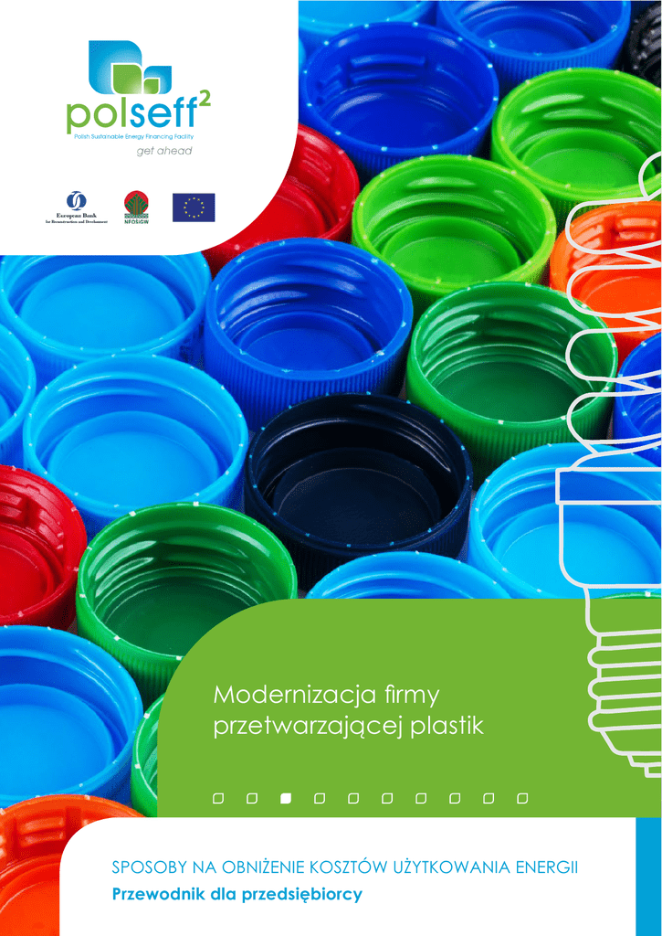 Modernizacja firmy przetwarzającej plastik SPOSOBY NA OBNIŻENIE KOSZTÓW UŻYTKOWANIA ENERGII Przewodnik dla przedsiębiorcy Poprawa efektywności energetycznej w przedsiębiorstwie z branży przetwórstwa tworzyw sztucznych Rosnące ceny energii sprawiają, że koszty związane z jej wykorzystaniem nabierają coraz większego znaczenia w strukturze kosztów operacyjnych polskich przedsiębiorstw. Na zmiany w podejściu do użytkowania energii w firmach ma również wpływ bardziej świadoma postawa społeczeństwa, które dostrzega negatywne zmiany w środowisku naturalnym. Projekty inwestycyjne zrealizowane przez polskich przedsiębiorców w ramach pierwszej edycji programu Celem niniejszej broszury jest przedstawienie potencjalnych obszarów w zakresie wymiany maszyn i modernizacji technologii w branży przetwórstwa tworzyw sztucznych oraz korzyści z tym związanych. Przedstawione informacje zostały opracowane w oparciu o faktycznie zrealizowane projekty w ramach programu PolSEFF. Poniższa infografika przedstawia typowe maszyny wykorzystywane przez przedsiębiorstwa z branży przetwórstwa tworzyw sztucznych, których wymiana na bardziej wydajne i energooszczędne przyniosła minimum 20% oszczędności energii. Wymiana jakiego typu urządzeń może dostarczyć największych korzyści? Wymiana 6 robotów wtryskarkowych na 6 wydajnych i energooszczędnych o zwiększonej wydajności łącznej 2 757 600 sztuk/rok PolSEFF w latach 2011–2014 pokazały, że branża przetwórstwa tworzyw sztucznych należy do najbardziej energochłonnych. W rezultacie projekty modernizacyjne przedsiębiorstw z tej branży przyniosły znaczące oszczędności energii sięgające 75%. Wymiana wtryskarki na nową, elektryczną o tej samej wydajności 180 ton/rok: Oszczędność: 45 000 zł rocznie Wymiana extrudera o wydajności 162 milionów sztuk rocznie na nowy, wydajny i energooszczędnego o wydajności 288 milionów sztuk/rok Oszczędność: 76 000 zł rocznie Oszczędność: 76 000 zł rocznie Wymiana wtryskarki na nową hydrauliczną z VSD o o tej samej wydajności 1800 ton/rok Wymiana wtryskarki na nową hydrauliczną z serwonapędem o tej samej wydajności 400 ton/rok: Oszczędność: 370 000 zł rocznie Oszczędność: 76 000 zł rocznie Kiedy modernizacja technologii w branży przetwórstwa tworzyw sztucznych może być najbardziej opłacalna? Zrealizowane w ramach programu PolSEFF inwestycje w modernizację maszyn i urządzeń pokazały, że znaczące dla przedsiębiorstwa oszczędności mogą Wymiana wydmuchiwarki o wydajności 92 300 ton/rok na nową o zwiększonej wydajności do 150 000 ton/rok Oszczędność: 423 600 zł rocznie być uzyskane w przypadku wymiany wyeksploatowanych i energochłonnych maszyn takich jak wtryskarki, wydmuchiwarki, czy extrudery. Wymiana tych urządzeń na nowoczesne, wydajne i energooszczędne, przyniosła nie tylko znaczące oszczędności energii, ale również umożliwiła zwiększenie mocy produkcyjnych, skrócenie czasu poszczególnych operacji w procesie produkcyjnym oraz poprawę jakości wytwarzanych wyrobów. Przykładowe projekty modernizacyjne technologii w przedsiębiorstwach przetwarzających tworzywa sztuczne: Informacje dodatkowe Koszt (zł) Oszczędność energii Obszar inwestycji Elementy inwestycji Wymiana wtryskarki hydraulicznej o wydajności 180 ton/rok Zakup i instalacja nowej wtryskarki elektrycznej o wydajności 180 ton/rok Wtryskarki elektryczne charakteryzują się efektywnością energetyczną ze względu na zastosowanie indywidualnych napędów dla poszczególnych operacji w procesie wtryskowym, dopasowanych do potrzeb pod względem mocy i wykorzystywanych tylko w momencie wykonywania danej operacji w procesie. 300 000 62% Wymiana wtryskarki hydraulicznej o wydajności 400 ton/rok Zakup i instalacja nowej wtryskarki z serwonapędem o wydajności 400 ton/rok Wtryskarki hydrauliczne z serwonapędem charakteryzują się efektywnością energetyczną ze względu na zastosowanie napędu wykorzystywanego tylko w momencie wykonywania danej operacji w procesie. 600 000 58% Wymiana wtryskarki hydraulicznej o wydajności 1800 ton/rok Zakup i instalacja nowej wtryskarki hydraulicznej z VSD o wydajności 1800 ton/rok Wtryskarki z VSD charakteryzują się efektywnością energetyczną ze względu na dopasowanie mocy napędu do potrzeb dla poszczególnych operacji w procesie wtryskowym. 1 600 000 54% Wymiana 6 robotów wtryskarkowych o wydajności łącznej 2 376 000 sztuk/rok Zakup i instalacja 6 wydajnych i energooszczędnych robotów wtryskarkowych o wydajności łącznej 2 757 600 sztuk/rok Wprowadzenie do procesu produkcyjnego nowych robotów spowoduje istotne skrócenie czasu pojedynczego cyklu roboczego, przy równoczesnym zmniejszeniu zapotrzebowania na energię dla poszczególnych operacji wykonywanych przez roboty, spowoduje znaczące ograniczenie zużycia energii elektrycznej. 705 000 75% Wymiana wydmuchiwarki o wydajności 92 300 ton/rok Zakup i instalacja wydmuchiwarki o wydajności 150 000 ton/rok Maszyna z roku 1993 była już mocno wyeksploatowana, co powodowało duże zużycie energii oraz pogarszającą się jakość wytwarzanych elementów. 5 060 000 42% Wymiana extrudera o wydajności 162 000 000 sztuk/rok Zakup i instalacja wydajnego i energooszczędnego extrudera o wydajności 288 000 000 sztuk/rok Maszyny wytwarzały plastikowe słomki do picia. Eksploatacja 2 wyeksploatowanych urządzeń powodowała znaczne zużycie energii i pogarszającą się jakość produktu. Nowe maszyny spowodowały spadek zużycia energii, lepszą jakość produktu oraz były wyposażone w dodatkową funkcję pakowania słomek w papierowe opakowanie. 246 450 42% Finansowanie inwestycji w modernizację urządzeń i technologii w branży przetwórstwa tworzyw sztucznych. Inwestycje w wymianę maszyn i urządzeń realizowane przez małe i średnie przedsiębiorstwa są objęte finansowaniem w ramach programu PolSEFF2. W przypadku tych inwestycji przed