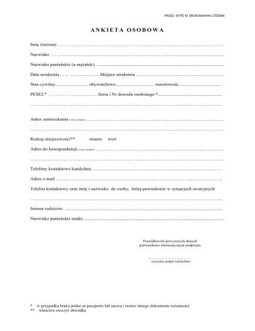 PROSZ WYPE NI DRUKOWANYMI LITERAMI ANKIETA OSOBOWA Imię (imiona) ……………………………………………………………………………………………. Nazwisko . . . ………………………….………………………………………………………………… Nazwisko panieńskie (u mężatek): ............................................................................................................ Data urodzenia . . . . ………………..Miejsce urodzenia ……………………………………………….. Stan cywilny:........................... obywatelstwo................................. narodowość..................................... PESEL* . . . . . . . . . ………………Seria i Nr dowodu osobistego *...................................................... ………………………………………………………………………………………………………….. Adres zamieszkania (wraz z kodem) ……………………………………..…………………………………….. ……………………………………………………………………………………..……….……………. Rodzaj miejscowości** miasto wieś Adres do korespondencji (wraz z kodem) …………………………………………………….………………... ………………………………………………………………………………………….………………... Telefony kontaktowe kandydata …………………………………………………….……..…………… Adres e-mail …………………………………………………………………………...……………….. Telefon kontaktowy oraz imię i nazwisko do osoby, którą powiadomić w sytuacjach awaryjnych …………..…….…………………………………………………………………………………….…... Imiona rodziców: ...................................................................................................................................... Nazwisko panieńskie matki: ...................................................................................................................... Prawidłowość powyższych danych potwierdzam własnoręcznym podpisem …………………………… (czytelny podpis kandydata) * w przypadku braku podać nr paszportu lub nazwę i numer innego dokumentu tożsamości ** właściwe otoczyć obwódką