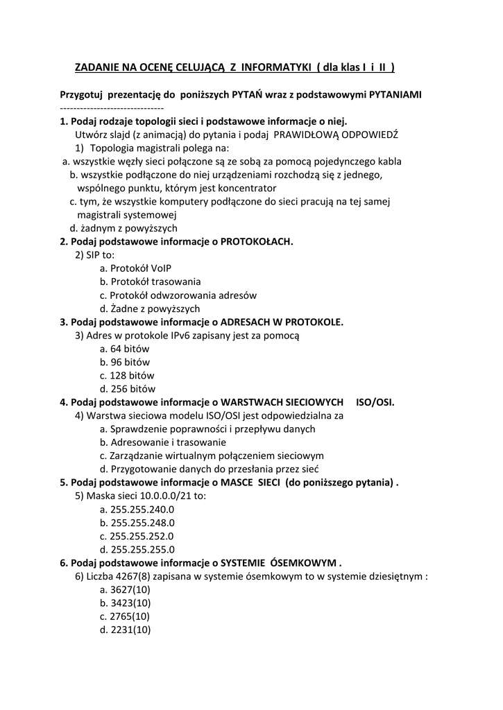 ZADANIE NA OCENĘ CELUJĄCĄ Z INFORMATYKI ( dla klas I i II ) Przygotuj prezentację do poniższych PYTAO wraz z podstawowymi PYTANIAMI ------------------------------1. Podaj rodzaje topologii sieci i podstawowe informacje o niej. Utwórz slajd (z animacją) do pytania i podaj PRAWIDŁOWĄ ODPOWIEDŹ 1) Topologia magistrali polega na: a. wszystkie węzły sieci połączone są ze sobą za pomocą pojedynczego kabla b. wszystkie podłączone do niej urządzeniami rozchodzą się z jednego, wspólnego punktu, którym jest koncentrator c. tym, że wszystkie komputery podłączone do sieci pracują na tej samej magistrali systemowej d. żadnym z powyższych 2. Podaj podstawowe informacje o PROTOKOŁACH. 2) SIP to: a. Protokół VoIP b. Protokół trasowania c. Protokół odwzorowania adresów d. Żadne z powyższych 3. Podaj podstawowe informacje o ADRESACH W PROTOKOLE. 3) Adres w protokole IPv6 zapisany jest za pomocą a. 64 bitów b. 96 bitów c. 128 bitów d. 256 bitów 4. Podaj podstawowe informacje o WARSTWACH SIECIOWYCH ISO/OSI. 4) Warstwa sieciowa modelu ISO/OSI jest odpowiedzialna za a. Sprawdzenie poprawności i przepływu danych b. Adresowanie i trasowanie c. Zarządzanie wirtualnym połączeniem sieciowym d. Przygotowanie danych do przesłania przez sied 5. Podaj podstawowe informacje o MASCE SIECI (do poniższego pytania) . 5) Maska sieci 10.0.0.0/21 to: a. 255.255.240.0 b. 255.255.248.0 c. 255.255.252.0 d. 255.255.255.0 6. Podaj podstawowe informacje o SYSTEMIE ÓSEMKOWYM . 6) Liczba 4267(8) zapisana w systemie ósemkowym to w systemie dziesiętnym : a. 3627(10) b. 3423(10) c. 2765(10) d. 2231(10) Pytania dla szkół ponadgimnazjalnych -----------------------------------Odpowiedź jedna z czterech 1) Protokół FTPES służy do: a. Pracy na konsoli zdalnego systemu operacyjnego b. Uwierzytelniania użytkowników serwera dostępowego c. Szyfrowanego transferu plików d. Szyfrowanego transferu poczty elektronicznej 2) CIDR to: a. Bezklasowe routowanie pomiędzy domenami b. Semantyczne wyszukiwanie danych w Internecie c. Centrum dystrybucji informacji regionalnej d. Protokół transmisji danych w sieciach Frame Relay 3) Jaki typ modulacji przewiduje standard IEEE 802.11n: a. FHSS,DSSS,IR b. OFDM c. HR-DSSS,CCK,OFDM d. HR-DSSS,CCK 4) Wykrywanie błędów w przesyłanych ramkach realizowane jest w następującej warstwie modelu ISO/OSI a. Transportowej b. Łącza danych c. Fizycznej d. Sieciowej 5) Ile maksymalnie adresów można przydzielid dla hostów w sieci 10.0.0.0/21 a. 1023 b. 1022 c. 2047 d. 2046 6) Wynik operacji 11725(10) XOR 12435(8) to: a. 38D0(16) b. 1710(16) c. 8350(16) d. 4820(16)