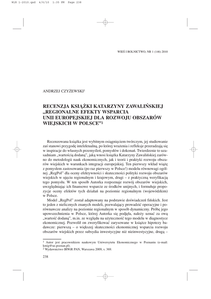 WiR 1-2010.qxd 4/6/10 1:35 PM Page 238 WIEŒ I ROLNICTWO, NR 1 (146) 2010 ANDRZEJ CZY¯EWSKI1 RECENZJA KSI¥¯KI KATARZYNY ZAWALIÑSKIEJ „REGIONALNE EFEKTY WSPARCIA UNII EUROPEJSKIEJ DLA ROZWOJU OBSZARÓW WIEJSKICH W POLSCE”2 Recenzowana ksi¹¿ka jest wybitnym osi¹gniêciem twórczym, jej studiowanie zaœ stanowi przygodê intelektualn¹, po której wra¿enia i refleksje przeradzaj¹ siê w inspiracje do w³asnych przemyœleñ, pomys³ów i dokonañ. Twierdzenie to uzasadniam „wartoœci¹ dodan¹”, jak¹ wnosi ksi¹¿ka Katarzyny Zawaliñskiej zarówno do metodologii nauk ekonomicznych, jak i teorii i praktyki rozwoju obszarów wiejskich w warunkach integracji europejskiej. Ten pierwszy wk³ad wi¹¿ê z pomys³em zastosowania (po raz pierwszy w Polsce!) modelu równowagi ogólnej „RegPol” dla oceny efektywnoœci i skutecznoœci polityki rozwoju obszarów wiejskich w ujêciu regionalnym i krajowym, drugi – z praktyczn¹ weryfikacj¹ tego pomys³u. W ten sposób Autorka rozpoznaje rozwój obszarów wiejskich, uwzglêdniaj¹c ich finansowe wsparcie ze œrodków unijnych, i formu³uje propozycje oceny efektów tych dzia³añ na poziomie regionalnym (wojewódzkim) w Polsce. Model „RegPol” zosta³ adaptowany na podstawie doœwiadczeñ fiñskich. Jest to jeden z nielicznych znanych modeli, pozwalaj¹cy prowadziæ operacyjne i porównawcze analizy na poziomie regionalnym w sposób dynamiczny. Próbê jego upowszechnienia w Polsce, której Autorka siê podjê³a, nale¿y uznaæ za ow¹ „wartoœæ dodan¹”, m.in. ze wzglêdu na u¿ytecznoœæ tego modelu w diagnostyce ekonomicznej. Pozwoli³ on zweryfikowaæ zarysowane w ksi¹¿ce hipotezy badawcze: pierwsz¹ – o wiêkszej skutecznoœci ekonomicznej wsparcia rozwoju obszarów wiejskich przez subsydia inwestycyjne ni¿ nieinwestycyjne, drug¹ – 1 Autor jest pracownikiem naukowym Uniwersytetu Ekonomicznego w Poznaniu (e-mail: [email protected]). 2 Wydawnictwo IRWiR PAN, Warszawa 2009, s. 369. 238 WiR 1-2010.qxd 4/6/10 1:35 PM Page 239 o efektach mno¿nikowych w innych sektorach gospodarczych wywo³anych wsparciem finansowym rozwoju obszarów wiejskich, trzeci¹ – o wzglêdnie najwiêkszych korzyœciach, które zyskuj¹ regiony najbardziej wiejskie, najsilniej uzale¿nione od rolnictwa. Praktyczne zastosowanie modelu „RegPol” poprzedza wszechstronna analiza przes³anek jego zastosowania jako modelu regionalnej równowagi ogólnej, z ocen¹ jego adekwatnoœci i wiarygodnoœci, a tak¿e jego bazy danych oraz teoretycznej struktury. Tworz¹ j¹: produkcja, popyt koñcowy, handel krajowy i zagraniczny, ceny, bezrobocie, migracje netto oraz zmienne makroekonomiczne mi.in. produkt krajowy, konsumpcja prywatna i publiczna, inwestycje, wynagrodzenia i pracy, ziemi, kapita³u, a tak¿e podatki, inflacja i inne cechy (oko³o 80). Przedstawiana struktura modelu pozwala okreœliæ warunki zrównowa¿enia rynku, tzw. domkniêcia modelu, wed³ug województw, a w konsekwencji scenariusze symulacyjne dla polityki rozwoju obszarów wiejskich. Nale¿y podkreœliæ olbrzymi¹ pracoch³onnoœæ wykonanych badañ. Dla ich przeprowadzenia zosta³o wykonanych 16 regionalnych tabel przep³ywów miêdzyga³êziowych i tyle¿ odpowiadaj¹cych im macierzy rachunków spo³ecznych. Fakt ten podkreœla unikatowoœæ i oryginalnoœæ recenzowanej pracy, jak te¿ uzyskanych wyników. Autorka, wykorzystuj¹c te tabele, okreœla i porównuje strukturê produkcji, popyt koñcowy, handel krajowy i zagraniczny oraz wp³yw cen w ujêciu regionalnym. Przeprowadza te¿ odpowiednie klasyfikacje województw za poœrednictwem skalowania, modeluje bezrobocie i migracje netto, uwzglêdniaj¹c uwarunkowania makroekonomiczne, a tak¿e zmienne egzogeniczne, takie jak wp³yw postêpu technicznego i zagranicy na rozwój obszarów wiejskich (ROW). Wyniki uwidacznia w aneksach bazuj¹cych na wspomnianych regionalnych tablicach przep³ywów miêdzyga³êziowych i macierzach rachunków spo³ecznych. W efekcie w ksi¹¿ce znajduj¹ siê unikatowe tabele, dotycz¹ce m.in. relacji funduszy rozwoju obszarów wiejskich (ROW) do PKB, wed³ug województw, ich ranking pod wzglêdem skutecznoœci polityki ROW, zmiany produktu regionalnego brutto pod wp³ywem dzia³añ ROW, w koñcu szacunki kosztów i korzyœci z polityki ROW w ujêciu regionalnym i inne równie ciekawe zestawienia. Oryginaln¹ tez¹ o istotnym ciê¿arze gatunkowym, która jest w ksi¹¿ce weryfikowana, jest twierdzenie, i¿ polityka rozwoju obszarów wiejskich w UE i w Polsce faworyzuje dzia³ania prorównoœciowe kosztem rozwi¹zañ proefektywnoœciowych. Abstrahuj¹c w tym miejscu od rozstrzygniêcia merytorycznego tej kwestii, nale¿y podkreœliæ, i¿ sam fakt podjêcia tego problemu jest ju¿ interesuj¹cy, gdy¿ dotyczy wa¿nej, acz kontrowersyjnej sprawy optimum relacji efektywnoœci ekonomicznej i adekwatnoœci spo³ecznej w polityce rozwoju obszarów wiejskich i rolnictwa. Donios³e i udowodnione w pracy jest stwierdzenie, i¿ wykorzystane fundusze unijne o charakterze proefektywnoœciowym i prorównoœciowym s¹ „doœæ zrównowa¿one” na poziomie krajowym, a ró¿nice uwidaczniaj¹ siê na poziomie województw (regionów), gdzie „przyznane koperty” faworyzowa³y s³abiej rozwiniête województwa. Autorka trafnie zauwa¿a, ¿e o absorpcji œrodków UE w stosunkowo niewielkim stopniu decydowa³y zasady 239 WiR 1-2010.qxd 4/6/10 1:35 PM Page 240 konkurencji miêdzy województwami (regionami), co potwierdza tezê, i¿ wspólna polityka rolna UE zawiera pierwotn¹ przes³ankê wyrównywania ró¿nic miêdzyregionalnych w poziomie rozwoju obszarów wiejskich, jako warunku ich dalszego zrównowa¿onego i zintegrowanego w skali ca³ej gospodarki rozwoju. To, co tak¿e ujmuje czytelnika, to trafne, precyzyjnie sformu³owane syntezy cz¹stkowe na koñcu ka¿dego rozdzia³u, wyodrêbnione w formie krótkich podrozdzia³ów b¹dŸ taksatywnych ocen. Mo¿na je nazwaæ „faktami stylizowanymi”. Wa¿ne