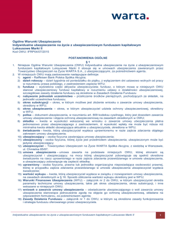 Ogólne Warunki Ubezpieczenia Indywidualne ubezpieczenie na życie z ubezpieczeniowym funduszem kapitałowym Luksusowe Marki II Kod OWU: IFRP04/07/2015 POSTANOWIENIA OGÓLNE §1 1. Niniejsze Ogólne Warunki Ubezpieczenia (OWU) Indywidualne ubezpieczenie na życie z ubezpieczeniowym funduszem kapitałowym Luksusowe Marki II stosuje się w umowach ubezpieczenia zawieranych przez Towarzystwo Ubezpieczeń na Życie WARTA S.A., z ubezpieczającymi, za pośrednictwem agenta. 2. W niniejszych OWU mają zastosowanie następujące definicje: 1) agent – Raiffeisen Bank Polska Spółka Akcyjna; 2) dzień roboczy – dzień tygodnia od poniedziałku do piątku, z wyłączeniem dni ustawowo wolnych od pracy w rozumieniu prawa polskiego, z zastrzeżeniem zapisów WFU; 3) fundusz – wydzielona część aktywów ubezpieczyciela; fundusz, o którym mowa w niniejszych OWU stanowi ubezpieczeniowy fundusz kapitałowy w rozumieniu ustawy o działalności ubezpieczeniowej, szczegółowe zasady działania funduszu są określone w Zasadach Działania Funduszu 4) nabywanie jednostek uczestnictwa – przeliczanie środków pieniężnych, pochodzących ze składek, na jednostki uczestnictwa funduszu; 5) okres subskrypcji – okres, w którym możliwe jest złożenie wniosku o zawarcie umowy ubezpieczenia, określony w WFU; 6) okres ubezpieczenia – okres, w którym ubezpieczyciel udziela ochrony ubezpieczeniowej, określony w WFU; 7) polisa – dokument ubezpieczenia, w rozumieniu art. 809 kodeksu cywilnego, który jest dowodem zawarcia umowy ubezpieczenia i objęcia ochroną ubezpieczeniową na zasadach określonych w OWU; 8) składka – kwota w wysokości wskazanej we wniosku o zawarcie umowy ubezpieczenia płatna jednorazowo przez ubezpieczającego z zastrzeżeniem, iż wysokość wpłaty nie może być niższa niż minimalna kwota składki obowiązująca aktualnie u ubezpieczyciela, określona w WFU; 9) świadczenie – kwota, którą ubezpieczyciel wypłaca uprawnionemu w razie zajścia zdarzenia objętego zakresem umowy ubezpieczenia; 10) ubezpieczający – osoba fizyczna zawierająca umowę ubezpieczenia; 11) ubezpieczony – osoba fizyczna, której życie jest przedmiotem ubezpieczenia; ubezpieczonym może być jedynie ubezpieczający; 12) ubezpieczyciel – Towarzystwo Ubezpieczeń na Życie WARTA Spółka Akcyjna, z siedzibą w Warszawie, ul. Chmielna 85/87; 13) umowa ubezpieczenia – umowa zawarta na podstawie niniejszych OWU, której stronami są ubezpieczyciel i ubezpieczający; na mocy której ubezpieczyciel zobowiązuje się spełnić określone świadczenie na rzecz uprawnionego w razie zajścia zdarzenia przewidzianego w umowie ubezpieczenia, a ubezpieczający zobowiązuje się zapłacić składkę; 14) uprawniony – osoba fizyczna, prawna lub jednostka organizacyjna nieposiadająca osobowości prawnej, której w przypadku zajścia zdarzenia przewidzianego w umowie ubezpieczenia ubezpieczyciel wypłaca świadczenie; 15) wartość wykupu – kwota, którą ubezpieczyciel wypłaca w związku z rozwiązaniem umowy ubezpieczenia, na zasadach określonych w § 16. Sposób obliczenia wartości wykupu określony jest w WFU; 16) Warunki Finansowe Ubezpieczenia (WFU) – załącznik nr 2 do OWU, w którym ubezpieczyciel określa parametry techniczne umowy ubezpieczenia, takie jak okres ubezpieczenia, okres subskrypcji, i inne wskazane w niniejszych OWU; 17) wniosek o zawarcie umowy ubezpieczenia – oświadczenie ubezpieczającego o woli zawarcia umowy ubezpieczenia stanowiące jednocześnie zgodę na objęcie go ochroną ubezpieczeniową, składane na odpowiednim formularzu, za pośrednictwem agenta; 18) Zasady Działania Funduszu – załącznik nr 1 do OWU, w którym są określone zasady funkcjonowania i strategia funduszu oferowanego przez ubezpieczyciela. Indywidualne ubezpieczenie na życie z ubezpieczeniowym funduszem kapitałowym Luksusowe Marki II 1 1. 2. 1. 2. 3. 4. 5. 6. 7. 8. 9. PRZEDMIOT I ZAKRES UBEZPIECZENIA §2 Przedmiotem ubezpieczenia jest życie ubezpieczonego. W ramach umowy ubezpieczenia, ubezpieczyciel udziela ochrony ubezpieczeniowej w zakresie: 1) zgonu ubezpieczonego, 2) dożycia przez ubezpieczonego do końca okresu ubezpieczenia. ZAWARCIE UMOWY UBEZPIECZENIA §3 Umowa ubezpieczenia zawierana jest na okres wskazany w WFU. Ubezpieczeniem może być objęta osoba, która w dniu rozpoczęcia okresu ubezpieczenia ukończyła 18 lat i nie ukończyła 80 lat. Umowa ubezpieczenia jest zawarta po spełnieniu łącznie poniższych warunków: 1) podpisanie wniosku przez ubezpieczającego i doręczenie go ubezpieczycielowi za pośrednictwem agenta 2) wpłata składki; 3) zaakceptowanie wniosku o zawarcie umowy ubezpieczenia przez ubezpieczyciela. Złożenie wniosku możliwe jest tylko w okresie subskrypcji. Możliwe jest złożenie kilku wniosków przez jedną osobę. Okres ubezpieczenia rozpoczyna się z dniem zawarcia umowy ubezpieczenia, z zastrzeżeniem ust. 8. Potwierdzeniem zawarcia umowy ubezpieczenia jest polisa wystawiana przez ubezpieczyciela w terminie 20 dni od pierwszego dnia okresu ubezpieczenia i wysyłana ubezpieczającemu. Odpowiedzialność ubezpieczyciela rozpoczyna się w pierwszym dniu okresu ubezpieczenia, wskazanego w WFU, z zastrzeżeniem ust. 8. Ubezpieczyciel ma prawo odwołać subskrypcję i zdecydować o nierozpoczęciu okresu ubezpieczenia do dnia poprzedzającego dzień rozpoczęcia okresu ubezpieczenia. W takim wypadku ubezpieczyciel informuje ubezpieczającego o swojej decyzji, umowa ubezpieczenia nie zostaje zawarta, okres ubezpieczenia nie rozpoczyna się, a składka wpłacona przez ubezpieczającego jest zwracana na rachunek bankowy wskazany we wniosku o zawarcie umowy ubezpieczenia, najpóźniej w dniu poprzedzającym dzień, w którym rozpocząłby się okres ubezpieczenia. Przed rozpoczęciem okresu ubezpieczenia ubezpieczający może zrezygnować z wniosku o zawarcie umowy ubezpieczenia składając u agenta formularz rezygnacji z zawarcia umow