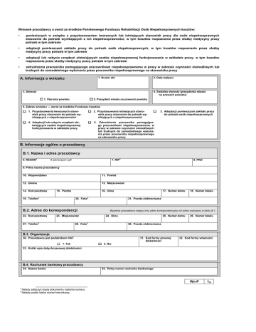 Wniosek pracodawcy o zwrot ze środków Państwowego Funduszu Rehabilitacji Osób Niepełnosprawnych kosztów: ▪ poniesionych w związku z przystosowaniem tworzonych lub istniejących stanowisk pracy dla osób niepełnosprawnych stosownie do potrzeb wynikających z ich niepełnosprawności, w tym kosztów rozpoznania przez służby medycyny pracy potrzeb w tym zakresie ▪ adaptacji pomieszczeń zakładu pracy do potrzeb osób niepełnosprawnych, w tym kosztów rozpoznania przez służby medycyny pracy potrzeb w tym zakresie ▪ adaptacji lub nabycia urządzeń ułatwiających osobie niepełnosprawnej funkcjonowanie w zakładzie pracy, w tym kosztów rozpoznania przez służby medycyny pracy potrzeb w tym zakresie ▪ zatrudnienia pracownika pomagającego pracownikowi niepełnosprawnemu w pracy w zakresie czynności niemożliwych lub trudnych do samodzielnego wykonania przez pracownika niepełnosprawnego na stanowisku pracy 2. Data wpływu 1. Numer akt A. Informacja o wniosku 3. Adresat 4. Siedziba starosty (prezydenta miasta na prawach powiatu) 1. Starosta powiatu 2. Prezydent miasta na prawach powiatu 5. Zakres wniosku — zwrot ze środków Funduszu kosztów 1. Przystosowania tworzonych stanowisk pracy stosownie do potrzeb wynikających z niepełnosprawności 2. Przystosowania istniejących stanowisk pracy stosownie do potrzeb wynikających z niepełnosprawności 4. Adaptacji lub nabycia urządzeń ułatwiających osobie niepełnosprawnej funkcjonowanie w zakładzie pracy 5. 3. Adaptacji pomieszczeń zakładu pracy do potrzeb osób niepełnosprawnych Zatrudnienia pracownika pomagającego pracownikowi niepełnosprawnemu w pracy w zakresie czynności niemożliwych lub trudnych do samodzielnego wykonania przez pracownika niepełnosprawnego na stanowisku pracy B. Informacje ogólne o pracodawcy B.1. Nazwa i adres pracodawcy 6. REGON1 7. NIP1 9 pierwszych cyfr 8. PKD 9. Pełna nazwa pracodawcy 10. Województwo 11. Powiat 12. Gmina 13. Miejscowość 14. Kod pocztowy 15. Poczta 19. Telefon2 16. Ulica 20. Faks2 B.2. Adres do korespondencji 22. Kod pocztowy 23. Miejscowość 27. Telefon2 17. Numer domu 18. Numer lokalu 21. Poczta elektroniczna Wypełnia pracodawca mający inny adres korespondencyjny niż adres wykazany w bloku B.1. 24. Ulica 28. Faks2 25. Numer domu 26. Numer lokalu 29. Poczta elektroniczna B.3. Organizacja 30. Pracodawca jest podatnikiem VAT 1. Tak 31. Kod formy prawnej działalności 32. Kod formy własności 2. Nie 33. Krótki opis dotychczasowej działalności B.4. Rachunek bankowy pracodawcy 34. Nazwa banku 35. Pełny numer rachunku bankowego , , Wn-P 1 2 Należy załączyć kopię dokumentu nadania numeru. Należy podać także numer kierunkowy. 1/6 B.5. Informacja o pomocy ze środków Funduszu 36. Pracodawca korzystał z pomocy ze środków Funduszu 1. Tak 2. Nie 39. Terminy uzyskania pomocy ze środków Funduszu 38. Wysokość refundacji 37. Liczba nowych stanowisk lub miejsc pracy utworzonych przy udziale środków Funduszu 40. Cele, na które była przeznaczana pomoc ze środków Funduszu B.6. Informacja o właścicielu, małżonku lub udziałowcach zakładu pracy 41. Dane dotyczące 3 42. Liczba udziałowców lub współwłaścicieli 1. Właściciela 2. Współwłaściciela 3. Udziałowca 4. Małżonka 44. Imię 43. Nazwisko 45. Seria i numer dowodu osobistego lub innego dokumentu potwierdzającego tożsamość 46. Dowód osobisty lub inny dokument potwierdzający tożsamość wydany przez 47. Stan cywilny4 48. Kod pocztowy 50. Ulica 51. Nr domu 49. Miejscowość 53. Telefon2 54. Faks2 C. Analiza finansowa 52. Nr lokalu 55. Miejsce zatrudnienia 5 C.1. Aktywa trwałe i obrotowe pracodawcy Rok poprzedzający ostatni rok obrotowy Bieżący rok Ostatni rok obrotowy 56. 57. 58. 59. 60. 61. 62. 63. 64. 65. 66. 67. Środki na rachunku bankowym 68. 69. 70. Należności od odbiorców 71. 72. 73. Inne (aktywa nieujęte powyżej) 74. 75. 76. 77. 78. 79. Grunty Budynki Pozostały rzeczowy majątek (trwały i obrotowy) Zapasy Razem C.2. Źródła finansowania aktywów trwałych i obrotowych pracodawcy Rok poprzedzający ostatni rok obrotowy Bieżący rok Ostatni rok obrotowy Kapitał własny 80. 81. 82. Zewnętrzne źródła finansowania 83. 84. 85. Zobowiązania wobec dostawców 86. 87. 88. 89. 90. 91. 92. 93. 94. 95. 96. 97. Kredyty Inne zobowiązania Razem Wn-P 3 4 5 2/6 Dotyczy działalności indywidualnej oraz spółek bez osobowości prawnej. Należy przygotować informacje o każdym udziałowcu wg danych z bloku B.6. Jeżeli istnieje współwłasność majątkowa, to należy odrębnie podać informacje o małżonku wg danych w bloku B.6. Należy dołączyć rachunek zysków i strat w układzie miesięcznym (średni miesiąc w roku) i rocznym. Przy sporządzaniu zestawienia rocznego należy uwzględnić sezonowość oraz przestoje w produkcji i w sprzedaży, jak również okres urlopów i inne wahania przychodów. Dane dotyczące aktywów trwałych i obrotowych pracodawcy i źródła ich finansowania oraz rachunku zysków i strat należy przedstawić w złotych za dwa lata poprzednie, a w przypadku pracodawcy działającego przez okres krótszy niż 2 lata – za okres 12 miesięcy i rok bieżący (na dzień złożenia wniosku), planowanej wielkości aktywów trwałych i obrotowych przy założeniu otrzymania zwrotu ze środków w okresie bieżącego roku. Przedsiębiorstwa państwowe, spółdzielnie, spółki z ograniczoną odpowiedzialnością, spółki akcyjne – składają sprawozdanie finansowe w rozumieniu przepisów ustawy o rachunkowości. C.3. Zaległe zobowiązania (długoterminowe) i kredyty bankowe 98. Zobowiązania budżetowe 99. Inne zobowiązania 100. Kwota kredytów bankowych 101. Nazwa banku D. Dane dotyczące przystosowania tworzonych lub istniejących stanowisk pracy dla osób niepełnosprawnych stosownie do potrzeb wynikających z ich niepełnosprawności D.1. Sprawozdanie ze stanu zatrudnienia za okres sześciu miesięcy przed wystąpieniem o zwrot
