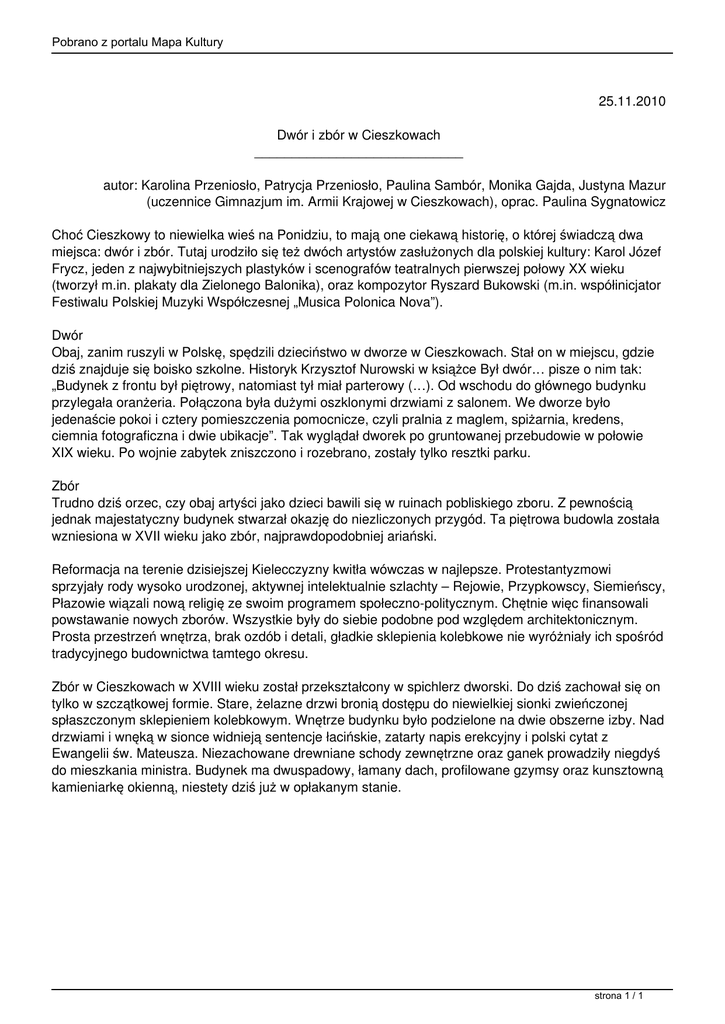 Pobrano z portalu Mapa Kultury 25.11.2010 Dwór i zbór w Cieszkowach ____________________________ autor: Karolina Przeniosło, Patrycja Przeniosło, Paulina Sambór, Monika Gajda, Justyna Mazur (uczennice Gimnazjum im. Armii Krajowej w Cieszkowach), oprac. Paulina Sygnatowicz Choć Cieszkowy to niewielka wieś na Ponidziu, to mają one ciekawą historię, o której świadczą dwa miejsca: dwór i zbór. Tutaj urodziło się też dwóch artystów zasłużonych dla polskiej kultury: Karol Józef Frycz, jeden z najwybitniejszych plastyków i scenografów teatralnych pierwszej połowy XX wieku (tworzył m.in. plakaty dla Zielonego Balonika), oraz kompozytor Ryszard Bukowski (m.in. współinicjator Festiwalu Polskiej Muzyki Współczesnej „Musica Polonica Nova”). Dwór Obaj, zanim ruszyli w Polskę, spędzili dzieciństwo w dworze w Cieszkowach. Stał on w miejscu, gdzie dziś znajduje się boisko szkolne. Historyk Krzysztof Nurowski w książce Był dwór… pisze o nim tak: „Budynek z frontu był piętrowy, natomiast tył miał parterowy (…). Od wschodu do głównego budynku przylegała oranżeria. Połączona była dużymi oszklonymi drzwiami z salonem. We dworze było jedenaście pokoi i cztery pomieszczenia pomocnicze, czyli pralnia z maglem, spiżarnia, kredens, ciemnia fotograficzna i dwie ubikacje”. Tak wyglądał dworek po gruntowanej przebudowie w połowie XIX wieku. Po wojnie zabytek zniszczono i rozebrano, zostały tylko resztki parku. Zbór Trudno dziś orzec, czy obaj artyści jako dzieci bawili się w ruinach pobliskiego zboru. Z pewnością jednak majestatyczny budynek stwarzał okazję do niezliczonych przygód. Ta piętrowa budowla została wzniesiona w XVII wieku jako zbór, najprawdopodobniej ariański. Reformacja na terenie dzisiejszej Kielecczyzny kwitła wówczas w najlepsze. Protestantyzmowi sprzyjały rody wysoko urodzonej, aktywnej intelektualnie szlachty – Rejowie, Przypkowscy, Siemieńscy, Płazowie wiązali nową religię ze swoim programem społeczno-politycznym. Chętnie więc finansowali powstawanie nowych zborów. Wszystkie były do siebie podobne pod względem architektonicznym. Prosta przestrzeń wnętrza, brak ozdób i detali, gładkie sklepienia kolebkowe nie wyróżniały ich spośród tradycyjnego budownictwa tamtego okresu. Zbór w Cieszkowach w XVIII wieku został przekształcony w spichlerz dworski. Do dziś zachował się on tylko w szczątkowej formie. Stare, żelazne drzwi bronią dostępu do niewielkiej sionki zwieńczonej spłaszczonym sklepieniem kolebkowym. Wnętrze budynku było podzielone na dwie obszerne izby. Nad drzwiami i wnęką w sionce widnieją sentencje łacińskie, zatarty napis erekcyjny i polski cytat z Ewangelii św. Mateusza. Niezachowane drewniane schody zewnętrzne oraz ganek prowadziły niegdyś do mieszkania ministra. Budynek ma dwuspadowy, łamany dach, profilowane gzymsy oraz kunsztowną kamieniarkę okienną, niestety dziś już w opłakanym stanie. strona 1 / 1