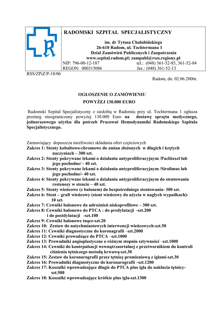 A. RADOMSKI SZPITAL SPECJALISTYCZNY im. dr Tytusa Chałubińskiego 26-610 Radom, ul. Tochtermana 1 Dział Zamówień Publicznych i Zaopatrzenia www.szpital.radom.pl; [email protected] NIP: 796-00-12-187 tel.: (048) 361-52-85, 361-52-84 REGON: 000315086 fax.: (048) 361-52-13 RSS/ZPiZ/P-18/06 Radom, dn. 02.06.2006r. OGŁOSZENIE O ZAMÓWIENIU POWYŻEJ 130.000 EURO Radomski Szpital Specjalistyczny z siedzibą w Radomiu przy ul. Tochtermana 1 ogłasza przetarg nieograniczony powyżej 130.000 Euro na dostawę sprzętu medycznego, jednorazowego użytku dla potrzeb Pracowni Hemodynamiki Radomskiego Szpitala Specjalistycznego. Zamawiający dopuszcza możliwości składania ofert częściowych Zakres 1: Stenty kobaltowo-chromowe do zmian złożonych w długich i krętych naczyniach – 300 szt. Zakres 2: Stenty pokrywane lekami o działaniu antyproliferacyjnym /Paclitaxel lub jego pochodne/ - 40 szt. Zakres 3: Stenty pokrywane lekami o działaniu antyproliferacyjnym /Sirolimus lub jego pochodne/- 40 szt. Zakres 4: Stenty pokrywane lekami o działaniu antyproliferacyjnym do stentowania restenozy w stencie – 40 szt. Zakres 5: Stenty wieńcowe (z balonem) do bezpośredniego stentowania- 300 szt. Zakres 6: Stent – graft wieńcowy (stent wieńcowy do użycia w nagłych wypadkach)10 szt. Zakres 7: Cewniki balonowe do udrożnień niskoprofilowe – 300 szt. Zakres 8: Cewniki balonowe do PTCA : do predylatacji -szt.200 i do postdylatacji -szt.100 Zakres 9: Cewniki balonowe tnące-szt.20 Zakres 10: Zestaw do natychmiastowych interwencji wieńcowych-szt.50 Zakres 11: Cewniki diagnostyczne do koronagrafii –szt.2000 Zakres 12: Cewniki prowadzące do PTCA –szt.1000 Zakres 13: Prowadniki angioplastyczne o różnym stopniu sztywności –szt.1000 Zakres 14: Cewniki do kontrpulsacji wewnątrzaortalnej z przetwornikiem do kontroli ciśnienia tętniczego metodą krwawą-szt.30 Zakres 15: Zestaw do koronarografii przez tętnicę promieniową z igłami-szt.30 Zakres 16: Prowadniki diagnostyczne do koronarografii –szt.1200 Zakres 17: Koszulki wprowadzające długie do PTCA plus igła do nakłucia tętnicyszt.500 Zakres 18: Koszulki wprowadzające krótkie plus igła-szt.1300 Zakres 19: Zestaw jednorazowy tzw. kopułki do pomiaru ciśnienia metodą krwawą do modułu pomiaru ciśnienia angiografu Siemens Axiom Sensi-szt.300 Zakres 20: Strzykawki nakręcane, trzyczęściowe z gumką-szt.2600 Zakres 21: Kraniki trójdrożne wysokociśnieniowe-szt.50 Zakres 22: Y-connectory pojedynczy i podwójny-szt.1000 Zakres 23: Strzykawka wysokociśnieniowa z manometrem-szt.700 Zakres 24: Troquer –szt.100 Zakres 25: Pokrowiec sterylny na sterowniki do angiografu-szt.4000 Zamawiający nie dopuszcza możliwości składania ofert wariantowych. Termin realizacji umowy – 12 miesięcy od daty podpisania umowy lub wyczerpania przedmiotu umowy. Wadium Zakres nr 1- 1 931,00 zł /słownie : jeden tysiąc dziewięćset trzydzieści jeden/ Zakres nr 2- 1 360,00 zł /słownie: jeden tysiąc trzysta sześćdziesiąt/ Zakres nr 3- 1 360,00 zł/słownie: jeden tysiąc trzysta sześćdziesiąt/ Zakres nr 4- 1 360,00 zł /słownie: jeden tysiąc trzysta sześćdziesiąt/ Zakres nr 5- 1 979,00 zł / słownie: jeden tysiąc dziewięćset siedemdziesiąt dziewięć/ Zakres nr 6- 2 07,00 zł / słownie: dwieście siedem/ Zakres nr 7750,00 zł / słownie: siedemset pięćdziesiąt/ Zakres nr 8750,00 zł / słownie: siedemset pięćdziesiąt/ Zakres nr 9160,00 zł /słownie: sto sześćdziesiąt/ Zakres nr 10125,00 zł / słownie: sto dwadzieścia pięć/ Zakres nr 11 - 365,00 zł / słownie : trzysta sześćdziesiąt pięć/ Zakres nr 12 – 846,00 zł /słownie: osiemset czterdzieści sześć/ Zakres nr 13 - 907,00 zł /słownie : dziewięćset siedem / Zakres nr 14 - 360,00 zł /słownie: trzysta sześćdziesiąt/ Zakres nr 15 12,00 zł /słownie: dwanaście/ Zakres nr 16165,00 zł /słownie : sto sześćdziesiąt pięć/ Zakres nr 17120,00 zł /słownie: sto dwadzieścia/ Zakres nr 18247,00 zł /słownie: dwieście czterdzieści siedem/ Zakres nr 19120,00 zł /słownie: sto dwadzieścia/ Zakres nr 20950,00 zł / słownie: dziewięćset pięćdziesiąt Zakres nr 214,00 zł /słownie: cztery/ Zakres nr 22150,00 zł /słownie : sto pięćdziesiąt/ Zakres nr 23418,00 zł /słownie: czterysta osiemnaście/ Zakres nr 247,00 zł /słownie: siedem/ Zakres nr 2560,00 zł /słownie: sześćdziesiąt/ Termin związania ofertą – 60 dni. Kryteria oceny ofert: Dla zakresów: nr 10; nr 14; nr 19; nr 24; nr 25 – cena 100% Dla zakresów : nr 1, nr 2, nr 3, nr 4, nr 5, nr 6, nr 7, nr 8, nr 9, nr 11, nr 12, nr 13, nr 15, nr 16, nr 17, nr 18, nr 20, nr 21, nr 22, nr 23 – Cena 80%, Jakość 20% Specyfikację istotnych warunków zamówienia dotyczącą powyższego przetargu można odebrać osobiście w siedzibie zamawiającego w pokoju nr 15 lub zostanie przesłana listem poleconym. Koszt SIWZ – 20,00 PLN Oferty należy składać do dnia 18.07.2006 r. do godz. 9:30, w pokoju nr 15. Otwarcie ofert odbędzie się w dniu 18.07.2006 r. o godzinie 10:00 w pokoju nr 17. W powyższym postępowaniu mogą brać udział wykonawcy spełniający warunki określone w art. 22, ust. 1, p. 1–3 i nie wykluczeni na podstawie art. 24, ust. 1 i 2 ustawy z dnia 29 stycznia 2004 r. Prawo zamówień publicznych (tekst jedn. Dz. U. z dnia 9 lutego 2004r. Nr 19, poz. 177 z późn. zm.) oraz spełniający warunki określone w Specyfikacji Istotnych Warunków Zamówienia.