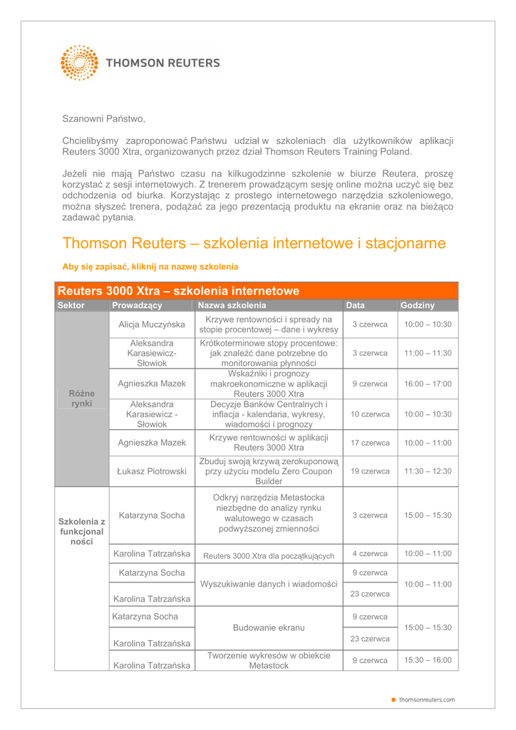 Szanowni Państwo, Chcielibyśmy zaproponować Państwu udział w szkoleniach dla użytkowników aplikacji Reuters 3000 Xtra, organizowanych przez dział Thomson Reuters Training Poland. Jeżeli nie mają Państwo czasu na kilkugodzinne szkolenie w biurze Reutera, proszę korzystać z sesji internetowych. Z trenerem prowadzącym sesję online można uczyć się bez odchodzenia od biurka. Korzystając z prostego internetowego narzędzia szkoleniowego, można słyszeć trenera, podążać za jego prezentacją produktu na ekranie oraz na bieżąco zadawać pytania. Thomson Reuters – szkolenia internetowe i stacjonarne Aby się zapisać, kliknij na nazwę szkolenia Reuters 3000 Xtra – szkolenia internetowe Sektor Prowadzący Alicja Muczyńska Aleksandra KarasiewiczSłowiok Agnieszka Mazek Różne rynki Szkolenia z funkcjonal ności Aleksandra Karasiewicz Słowiok Nazwa szkolenia Krzywe rentowności i spready na stopie procentowej – dane i wykresy Krótkoterminowe stopy procentowe: jak znaleźć dane potrzebne do monitorowania płynności Wskaźniki i prognozy makroekonomiczne w aplikacji Reuters 3000 Xtra Decyzje Banków Centralnych i inflacja - kalendaria, wykresy, wiadomości i prognozy Data Godziny 3 czerwca 10:00 – 10:30 3 czerwca 11:00 – 11:30 9 czerwca 16:00 – 17:00 10 czerwca 10:00 – 10:30 Agnieszka Mazek Krzywe rentowności w aplikacji Reuters 3000 Xtra 17 czerwca 10:00 – 11:00 Łukasz Piotrowski Zbuduj swoją krzywą zerokuponową przy użyciu modelu Zero Coupon Builder 19 czerwca 11:30 – 12:30 Katarzyna Socha Odkryj narzędzia Metastocka niezbędne do analizy rynku walutowego w czasach podwyższonej zmienności 3 czerwca 15:00 – 15:30 Karolina Tatrzańska Reuters 3000 Xtra dla początkujących 4 czerwca 10:00 – 11:00 Katarzyna Socha 9 czerwca Wyszukiwanie danych i wiadomości 10:00 – 11:00 23 czerwca Karolina Tatrzańska Katarzyna Socha 9 czerwca Budowanie ekranu 23 czerwca Karolina Tatrzańska Karolina Tatrzańska 15:00 – 15:30 Tworzenie wykresów w obiekcie Metastock 9 czerwca 15:30 – 16:00 Katarzyna Socha Katarzyna Socha Karolina Tatrzańska Karolina Tatrzańska Katarzyna Socha Agnieszka Mazek Rynek pieniężny i walutowy Reuters 3000 Xtra: wywoływanie danych w Excelu 10 czerwca Siła komunikacji – odkryj Reuters Messaging 18 czerwca 10:00 – 10:20 18 czerwca 10:30 – 11:30 9 czerwca 10:00 – 11:00 Poznaj szeroki zakres danych makroekonomicznych oraz danych z rynku walutowego i pieniężnego w serwisie Reuters 3000 Xtra Analiza opcji walutowych w modelach Reuters 3000 Xtra 15:00 – 16:00 24 czerwca Agnieszka Mazek Analiza forwardów przy użyciu kalkulatorów 16 czerwca 10:00 – 10:30 Agnieszka Mazek Implikowana i historyczna zmienność walutowa w Reuters 3000 Xtra 16 czerwca 15:00 – 15:30 Katarzyna Socha Wykresy dla FX&MM w Reuters 3000 Xtra 15 czerwca 15:00 – 16:00 Łukasz Piotrowski Analiza swapów procentowych (IRS) w Reuters 3000 Xtra 18 czerwca 15:00 – 16:00 Analiza krzywych forwardowych 23 czerwca 10:00 – 11:00 Analiza cap’ów i floor’ów 30 czerwca 14:00 – 15:00 Rysowanie spreadów, sezonowości oraz własnych krzywych terminowych 4 czerwca 15:00 – 15:30 25 czerwca 11:00 – 11:30 8 czerwca 14:00 – 14:45 8 czerwca 15:00 – 15:30 16 czerwca 11:00 – 11:45 Aleksandra Karasiewicz Słowiok Aleksandra Karasiewicz Słowiok Rynek towarowy i energii 23 czerwca Katarzyna Socha Katarzyna Socha Karolina Tatrzańska Karolina Tatrzańska Zboża, oleiste i towary spożywcze: dane i wiadomości Matale szlachetne: dane i wiadomości Fracht - dane, narzędzia i wiadomości Karolina Tatrzańska Rysowanie krzywych terminowych dla rynku towarowego 16 czerwca 16:00 – 16:45 Katarzyna Socha Metale bazowe: dane i wiadomości 17 czerwca 11:00 – 11:45 18 czerwca 16:00 – 16:30 23 czerwca 14:00 – 14:45 24 czerwca 11:00 – 11:45 Karolina Tatrzańska Katarzyna Socha Karolina Tatrzańska Dołącz do społeczności Reuters dla rynku towarowego i energii Ropa i jej produkty: dane i wiadomości Wywoływanie danych z rynku towarowego i energii w Excelu Karolina Tatrzańska Prawa do emisji: dane i wiadomości 25 czerwca 14:00 – 14:45 Katarzyna Socha Europejska energia elektryczna: dane i wiadomości 29 czerwca 15:00 – 15:45 Rysowanie spreadów dla papierów dłużnych w Reuters 3000 Xtra 10 czerwca 14:00 – 14:30 Najważniejsze wiadomości dla rynku długu 22 czerwca 15:00 – 15:30 Łukasz Piotrowski Monitorowanie VWAP w czasie rzeczywistym 1 czerwca 14:00 – 14:30 Alicja Muczyńska Tworzenie wykresów dla danych z rynku kapitałowego 5 czerwca 11:30 – 12:00 Alicja Muczyńska Fuzje, przejęcia oraz oferty publiczne (IPO) w Reuters 3000 Xtra 9 czerwca 11:00 – 12:00 Alicja Muczyńska Rynek Kapitałowy – dane fundamentalne i czasu rzeczywistego w Excelu 10 czerwca 11:00 – 12:00 Łukasz Piotrowski Monitorowanie arkusza zleceń spółki 23 czerwca 11:30 – 12:00 Alicja Muczynska Zmienność implikowana i historyczna w Reuters 3000 Xtra 23 czerwca 16:00 – 16:30 Łukasz Piotrowski Analiza kredytowa spółki 24 czerwca 11:00 – 11:30 Alicja Muczyńska Spółki i sektory – wpływ na indeksy giełdowe 25 czerwca 11:00 -11:30 Alicja Muczyńska Analiza spółek wewnątrz sektora lub indeksu w Reuters 3000 Xtra 25 czerwca 15:00 – 16:00 Łukasz Piotrowski Rynek Kapitałowy – fundusze inwestycyjne w Reuters 3000 Xtra 26 czerwca 11:30 – 12:00 Alicja Muczyńska Analiza danych fundamentalnych i prognoz dla spółek 30 czerwca 10:00 – 10:30 Rynek długu Rynek kapitałowy Aleksandra Karasiewicz Słowiok Aleksandra Karasiewicz Słowiok Zapraszamy również na szkolenia, które odbywają się w naszym centrum szkoleniowym w Warszawie, w budynku Atrium, przy ulicy Jana Pawła II 23, V p. Reuters 3000 Xtra – szkolenia stacjonarne Sektor Prowadzący Nazwa szkolenia Agnieszka Mazek Szkolenia podstawowe Alicja Muczyńska Karolina Tatrzańska Szkolenie podstawowe - wersja Xtry 5.0 Data 2–3 czerwca 16 – 17 czerwca 30 czerwca – 1 lipc