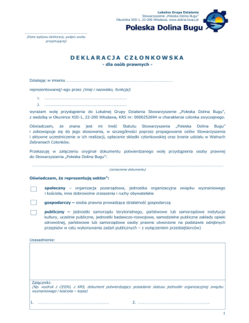 Lokalna Grupa Działania Stowarzyszenie „Poleska Dolina Bugu” Okuninka XIII-1, 22-200 Włodawa, www.dolina-bugu.pl ……..…………………………………………………….… (Data wpływu deklaracji, podpis osoby przyjmującej) DEKLARACJA CZŁONKOWSKA - dla osób prawnych - Działając w imieniu ……………………………………………………………………………………………………… reprezentowanej/-ego przez (imię i nazwisko, funkcja): 1. ……………………………………………………………………………… 2. ……………………………………………………………………………… wyrażam wolę przystąpienia do Lokalnej Grupy Działania Stowarzyszenie „Poleska Dolina Bugu”, z siedzibą w Okunince XIII-1, 22-200 Włodawa, KRS nr: 0000252694 w charakterze członka zwyczajnego. Oświadczam, że znana jest mi treść Statutu Stowarzyszenia „Poleska Dolina Bugu” i zobowiązuje się do jego stosowania, w szczególności poprzez propagowanie celów Stowarzyszenia i aktywne uczestniczenie w ich realizacji, opłacanie składki członkowskiej oraz branie udziału w Walnych Zebraniach Członków. Przekazuję w załączeniu oryginał dokumentu potwierdzanego wolę przystąpienia osoby prawnej do Stowarzyszenia „Poleska Dolina Bugu”: ………………………………………………………………………………………………………………………………………………………………………………………… (oznaczenie dokumentu) Oświadczam, że reprezentuję sektor1: społeczny – organizacja pozarządowa, jednostka organizacyjna związku wyznaniowego i kościoła, inne dobrowolne zrzeszenia i ruchy obywatelskie gospodarczy – osoba prawna prowadząca działalność gospodarczą publiczny – jednostki samorządu terytorialnego, państwowe lub samorządowe instytucje kultury, uczelnie publiczne, jednostki badawczo-rozwojowe, samodzielne publiczne zakłady opieki zdrowotnej, państwowe lub samorządowe osoby prawne utworzone na podstawie odrębnych przepisów w celu wykonywania zadań publicznych – z wyłączeniem przedsiębiorców) Uzasadnienie: Załączniki: (Np. wydruk z CEIDG, z KRS, dokument potwierdzający posiadanie statusu jednostki organizacyjnej związku wyznaniowego i kościoła – kopia) 1. …………………………………………………………………… 2. ……………………………………………………………………. 1 Lokalna Grupa Działania Stowarzyszenie „Poleska Dolina Bugu” Okuninka XIII-1, 22-200 Włodawa, www.dolina-bugu.pl Dane dotyczące osoby prawnej: Nazwa Nr z właściwego rejestru (KRS, inny) NIP REGON Adres siedziby Dane dotyczące osoby upoważnionej do reprezentacji osoby prawnej w Stowarzyszeniu „Poleska Dolina Bugu” Imię i nazwisko Data urodzenia Adres do korespondencji Telefon kontaktowy, e-mail Oświadczenia osoby upoważnionej do reprezentacji osoby prawnej w Stowarzyszeniu „Poleska Dolina Bugu”: Wyrażam zgodę na reprezentowanie ………………………………………………………………………………… w Lokalnej Grupie Działania Stowarzyszenie „Poleska Dolina Bugu”. Wyrażam zgodę na przesyłanie informacji o posiedzeniach Walnego Zebrania Członków drogą e-mailową na podany powyżej adres e-mail oraz przesyłanie innych informacji dotyczących bieżącej działalności Stowarzyszenia, a także wyrażam zgodę na kontaktowanie się drogą telefoniczną na podany powyżej numer kontaktowy w sprawach związanych z członkostwem w Stowarzyszeniu. Wyrażam zgodę na przetwarzanie moich danych osobowych zgodnie z ustawą z dnia 29.07.1997r. o ochronie danych osobowych (Dz.U. z 2014 poz. 1182, z późn. zm.) przez Lokalną Grupę Działania Stowarzyszenie „Poleska Dolina Bugu”, z siedzibą w Okunince XIII-1, 22-200 Włodawa. Jednocześnie przyjmuję do wiadomości, że: 1. Administratorem zebranych danych osobowych jest Stowarzyszenie „Poleska Dolina Bugu” z siedzibą w Okunince XIII-1, 22-200 Włodawa, 2. Zebrane dane osobowe będą przetwarzane w związku z funkcjonowaniem Stowarzyszenia zgodnie ze Statutem, 1. Zebrane dane osobowe będą przetwarzane do dnia 31.12.2028 r., 3. Dane osobowe mogą zostać udostępnione innym podmiotom w celu monitoringu, sprawozdawczości i ewaluacji w ramach realizacji przez LGD Strategii Rozwoju Lokalnego Kierowanego przez Społeczność, 4. Podanie danych jest dobrowolne, jednak odmowa wyrażenia zgody na ich przetwarzanie lub cofnięcie takiej zgody jest równoznaczne z brakiem możliwości reprezentowania osoby prawnej w Stowarzyszeniu „Poleska Dolina Bugu”, 5. Mam prawo dostępu do swoich danych osobowych i ich poprawiania. …………………………………………………………………………………………………… (Miejscowość, data, czytelny podpis) 2 Lokalna Grupa Działania Stowarzyszenie „Poleska Dolina Bugu” Okuninka XIII-1, 22-200 Włodawa, www.dolina-bugu.pl Oświadczenia kandydata na Członka Stowarzyszenia „Poleska Dolina Bugu”: Oświadczam, że wszystkie informacje podane w deklaracji są zgodne z aktualnym stanem prawnym i faktycznym. Zobowiązuję się do zgłaszania korekty informacji podanych w niniejszej deklaracji w terminie 14 dni od daty zaistnienia ich zmiany. ……………………………………………………………………………………………………… (Miejscowość, data, czytelny podpis osoby/osób upoważnionych do reprezentacji wymienionych na str. 1 deklaracji) Adnotacje Biura Stowarzyszenia „Poleska Dolina Bugu”: 1. Kandydat został przyjęty do grona członków zwyczajnych Stowarzyszenia TAK NIE …………………………………………………………………………………………………………………………………………………………………………………………… (Nr i data pod