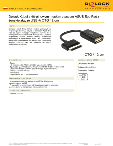 Delock Kabel z 40-pinowym męskim złączem ASUS Eee Pad > żeńskie złącze USB-A OTG 12 cm Opis Niniejszy kabel firmy Delock można podłączyć do 40-pinowego żeńskiego złącza w tabletach ASUS Eee oraz do dysku twardego, urządzenia pamięci itp. z interfejsem w standardzie USB. Funkcja OTG umożliwia bezpośredni transfer danych między urządzeniem przenośnym a urządzeniem USB, bez konieczności podłączania do komputera. Za pomocą tego kabla można ponadto podłączyć mysz lub klawiaturę do obsługi urządzenia przenośnego. Specyfikacja • Złącze: 40-pinowe męskie ASUS > USB 2.0 typ A żeńskie (OTG) • Zgodność z np. ASUS Eee Pad Transformer TF101, TF201, TF300, TF700 • Odpowiedni do pamięci USB, dysku twardego, myszy, klawiatury • Funkcja OTG (On-The-Go) • Kolor: czarny • Długość kabla: ok. 12 cm (ze złączem) Numer artykułu 83450 EAN: 4043619834501 Kraj pochodzenia: China Opakowanie: Poly bag Wymagania systemowe • Urządzenie przenośne z obsługą funkcji OTG i 40-pinowym żeńskim złączem ASUS • W przypadku używania myszy lub klawiatury urządzenie przenośne powinno być w wystarczającym stopniu naładowane Zawartość opakowania • Kabel OTG ASUS © 2017 by Delock. Wszelkie pojawiające się tutaj nazwy i znaki należą do ich odpowiednich właścicieli. Błędy drukarskie, zmiany & pomyłki zastrzeżone. Powered by TCPDF (www.tcpdf.org) www.delock.com 83450 1/1 08.03.2017