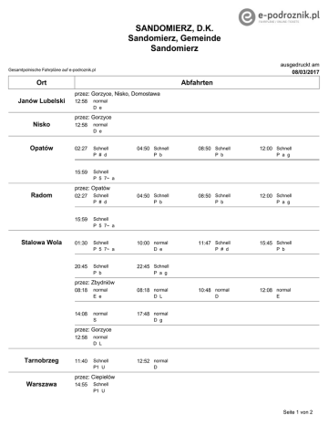 SANDOMIERZ, D.K. Sandomierz, Gemeinde Sandomierz ausgedruckt am 08/03/2017 Gesamtpolnische Fahrpläne auf e-podroznik.pl Ort Abfahrten przez: Gorzyce, Nisko, Domostawa Janów Lubelski 12:58 normal D e przez: Gorzyce Nisko 12:58 normal D e Opatów 02:27 Schnell P # d 15:59 04:50 Schnell P b 08:50 Schnell P b 12:00 Schnell P a g Schnell P 5 7~ a przez: Opatów Radom Stalowa Wola 02:27 Schnell P # d 04:50 Schnell P b 15:59 Schnell P 5 7~ a 01:30 Schnell P 5 7~ a 10:00 normal Schnell P b 22:45 Schnell 20:45 D e 08:50 Schnell P b 11:47 Schnell P # d 12:00 Schnell P a g 15:45 Schnell P b P a g przez: Zbydniów 08:18 14:08 normal E e 08:18 normal normal S 17:48 normal D L 10:48 normal D 12:08 normal E D g przez: Gorzyce Tarnobrzeg 12:58 normal D L 11:40 Schnell P1 U 12:52 normal D przez: Ciepielów Warszawa 14:55 Schnell P1 U Seite 1 von 2 SANDOMIERZ, D.K. Sandomierz, Gemeinde Sandomierz ausgedruckt am 08/03/2017 Gesamtpolnische Fahrpläne auf e-podroznik.pl Ort Abfahrten przez: Opatów, Radom 02:27 15:59 Schnell P # d 04:50 Schnell 08:50 Schnell P b 12:00 Schnell P b P a g Schnell P 5 7~ a Bezeichnungen # kursuje w poniedziałki i dni poświąteczne 5 kursuje w piątki 7~ kursuje w niedziele i ostatni świąteczny dzień weekendu D kursuje od poniedziałku do piątku oprócz świąt E kursuje od poniedziałku do soboty oprócz świąt L kursuje w okresie ferii letnich P kurs pospieszny P1 KURS POSPIESZNY S Kursuje w dni nauki szkolnej U nie kursuje 1 I, w pierwszy dzień Świat Wielkanocnych i w dniu 25 XII a nie kursuje w pierwszy dzień Świąt Wielkanocnych oraz w dniu 25 XII b nie kursuje w dniu 1.I, w pierwszy dzień Świąt Wielkanocnych i w dniu 25 XII d nie kursuje w dniu 1.I, w pierwszy i drugi dzień Świąt Wielkanocnych oraz w dniach e nie kursuje w okresie ferii letnich g nie kursuje w dniu 24.XII