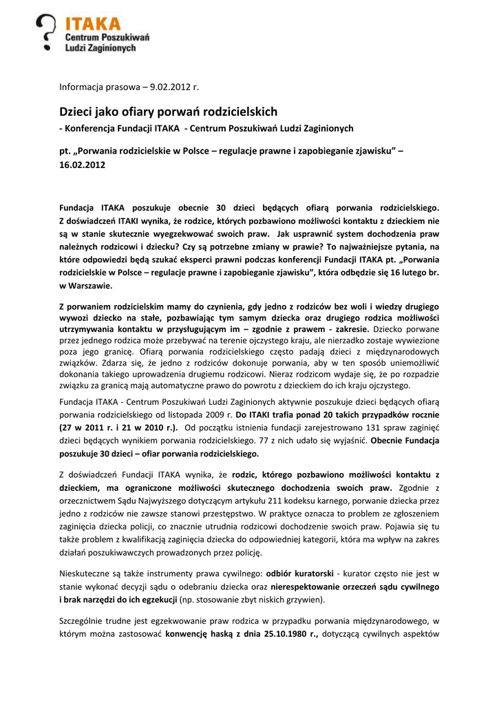 Informacja prasowa – 9.02.2012 r. Dzieci jako ofiary porwao rodzicielskich - Konferencja Fundacji ITAKA - Centrum Poszukiwao Ludzi Zaginionych pt. „Porwania rodzicielskie w Polsce – regulacje prawne i zapobieganie zjawisku” – 16.02.2012 Fundacja ITAKA poszukuje obecnie 30 dzieci będących ofiarą porwania rodzicielskiego. Z doświadczeo ITAKI wynika, że rodzice, których pozbawiono możliwości kontaktu z dzieckiem nie są w stanie skutecznie wyegzekwowad swoich praw. Jak usprawnid system dochodzenia praw należnych rodzicowi i dziecku? Czy są potrzebne zmiany w prawie? To najważniejsze pytania, na które odpowiedzi będą szukad eksperci prawni podczas konferencji Fundacji ITAKA pt. „Porwania rodzicielskie w Polsce – regulacje prawne i zapobieganie zjawisku”, która odbędzie się 16 lutego br. w Warszawie. Z porwaniem rodzicielskim mamy do czynienia, gdy jedno z rodziców bez woli i wiedzy drugiego wywozi dziecko na stałe, pozbawiając tym samym dziecka oraz drugiego rodzica możliwości utrzymywania kontaktu w przysługującym im – zgodnie z prawem - zakresie. Dziecko porwane przez jednego rodzica może przebywad na terenie ojczystego kraju, ale nierzadko zostaje wywiezione poza jego granicę. Ofiarą porwania rodzicielskiego często padają dzieci z międzynarodowych związków. Zdarza się, że jedno z rodziców dokonuje porwania, aby w ten sposób uniemożliwid dokonania takiego uprowadzenia drugiemu rodzicowi. Nieraz rodzicom wydaje się, że po rozpadzie związku za granicą mają automatyczne prawo do powrotu z dzieckiem do ich kraju ojczystego. Fundacja ITAKA - Centrum Poszukiwao Ludzi Zaginionych aktywnie poszukuje dzieci będących ofiarą porwania rodzicielskiego od listopada 2009 r. Do ITAKI trafia ponad 20 takich przypadków rocznie (27 w 2011 r. i 21 w 2010 r.). Od początku istnienia fundacji zarejestrowano 131 spraw zaginięd dzieci będących wynikiem porwania rodzicielskiego. 77 z nich udało się wyjaśnid. Obecnie Fundacja poszukuje 30 dzieci – ofiar porwania rodzicielskiego. Z doświadczeo Fundacji ITAKA wynika, że rodzic, którego pozbawiono możliwości kontaktu z dzieckiem, ma ograniczone możliwości skutecznego dochodzenia swoich praw. Zgodnie z orzecznictwem Sądu Najwyższego dotyczącym artykułu 211 kodeksu karnego, porwanie dziecka przez jedno z rodziców nie zawsze stanowi przestępstwo. W praktyce oznacza to problem ze zgłoszeniem zaginięcia dziecka policji, co znacznie utrudnia rodzicowi dochodzenie swoich praw. Pojawia się tu także problem z kwalifikacją zaginięcia dziecka do odpowiedniej kategorii, która ma wpływ na zakres działao poszukiwawczych prowadzonych przez policję. Nieskuteczne są także instrumenty prawa cywilnego: odbiór kuratorski - kurator często nie jest w stanie wykonad decyzji sądu o odebraniu dziecka oraz nierespektowanie orzeczeo sądu cywilnego i brak narzędzi do ich egzekucji (np. stosowanie zbyt niskich grzywien). Szczególnie trudne jest egzekwowanie praw rodzica w przypadku porwania międzynarodowego, w którym można zastosowad konwencję haską z dnia 25.10.1980 r., dotyczącą cywilnych aspektów uprowadzenia dziecka za granicę. Konwencję podpisały 84 paostwa i ma ona zastosowanie, gdy doszło do uprowadzenia lub zatrzymania dziecka w jednym z umawiających się paostw. Postępowanie w trybie konwencji haskiej jest długotrwałe, dodatkowo zawiesza ono możliwośd prowadzenia postępowania cywilnego w kraju. Według danych Ministerstwa Sprawiedliwości, które jest organem odpowiadającym za stosowanie konwencji w Polsce, w 2011 r. z Polski wystosowano 64 wnioski o wydanie dziecka (najwięcej 19 – do Wielkiej Brytanii, 14 do Niemiec). Z kolei do Polski przesłano 79 wniosków (najwięcej - 21 z Wielkiej Brytanii, 12 z Włoch). Jak Fundacja ITAKA może pomóc? Fundacja ITAKA zajmuje się porwaniami rodzicielskimi, traktując je jako szczególny przypadek zaginięcia dziecka. Angażując się w sprawy porwao rodzicielskich, ITAKA nie opowiada się po żadnej ze stron. Celem działao fundacji jest przede wszystkim ustalenie miejsca pobytu dziecka i pomoc w prawnym uregulowaniu kwestii opieki na dzieckiem. Fundacja oferuje także wsparcie psychologiczne rodzicowi, który poszukuje dziecka. Dysponuje również mediatorem, który pomaga w zawarciu ugody w konfliktach rodzinnych. Pomoc Fundacji jest bezpłatna i oferowana w ramach telefonu 116 000 w sprawie zaginionego dziecka i nastolatka, który działa 24 godziny na dobę przez 7 dni w tygodniu. Bardzo ważną rolę pełnią działania profilaktyczne, w ramach których ITAKA informuje społeczeostwo o tym czym jest porwanie rodzicielskie i jak negatywnie wpływa na życie i rozwój dziecka. *** Więcej informacji: Joanna Gogolioska Fundacja ITAKA – Centrum Poszukiwao Ludzi Zaginionych Tel. 22 620 16 10, 608 334 695, e-mail: [email protected]