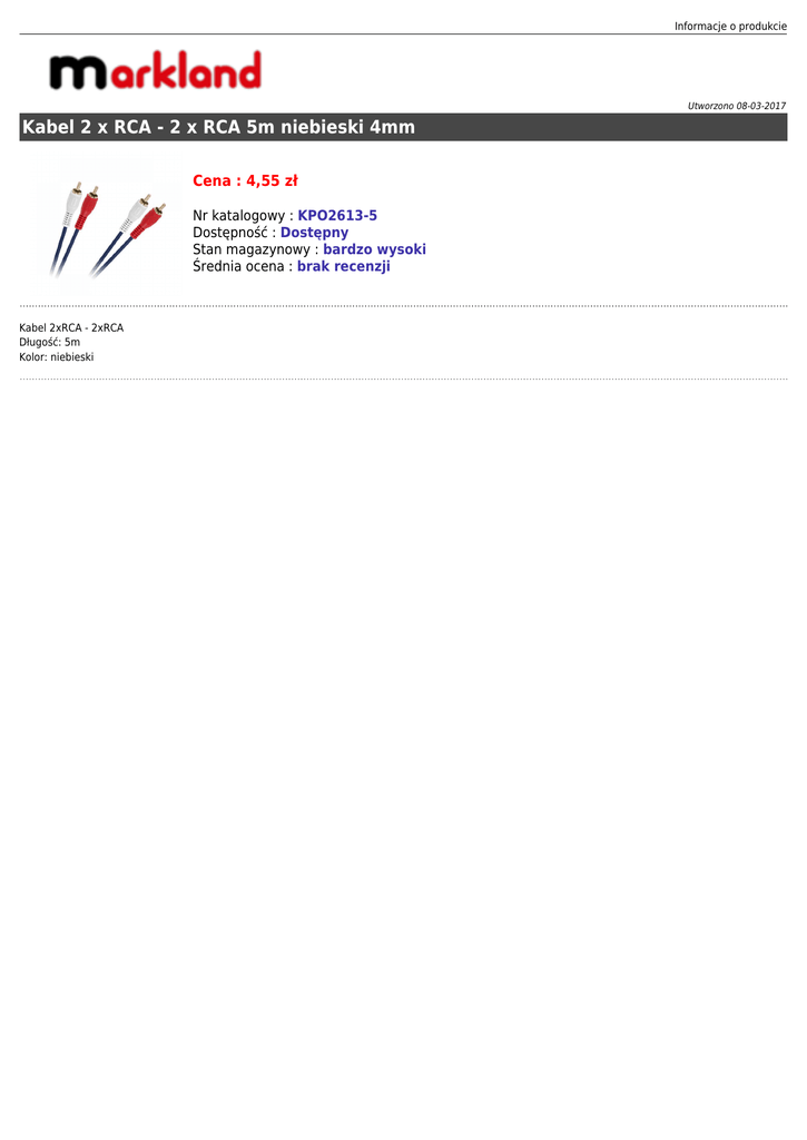Informacje o produkcie Utworzono 08-03-2017 Kabel 2 x RCA - 2 x RCA 5m niebieski 4mm Cena : 4,55 zł Nr katalogowy : KPO2613-5 Dostępność : Dostępny Stan magazynowy : bardzo wysoki Średnia ocena : brak recenzji Kabel 2xRCA - 2xRCA Długość: 5m Kolor: niebieski