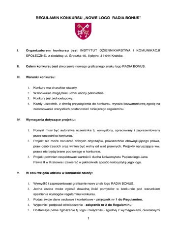 REGULAMIN KONKURSU „NOWE LOGO RADIA BONUS” I. Organizatorem konkursu jest INSTYTUT DZIENNIKARSTWA I KOMUNIKACJI SPOŁECZNEJ z siedzibą: ul. Grodzka 40, II piętro. 31-044 Kraków. II. Celem konkursu jest stworzenie nowego graficznego znaku logo RADIA BONUS. III. Warunki konkursu: 1. Konkurs ma charakter otwarty. 2. W konkursie mogą brać udział osoby pełnoletnie. 3. Konkurs jest jednoetapowy. 4. Każdy uczestnik, z chwilą przystąpienia do konkursu, wyraża bezwarunkową zgodę na zastosowanie wszystkich postanowień niniejszego regulaminu. IV. Wymagania dotyczące projektu: 1. Pomysł musi być autorstwa uczestnika tj. wymyślony, opracowany i zaprezentowany przez uczestnika konkursu. 2. Projekt nie może naruszać dobrych obyczajów, powszechnie obowiązującego prawa, praw osób trzecich oraz winien być wolny od wad prawnych. Projekty naruszające ww. prawa nie będą brane pod uwagę w konkursie. 3. Projekt powinien respektować wartości i ducha Uniwersytetu Papieskiego Jana Pawła II w Krakowie i zawierać w jakikolwiek sposób kolorystykę jego logo. V. W celu wzięcia udziału w konkursie należy: 1. Wymyślić i zaprezentować graficznie nowy znak logo RADIA BONUS. 2. Jedna osoba może zgłosić dowolną ilość pomysłów w konkursie pod warunkiem spełnienia wymogów regulaminu konkursu. 3. Podać swoje dane osobowe i kontaktowe - załącznik nr 1 do Regulaminu. 4. Wypełnić i podpisać oświadczenie - załącznik nr 2 do Regulaminu. 5. Dostarczyć pełne zgłoszenie tj. logo i załączniki - zgodnej z wymaganiami, określonymi 1 w Regulaminie do dnia 10.01.2015 na adres organizatora: ul. Grodzka 40, II piętro. 31-044 Kraków. VI. Rozstrzygnięcie konkursu: 1. Zgłoszenia podlegać będą wyłącznie subiektywnej ocenie komisji konkursowej INSTYTUTU DZIENNIKARSTWA I KOMUNIKACJI SPOŁECZNEJ i nagrodzony zostanie pomysł uznany przez organizatora za najlepszy. 2. Rozstrzygnięcie konkursu nastąpi do dnia 20-01-2015r. i zostanie podane do publicznej wiadomości. 3. Organizator zastrzega sobie prawo nierozstrzygnięcia konkursu, tym samym organizator może nie wybrać żadnego ze zgłoszonych znaków logo i nie przyznać nagrody. 4. Organizator zastrzega sobie prawo do unieważnienia konkursu bez podania przyczyny. 5. Wynik konkursu zostanie ogłoszony na stronie http://radiobonus.pl/ a zwycięzca zostanie o powyższym powiadomiony pisemnie. VII. Zastrzeżenia organizatora: 1. INSTYTUT DZIENNIKARSTWA I KOMUNIKACJI SPOŁECZNEJ zastrzega, iż ocenie podlegać będzie wyłącznie idea, pomysł na znak logo tym samym organizator konkursu dopuszcza możliwość modyfikacji nagrodzonego projektu, we współpracy z autorem. 2. Uczestnik konkursu z chwilą przystąpienia do konkursu wyraża zgodę na ewentualną modyfikację zgłoszonego do konkursu znaku logo oraz wykonanie projektu logo przez INSTYTUT DZIENNIKARSTWA I KOMUNIKACJI SPOŁECZNEJ zgodnie z zapisami niniejszego regulaminu. 3. Decyzje komisji konkursowej są ostateczne i nie przysługuje od nich odwołanie. 4. Uczestnik konkursu może zostać zdyskwalifikowany przez organizatora w przypadku: • wystąpienia przez osobę trzecią z roszczeniami z tytułu naruszenia autorskich praw majątkowych poprzez rozpowszechnianie projektu logo złożonego przez uczestnika konkursu, • gdy projekt logo będzie sprzeczny z dobrymi obyczajami lub z bezwzględnie obowiązującymi przepisami prawa. 2 5. Uczestnicy konkursu ponoszą wszelkie koszty związane z przygotowaniem i złożeniem pracy konkursowej. Organizator nie zwraca kosztów udziału w konkursie. 6. INSTYTUT DZIENNIKARSTWA I KOMUNIKACJI SPOŁECZNEJ zastrzega, iż przyznanie nagrody w konkursie nie jest jednoznaczne z wykorzystaniem zwycięskiego znaku logo. Organizator podejmie oddzielną decyzję o wykorzystaniu logo. VIII. Prawa autorskie: 1. Składając zgłoszenie konkursowe i akceptując Regulamin konkursu uczestnik oświadcza, iż posiada pełnię praw autorskich i praw pokrewnych do pomysłu logo złożonego w konkursie. 2. Przekazanie prac do udziału w konkursie traktowane jest jako równoczesne oświadczenie, że projekt nie narusza praw osób trzecich, w szczególności nie narusza ich majątkowych i osobistych praw autorskich. W przypadku wystąpienia przez osobę trzecią z roszczeniami, wynikającymi z tytułu naruszenia praw określonych powyżej, osoba zgłaszająca pracę zrekompensuje organizatorowi, jako wyłącznie odpowiedzialny, koszty poniesione w związku ze skierowaniem przeciwko niemu roszczeń odszkodowawczych, zwalniając organizatora od wszelkich zobowiązań, jakie powstaną z tego tytułu. 3. Organizator może wyrazić zainteresowanie wykorzystaniem logo wg pomysłu uczestnika konkursu. Jednakże nie jest w żaden sposób zobowiązany do wykorzystania logo wg. zwycięskiego pomysłu i w dowolnym czasie może ogłosić kolejny konkurs na pomysł nowego logo RADIA BONUS. IX. Dane osobowe: 1. Uczestnik przystępując do konkursu wyraża zgodę na przetwarzanie swoich danych osobowych przez INSTYTUT DZIENNIKARSTWA I KOMUNIKACJI SPOŁECZNEJ w celu przeprowadzenia konkursu. Zgoda musi być wyrażona na piśmie w formie oświadczenia. (załącznik nr 1 do Regulaminu). 2. Administratorem zbioru danych osobowych jest INSTYTUT DZIENNIKARSTWA I KOMUNIKACJI SPOŁECZNEJ. 3. Przetwarzanie danych osobowych następować będzie zgodnie z obowiązującymi przepisami. 4. Zgłoszenia konkursowe bez zgody na przetwarzanie danych osobowych nie będą rozpatrywane. 5. INSTYTUT DZIENNIKARSTWA I KOMUNIKACJI SPOŁECZNEJ oświadcza, iż dane 3 osobowe uczestników konkursu będą wykorzystane tylko i wyłącznie do obsługi konkursu i nie będą udostępniane innym podmiotom. 6. Na podstawie bezwzględnie obowiązujących przepisów o ochronie danych osobowych uczestnicy mają prawo wglądu do swoich danych osobowych, ich poprawiania oraz zgłoszenia żądania zaprzestania ich przetwarzania. 7. Uczestnik konkursu jest zobowiązany niezwłocznie powiadomić orga