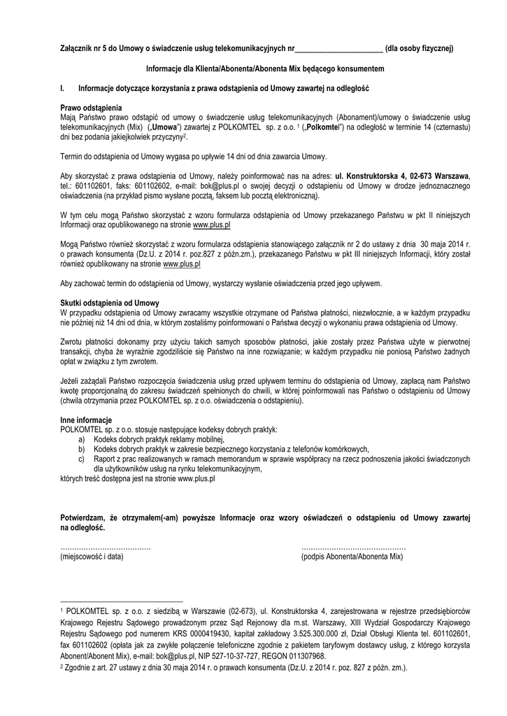 Załącznik nr 5 do Umowy o świadczenie usług telekomunikacyjnych nr___________________ (dla osoby fizycznej) Informacje dla Klienta/Abonenta/Abonenta Mix będącego konsumentem I. Informacje dotyczące korzystania z prawa odstąpienia od Umowy zawartej na odległość Prawo odstąpienia Mają Państwo prawo odstąpić od umowy o świadczenie usług telekomunikacyjnych (Abonament)/umowy o świadczenie usług telekomunikacyjnych (Mix) („Umowa”) zawartej z POLKOMTEL sp. z o.o. 1 („Polkomtel”) na odległość w terminie 14 (czternastu) dni bez podania jakiejkolwiek przyczyny2. Termin do odstąpienia od Umowy wygasa po upływie 14 dni od dnia zawarcia Umowy. Aby skorzystać z prawa odstąpienia od Umowy, należy poinformować nas na adres: ul. Konstruktorska 4, 02-673 Warszawa, tel.: 601102601, faks: 601102602, e-mail: [email protected] o swojej decyzji o odstąpieniu od Umowy w drodze jednoznacznego oświadczenia (na przykład pismo wysłane pocztą, faksem lub pocztą elektroniczną). W tym celu mogą Państwo skorzystać z wzoru formularza odstąpienia od Umowy przekazanego Państwu w pkt II niniejszych Informacji oraz opublikowanego na stronie www.plus.pl Mogą Państwo również skorzystać z wzoru formularza odstąpienia stanowiącego załącznik nr 2 do ustawy z dnia 30 maja 2014 r. o prawach konsumenta (Dz.U. z 2014 r. poz.827 z późn.zm.), przekazanego Państwu w pkt III niniejszych Informacji, który został również opublikowany na stronie www.plus.pl Aby zachować termin do odstąpienia od Umowy, wystarczy wysłanie oświadczenia przed jego upływem. Skutki odstąpienia od Umowy W przypadku odstąpienia od Umowy zwracamy wszystkie otrzymane od Państwa płatności, niezwłocznie, a w każdym przypadku nie później niż 14 dni od dnia, w którym zostaliśmy poinformowani o Państwa decyzji o wykonaniu prawa odstąpienia od Umowy. Zwrotu płatności dokonamy przy użyciu takich samych sposobów płatności, jakie zostały przez Państwa użyte w pierwotnej transakcji, chyba że wyraźnie zgodziliście się Państwo na inne rozwiązanie; w każdym przypadku nie poniosą Państwo żadnych opłat w związku z tym zwrotem. Jeżeli zażądali Państwo rozpoczęcia świadczenia usług przed upływem terminu do odstąpienia od Umowy, zapłacą nam Państwo kwotę proporcjonalną do zakresu świadczeń spełnionych do chwili, w której poinformowali nas Państwo o odstąpieniu od Umowy (chwila otrzymania przez POLKOMTEL sp. z o.o. oświadczenia o odstąpieniu). Inne informacje POLKOMTEL sp. z o.o. stosuje następujące kodeksy dobrych praktyk: a) Kodeks dobrych praktyk reklamy mobilnej, b) Kodeks dobrych praktyk w zakresie bezpiecznego korzystania z telefonów komórkowych, c) Raport z prac realizowanych w ramach memorandum w sprawie współpracy na rzecz podnoszenia jakości świadczonych dla użytkowników usług na rynku telekomunikacyjnym, których treść dostępna jest na stronie www.plus.pl Potwierdzam, że otrzymałem(-am) powyższe Informacje oraz wzory oświadczeń o odstąpieniu od Umowy zawartej na odległość. ………………………………… (miejscowość i data) ……………………………………… (podpis Abonenta/Abonenta Mix) POLKOMTEL sp. z o.o. z siedzibą w Warszawie (02-673), ul. Konstruktorska 4, zarejestrowana w rejestrze przedsiębiorców Krajowego Rejestru Sądowego prowadzonym przez Sąd Rejonowy dla m.st. Warszawy, XIII Wydział Gospodarczy Krajowego Rejestru Sądowego pod numerem KRS 0000419430, kapitał zakładowy 3.525.300.000 zł, Dział Obsługi Klienta tel. 601102601, fax 601102602 (opłata jak za zwykłe połączenie telefoniczne zgodnie z pakietem taryfowym dostawcy usług, z którego korzysta Abonent/Abonent Mix), e-mail: [email protected], NIP 527-10-37-727, REGON 011307968. 2 Zgodnie z art. 27 ustawy z dnia 30 maja 2014 r. o prawach konsumenta (Dz.U. z 2014 r. poz. 827 z późn. zm.). 1 Żądanie Abonenta/Abonenta Mix rozpoczęcia świadczenia usług przez POLKOMTEL sp. z o.o. przed upływem terminu do odstąpienia od Umowy zawartej na odległość Żądam rozpoczęcia przez POLKOMTEL sp. z o.o. świadczenia usług przed upływem 14 dni od dnia zawarcia Umowy. TAK NIE W przypadku żądania Abonenta/Abonenta Mix rozpoczęcia świadczenia usług przez POLKOMTEL sp. z o.o. przed upływem 14 dni od dnia zawarcia Umowy, Abonent/Abonent Mix zachowuje prawo do odstąpienia od Umowy w terminie 14 dni od dnia jej zawarcia i stosownie do art. 35 ust. 1 ustawy z 30 maja 2014 r. o prawach konsumenta (Dz.U. z 2014 r. poz. 827 z późn. zm.) jest zobowiązany do zapłaty za usługi świadczone mu przez POLKOMTEL sp. z o.o. do chwili, w której poinformował POLKOMTEL sp. z o.o. o odstąpieniu od Umowy. Abonentowi/Abonentowi Mix przysługuje także zastrzeżone w § 6 ust. 6 Regulaminu świadczenia usług telekomunikacyjnych przez POLKOMTEL sp. z o.o. – Abonament/ § 6 ust. 5 Regulaminu świadczenia usług telekomunikacyjnych przez POLKOMTEL sp. z o. o. - Mix prawo do odstąpienia od Umowy z powodu nierozpoczęcia przez POLKOMTEL sp. z o.o. świadczenia usług. Termin na skorzystanie z tego prawa do odstąpienia rozpoczyna się od dnia następnego po upływie 14 dniowego terminu na skorzystanie z prawa do odstąpienia od Umowy, przewidzianego w art. 27 ustawy z dnia 30 maja 2014 r. o prawach konsumenta (Dz.U. z 2014 r. poz. 827 z późn zm.). ………………………………… (miejscowość i data) ……………………………………… (podpis Abonenta/Abonenta Mix) II. Wzór oświadczenia o odstąpieniu od Umowy zawartej na odległość ……………………………………… Imię i nazwisko POLKOMTEL sp. z o.o. ul. Konstruktorska 4 02- 673 Warszawa …………………………………….. adres zamieszkania OŚWIADCZENIE O ODSTĄPIENIU OD UMOWY ZAWARTEJ NA ODLEGŁOŚĆ Oświadczam, że na podstawie art. 27 ustawy z 30 maja 2014 r. o prawach konsumenta (Dz.U. z 2014 r poz.827 z późn. zm.), odstępuję od u
