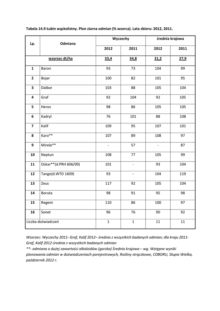 Tabela 14.9 Łubin wąskolistny. Plon ziarna odmian