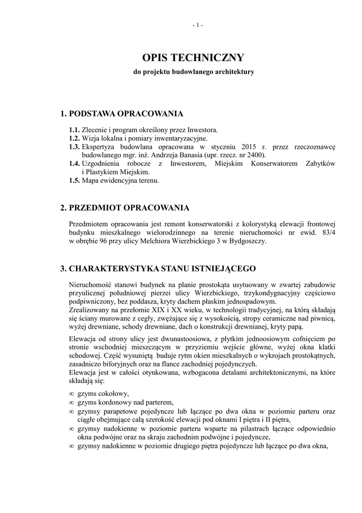 -1- OPIS TECHNICZNY do projektu budowlanego architektury 1. PODSTAWA OPRACOWANIA 1.1. Zlecenie i program określony przez Inwestora. 1.2. Wizja lokalna i pomiary inwentaryzacyjne. 1.3. Ekspertyza budowlana opracowana w styczniu 2015 r. przez rzeczoznawcę budowlanego mgr. inż. Andrzeja Banasia (upr. rzecz. nr 2400). 1.4. Uzgodnienia robocze z Inwestorem, Miejskim Konserwatorem Zabytków i Plastykiem Miejskim. 1.5. Mapa ewidencyjna terenu. 2. PRZEDMIOT OPRACOWANIA Przedmiotem opracowania jest remont konserwatorski z kolorystyką elewacji frontowej budynku mieszkalnego wielorodzinnego na terenie nieruchomości nr ewid. 83/4 w obrębie 96 przy ulicy Melchiora Wierzbickiego 3 w Bydgoszczy. 3. CHARAKTERYSTYKA STANU ISTNIEJĄCEGO Nieruchomość stanowi budynek na planie prostokąta usytuowany w zwartej zabudowie przyulicznej południowej pierzei ulicy Wierzbickiego, trzykondygnacyjny częściowo podpiwniczony, bez poddasza, kryty dachem płaskim jednospadowym. Zrealizowany na przełomie XIX i XX wieku, w technologii tradycyjnej, na którą składają się ściany murowane z cegły, zwężające się z wysokością, stropy ceramiczne nad piwnicą, wyżej drewniane, schody drewniane, dach o konstrukcji drewnianej, kryty papą. Elewacja od strony ulicy jest dwunastoosiowa, z płytkim jednoosiowym cofnięciem po stronie wschodniej mieszczącym w przyziemiu wejście główne, wyżej okna klatki schodowej. Część wysuniętą buduje rytm okien mieszkalnych o wykrojach prostokątnych, zasadniczo biforyjnych oraz na flance zachodniej pojedynczych. Elewacja jest w całości otynkowana, wzbogacona detalami architektonicznymi, na które składają się: • gzyms cokołowy, • gzyms kordonowy nad parterem, • gzymsy parapetowe pojedyncze lub łączące po dwa okna w poziomie parteru oraz ciągłe obejmujące całą szerokość elewacji pod oknami I piętra i II piętra, • gzymsy nadokienne w poziomie parteru wsparte na pilastrach łączące odpowiednio okna podwójne oraz na skraju zachodnim podwójne i pojedyncze, • gzymsy nadokienne w poziomie drugiego piętra pojedyncze lub łączące po dwa okna, -2- • gzyms nadokienny obejmujący całą szerokość elewacji w poziomie II piętra, wyłamany naprzemiennie trójkątnie lub półkoliście, • gzyms attykowy, • profilowane opaski wokół okien, z wyłączeniem trzech okien w poziomie parteru. Na powierzchni elewacji frontowej nie stwierdzono poważniejszych pęknięć ani innych uszkodzeń natury mechanicznej. Zinwentaryzowano natomiast zniszczenia okładziny cokołowej, wypraw tynkarskich i wykończeń, złą jakość opierzeń, zatracenie części detalu architektonicznego. Stan techniczny elewacji frontowej pozwala na przeprowadzenie projektowanych robót remontowych. Przewidziany zakres robót nie zwalnia z obowiązku wykonania prac naprawczych pozostałych uszkodzonych elementów budynku wskazanych w przywoływanej ekspertyzie budowlanej (patrz pkt 1.3). 4. STAN PRAWNY Budynek stanowi własność Wspólnoty Mieszkaniowej WIERZBICKIEGO 3. 5. ZAKRES OGÓLNY PRAC Projekt przewiduje: • wykonanie izolacji wodochronnej ściany cokołowej elewacji frontowej i wyłożenie płytami kamiennymi, • remont konserwatorski elewacji frontowej powyżej cokołu z odtworzeniem detalu architektonicznego, • wszelkie prace uzupełniające, jak przełożenie rozprowadzeń instalacyjnych, wymiana blacharki, konserwacja elementów stalowych, wymiana akcesoriów elewacyjnych, przełożenie nawierzchni przyściennej, itp. 6. WARUNKI OCHRONY PRZECIWPOŻAROWEJ Obiekt kwalifikuje się do kategorii ZLIV zagrożenia ludzi oraz z uwagi na wysokość trzech kondygnacji do budynków niskich (N). Zakres robót sprowadzający się do remontu elewacji frontowej nie zmienia istniejących uwarunkowań w zakresie wymogów przeciwpożarowych. 7. INFORMACJA DOTYCZĄCA BEZPIECZEŃSTWA I OCHRONY ZDROWIA (BIOZ) Zgodnie z art. 21a ust. 1a Prawa Budowlanego inwestycja zalicza się do przedsięwzięć wymagających sporządzenia planu BIOZ, z uwagi na: • przewidywany czas trwania robót powyżej 30 dni i liczbę pracowników, -3- • charakter robót, organizację i miejsce prowadzenia stwarzające ryzyko powstania zagrożenia bezpieczeństwa i zdrowia ludzi w szczególności: – – – – przygniecenia lub uderzenia przedmiotem spadającym, upadku z wysokości, uszkodzenia ciała (złamania, skaleczenia, zachlapania oczu, itp.), porażenia prądem. Potencjalnymi źródłami zagrożeń związanymi z inwestycją są: • • • • • • • • • • • • • transport i rozładunek materiałów, roboty z użyciem maszyn budowlanych i elektronarzędzi, roboty w czynnym obiekcie, roboty w pasie dróg komunikacji publicznej, roboty przy granicach z nieruchomościami sąsiadów, roboty w wykopie (izolacja wodochronna ścian piwnicznych/cokołowych), roboty na wysokości (na rusztowaniach i drabinach), roboty rozbiórkowe (demontaż blacharki, rozbiórka okładzin, skuwanie tynku), roboty naprawcze murów (ewentualne przemurowania i wzmocnienie nadproży), roboty dociepleniowe, tynkarskie i malarskie, roboty kamieniarskie, roboty związane z ułożeniem nawierzchni, roboty ślusarskie. Przed przystąpieniem do robót kierownik budowy winien sporządzić lub zapewnić sporządzenie planu BIOZ, następnie dopilnować wdrożenia jego ustaleń, zwłaszcza: • wyznaczenia i oznakowania granic budowy w celu zabezpieczenia przed dostępem osób postronnych, • wyznaczenia stref komunikacyjnych i składowych, z uwzględnieniem zmiany organizacji ruchu ulicznego, • umieszczenia na budowie tablicy informacyjnej o planie BIOZ, • przeprowadzenia instruktażu pracowników w zakresie wykonywanych przez nich robót i wynikających z nich zagrożeń, • wyposażenia pracowników w sprzęt ochrony osobistej, • sprawowania ciągłego nadzoru nad prowadzonymi robotami, • prowadzenia dokumentacji budowy. Należy dopilnować, aby prace na wysokości prowadzone były z rusztowań 