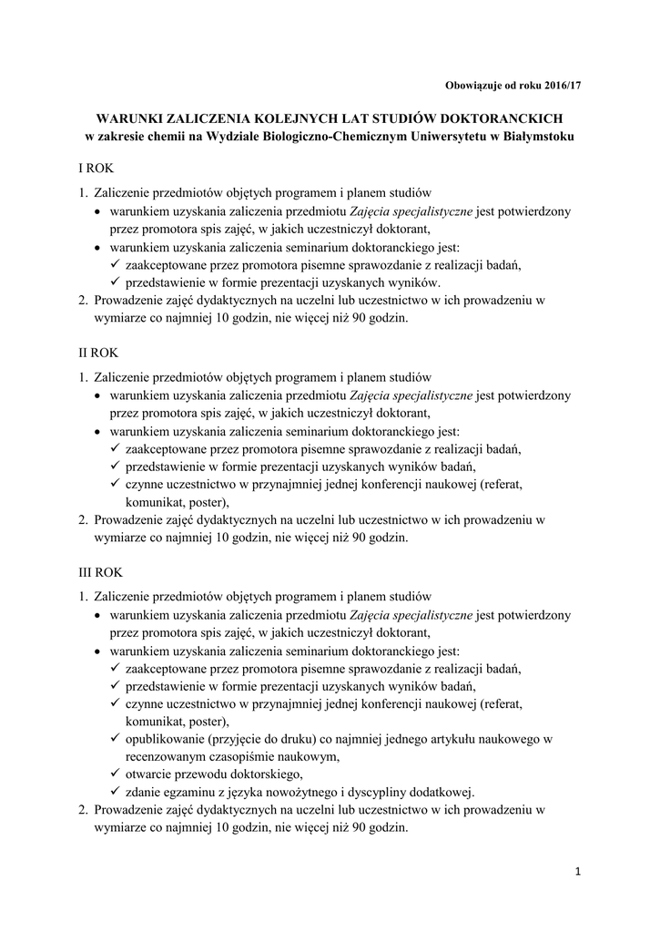 Obowiązuje od roku 2016/17 WARUNKI ZALICZENIA KOLEJNYCH LAT STUDIÓW DOKTORANCKICH w zakresie chemii na Wydziale Biologiczno-Chemicznym Uniwersytetu w Białymstoku I ROK 1. Zaliczenie przedmiotów objętych programem i planem studiów warunkiem uzyskania zaliczenia przedmiotu Zajęcia specjalistyczne jest potwierdzony przez promotora spis zajęć, w jakich uczestniczył doktorant, warunkiem uzyskania zaliczenia seminarium doktoranckiego jest: zaakceptowane przez promotora pisemne sprawozdanie z realizacji badań, przedstawienie w formie prezentacji uzyskanych wyników. 2. Prowadzenie zajęć dydaktycznych na uczelni lub uczestnictwo w ich prowadzeniu w wymiarze co najmniej 10 godzin, nie więcej niż 90 godzin. II ROK 1. Zaliczenie przedmiotów objętych programem i planem studiów warunkiem uzyskania zaliczenia przedmiotu Zajęcia specjalistyczne jest potwierdzony przez promotora spis zajęć, w jakich uczestniczył doktorant, warunkiem uzyskania zaliczenia seminarium doktoranckiego jest: zaakceptowane przez promotora pisemne sprawozdanie z realizacji badań, przedstawienie w formie prezentacji uzyskanych wyników badań, czynne uczestnictwo w przynajmniej jednej konferencji naukowej (referat, komunikat, poster), 2. Prowadzenie zajęć dydaktycznych na uczelni lub uczestnictwo w ich prowadzeniu w wymiarze co najmniej 10 godzin, nie więcej niż 90 godzin. III ROK 1. Zaliczenie przedmiotów objętych programem i planem studiów warunkiem uzyskania zaliczenia przedmiotu Zajęcia specjalistyczne jest potwierdzony przez promotora spis zajęć, w jakich uczestniczył doktorant, warunkiem uzyskania zaliczenia seminarium doktoranckiego jest: zaakceptowane przez promotora pisemne sprawozdanie z realizacji badań, przedstawienie w formie prezentacji uzyskanych wyników badań, czynne uczestnictwo w przynajmniej jednej konferencji naukowej (referat, komunikat, poster), opublikowanie (przyjęcie do druku) co najmniej jednego artykułu naukowego w recenzowanym czasopiśmie naukowym, otwarcie przewodu doktorskiego, zdanie egzaminu z języka nowożytnego i dyscypliny dodatkowej. 2. Prowadzenie zajęć dydaktycznych na uczelni lub uczestnictwo w ich prowadzeniu w wymiarze co najmniej 10 godzin, nie więcej niż 90 godzin. 1 IV ROK 1. Zaliczenie przedmiotów objętych programem i planem studiów warunkiem uzyskania zaliczenia przedmiotu Zajęcia specjalistyczne jest potwierdzony przez promotora spis zajęć, w jakich uczestniczył doktorant, warunkiem uzyskania zaliczenia seminarium doktoranckiego jest: zaakceptowane przez promotora pisemne sprawozdanie z realizacji badań, przedstawienie w formie prezentacji uzyskanych wyników badań czynne uczestnictwo w przynajmniej jednej konferencji naukowej (referat, komunikat, poster). 2. Prowadzenie zajęć dydaktycznych na uczelni lub uczestnictwo w ich prowadzeniu w wymiarze co najmniej 20 godzin, nie więcej niż 90 godzin. Warunkiem ukończenia Studiów Doktoranckich w zakresie chemii jest zaliczenie przedmiotów objętych planem i programem studiów doktoranckich, spełnienie innych wymagań koniecznych do zaliczenia poszczególnych lat studiów, a tym samym uzyskanie wymaganej liczby punktów ECTS oraz złożenie pracy doktorskiej, zdanie egzaminu doktorskiego z dyscypliny podstawowej i obrona pracy doktorskiej i uzyskanie stopnia naukowego doktora w obszarze wiedzy: nauki ścisłe, dziedzinie: nauki chemiczne, dyscyplinie naukowej: chemia. 2