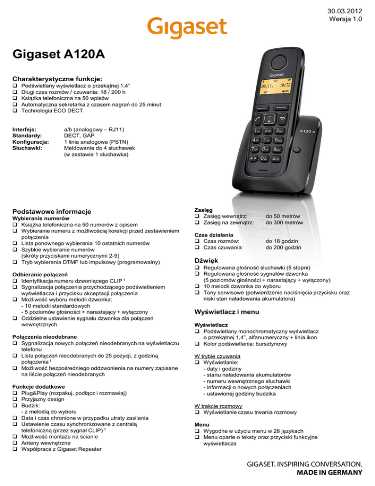 30.03.2012 Wersja 1.0 Gigaset A120A Charakterystyczne funkcje: Podświetlany wyświetlacz o przekątnej 1,4” Długi czas rozmów / czuwania: 18 / 200 h Książka telefoniczna na 50 wpisów Automatyczna sekretarka z czasem nagrań do 25 minut Technologia ECO DECT Interfejs: Standardy: Konfiguracja: Słuchawki: a/b (analogowy – RJ11) DECT, GAP 1 linia analogowa (PSTN) Meldowanie do 4 słuchawek (w zestawie 1 słuchawka) Podstawowe informacje Wybieranie numerów Książka telefoniczna na 50 numerów z opisem Wybieranie numeru z możliwością korekcji przed zestawieniem połączenia Lista ponownego wybierania 10 ostatnich numerów Szybkie wybieranie numerów (skróty przyciskami numerycznymi 2-9) Tryb wybierania DTMF lub impulsowy (programowalny) Odbieranie połączeń Identyfikacja numeru dzwoniącego CLIP 1 Sygnalizacja połączenia przychodzącego podświetleniem wyświetlacza i przycisku akceptacji połączenia Możliwość wyboru melodii dzwonka: - 10 melodii standardowych - 5 poziomów głośności + narastający + wyłączony Oddzielne ustawienie sygnału dzwonka dla połączeń wewnętrznych Połączenia nieodebrane Sygnalizacja nowych połączeń nieodebranych na wyświetlaczu telefonu Lista połączeń nieodebranych do 25 pozycji, z godziną połączenia 1 Możliwość bezpośredniego oddzwonienia na numery zapisane na liście połączeń nieodebranych Funkcje dodatkowe Plug&Play (rozpakuj, podłącz i rozmawiaj) Przyjazny design Budzik: - z melodią do wyboru Data i czas chronione w przypadku utraty zasilania Ustawienie czasu synchronizowane z centralą telefoniczną (przez sygnał CLIP) 1 Możliwość montażu na ścianie Anteny wewnętrzne Współpraca z Gigaset Repeater Zasięg Zasięg wewnątrz: Zasięg na zewnątrz: do 50 metrów do 300 metrów Czas działania Czas rozmów: Czas czuwania: do 18 godzin do 200 godzin Dźwięk Regulowana głośność słuchawki (5 stopni) Regulowana głośność sygnałów dzwonka (5 poziomów głośności + narastający + wyłączony) 10 melodii dzwonka do wyboru Tony serwisowe (potwierdzenie naciśnięcia przycisku oraz niski stan naładowania akumulatora) Wyświetlacz i menu Wyświetlacz Podświetlany monochromatyczny wyświetlacz o przekątnej 1,4”, alfanumeryczny + linia ikon Kolor podświetlenia: bursztynowy W trybie czuwania Wyświetlanie: - daty i godziny - stanu naładowania akumulatorów - numeru wewnętrznego słuchawki - informacji o nowych połączeniach - ustawionej godziny budzika W trakcie rozmowy Wyświetlanie czasu trwania rozmowy Menu Wygodne w użyciu menu w 28 językach Menu oparte o teksty oraz przyciski funkcyjne wyświetlacza 30.03.2012 Wersja 1.0 Klawiatura 12 przycisków numerycznych oraz 5 przycisków funkcyjnych Dwukierunkowy przycisk funkcyjny Blokada klawiatury (długie naciśnięcie „#”) Wyłączenie dzwonka (długie naciśnięcie „*”) Funkcja Flash (R) – długie przyciśnięcie przycisku „0” Funkcja Pauzy (P) – długie przyciśnięcie przycisku „#” w trybie edycji numeru ECO-DECT Do 60% niższe zużycie energii2 (energooszczędny zasilacz impulsowy na wyposażeniu) Redukcja mocy nadawania prawie do zera po odstawieniu słuchawki do stacji bazowej (tylko przy 1 zalogowanej słuchawce) Tryb ECO Plus – redukcja do 100% mocy nadawania dla wszystkich zalogowanych słuchawek4 Płynna redukcja mocy nadawania w zależności od odległości między stacją bazową a słuchawką Dane techniczne Słuchawka Czas gotowości: do 200 godzin Czas rozmów: do 18 godzin Akumulator: 2xAAA (NiMH, 400 mAh) Zasięg w pomieszczeniu: do 50 metrów Zasięg na zewnątrz: do 300 metrów Wymiary: Długość: 31 mm Szerokość: 47 mm Wysokość: 151 mm Masa: 100 g Gigaset Repeater Maksymalnie 4 słuchawki zalogowane w stacji bazowej Stacja bazowa Zasilanie 230V poprzez załączony zasilacz impulsowy Ładowanie słuchawki w stacji bazowej Możliwość montażu na ścianie Przycisk przywołania słuchawek na froncie stacji bazowej Podłączenie do 1 linii analogowej PSTN (RJ11) Możliwość zameldowania 4 słuchawek Wymiary: Długość: 61 mm Szerokość: 80 mm Wysokość: 89 mm Masa: 68 g Funkcje systemu z więcej niż 1 słuchawką Zawartość opakowania Darmowe rozmowy wewnętrzne między słuchawkami 2 rozmowy jednocześnie (1 zewnętrzna, 1 wewnętrzna) Transfer książki telefonicznej między słuchawkami Połączenia wewnętrzne do wszystkich lub do wybranej słuchawki Przekazywanie połączeń zewnętrznych do innych słuchawek z uprzednią konsultacją Konferencja trójstronna (1 rozm. zewn. + 2 rozm. wewn.) Połączenia zewnętrzne sygnalizowane we wszystkich słuchawkach Automatyczna sekretarka 1 Akcesoria Zintegrowana automatyczna sekretarka z czasem nagrań do 25 minut Łatwa obsługa z poziomu słuchawki Predefiniowana zapowiedź w języku polskim z możliwością nagrania własnej (do 170 sekund) Głosowa zapowiedź daty i godziny pozostawienia wiadomości przy odtwarzaniu Ustawiany maksymalny czas nagrania: 1, 2, 3 minuty lub nieograniczony Ustawiany czas przyjęcia połączenia przez sekretarkę: - natychmiast - 10/18/30 sekund - automatycznie Podsłuch nagrywanej wiadomości Możliwość przyjęcia połączenia podczas nagrywania wiadomości Informacja o nowych wiadomościach na wyświetlaczu słuchawki Zdalne odsłuchwanie nagranych wiadomości: odtwarzanie chronione kodem PIN, z dowolnego zewnętrznego telefonu Ochrona nagrań w przypadku utraty zasilania 1 słuchawka 1 stacja bazowa 2 akumulatory AAA (NiMH, 400 mAh) 1 pokrywa akumulatorów 1 zasilacz do stacji bazowej 1 kabel telefoniczny 1 instrukcja obsługi Kolor Czarny 2 3 4 funkcja zależna od operatora w porównaniu do telefonów Gigaset poprzedniej generacji dla wszystkich zarejestrowanych słuchawek – w porównaniu do wyłączonego trybu ECO oraz telefonów Gigaset nieobsługujących standardu ECO DECT kiedy słuchawka przejdzie w stan czuwania lub jest ładowana i gdy wszystkie zarejestrowane słuchawki wspierają tryb ECO Plus Part n