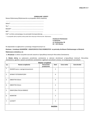 Załącznik nr 2 FORMULARZ OFERTY Nazwa Wykonawcy/Wykonawców w przypadku oferty wspólnej: ............................................................................................... Adres*: .................................................................................. TEL.* .........…………................………………………………………………. REGON*: …………………................………………………………………… NIP*: …………………………………................……………………………… FAX* na który zamawiający ma przesyłać korespondencję .................................................. *- w przypadku oferty wspólnej należy podać dane dotyczące Pełnomocnika Wykonawcy Archiwum Państwowe w Olsztynie ul. Partyzantów 18 10 – 521 Olsztyn W odpowiedzi na ogłoszenie o przetargu nieograniczonym na: Dostawa i instalacja SKANERÓW i GRAFICZNYCH STACJI ROBOCZYCH na potrzeby Archiwum Państwowego w Olsztynie Wykonawca oświadcza, że: 1. Akceptuje w całości wszystkie warunki zawarte w Specyfikacji Istotnych Warunków Zamówienia. 2. Składa ofertę na wykonanie przedmiotu zamówienia w zakresie określonym w Specyfikacji Istotnych Warunków Zamówienia, zgodnie z opisem przedmiotu zamówienia i ogólnymi warunkami umowy, na następujących warunkach: Wykaz urządzeń Lp. 1. Nazwa urządzenia Oznaczenie producenta Ilość SKANER (wraz z oprogramowaniem) 2 2. APARAT FOTOGRAFICZNY 4 3. OBIEKTYW 50mm 4 4. OBIEKTYW 35mm 2 5. GRAFICZNA STACJA ROBOCZ 2 6. MONITOR 2 7. UCHWYT 2 RAZEM: Cena netto Cena brutto 1. Powyższe ceny brutto zawierają wszystkie koszty, jakie ponosi Zamawiający w przypadku wyboru niniejszej oferty. 2. Akceptuje warunki płatności określone przez Zamawiającego w Specyfikacji Istotnych Warunków Zamówienia przedmiotowego postępowania. Jest związany niniejszą ofertą przez okres 30 dni od dnia upływu terminu składania ofert. Niniejsza oferta zawiera na stronach nr od ____ do ____ informacje stanowiące tajemnicę przedsiębiorstwa w rozumieniu przepisów o zwalczaniu nieuczciwej konkurencji. Zapoznał się z postanowieniami umowy, określonymi w Specyfikacji Istotnych Warunków Zamówienia i zobowiązuje się, w przypadku wyboru jego oferty, do zawarcia umowy zgodnej z niniejszą ofertą, na warunkach określonych w Specyfikacji Istotnych Warunków Zamówienia, w miejscu i terminie wyznaczonym przez Zamawiającego. Jeżeli w okresie związania ofertą nastąpią jakiekolwiek znaczące zmiany sytuacji przedstawionej w dokumentach załączonych do oferty, natychmiast poinformuje o nich Zamawiającego, Zamierza zrealizować zamówienie siłami własnymi/powierzyć podwykonawcom wykonanie następującej części zamówienia…………………………………….* Upoważnionym przedstawicielem do uczestnictwa w postępowaniu, do podpisywania oferty oraz innych dokumentów związanych z postępowaniem i podejmowania decyzji w imieniu firmy* jest: 3. 4. 5. 6. 7. 8. …………...................................................................................................................................................................... 11. Ofertę niniejszą składa na _________ kolejno ponumerowanych stronach. 12. WRAZ Z OFERTĄ składa następujące oświadczenia i dokumenty: _______________________________________________________________________________________________ _________________________________________________________________________________________________________ _________________________________________________________________________________________________________ _________________________________________________________________________________________________________ _________________________________________________________________________________________________________ ______________________________________________________________________________ ___________________ dnia ____________ 2012 roku __________________________________ (podpis Wykonawcy/Wykonawców) Informacja dla Wykonawcy: Formularz oferty musi być podpisany przez osobę lub osoby upełnomocnione do reprezentowania firmy. *- niepotrzebne skreślić
