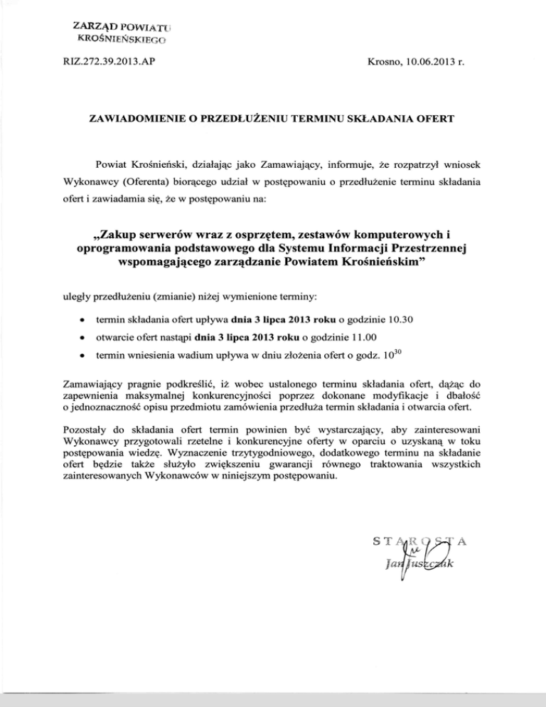 ZARZĄD POWIATU KROŚ NIEŃSKIEG RIZ.272.39.2013.AP Krosno, 10.06.2013 r. ZAWIADOMIENIE O PRZEDŁUŻENIU TERMINU SKŁADANIA OFERT Powiat Krośnieński, działając Wykonawcy (Oferenta) ofert i zawiadamia się, jako biorącego udział że w Zamawiający, postępowaniu informuje, o że rozpatrzył przedłużenie terminu wniosek składania w postępowaniu na: „Zakup serwerów wraz z osprzętem, zestawów komputerowych i oprogramowania podstawowego dla Systemu Informacji Przestrzennej wspomagającego zarządzanie Powiatem Krośnieńskim" uległy przedłużeniu (zmianie) niżej wymienione terminy: składania ofert upływa dnia 3 lipca 2013 roku o godzinie 10.30 • termin • otwarcie ofert nastąpi dnia 3 lipca 2013 roku o godzinie 11.00 • termin wniesienia wadium upływa w dniu złożenia ofert o godz. 1030 Zamawiający pragnie podkreślić, iż wobec ustalonego terminu składania ofert, dążąc do zapewnienia maksymalnej konkurencyjności poprzez dokonane modyfikacje i dbałość o jednoznaczność opisu przedmiotu zamówienia przedłuża termin składania i otwarcia ofert. Pozostały do składania ofert termin powinien być wystarczający, aby zainteresowani Wykonawcy przygotowali rzetelne i konkurencyjne oferty w oparciu o uzyskaną w toku postępowania wiedzę. Wyznaczenie trzytygodniowego, dodatkowego terminu na składanie ofert będzie także służyło zwiększeniu gwarancji równego traktowania wszystkich zainteresowanych Wykonawców w niniejszym postępowaniu. ST~9Ji'A Ja'f/us~k