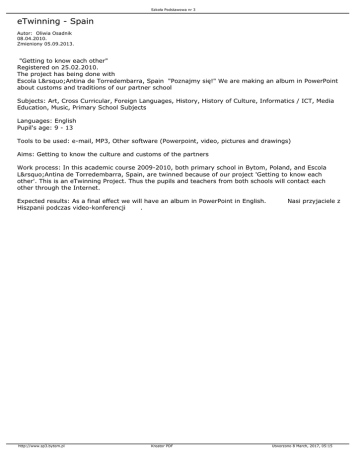 Szkoła Podstawowa nr 3 eTwinning - Spain Autor: Oliwia Osadnik 08.04.2010. Zmieniony 05.09.2013. "Getting to know each other" Registered on 25.02.2010. The project has being done with Escola L’Antina de Torredembarra, Spain "Poznajmy się!" We are making an album in PowerPoint about customs and traditions of our partner school Subjects: Art, Cross Curricular, Foreign Languages, History, History of Culture, Informatics / ICT, Media Education, Music, Primary School Subjects Languages: English Pupil's age: 9 - 13 Tools to be used: e-mail, MP3, Other software (Powerpoint, video, pictures and drawings) Aims: Getting to know the culture and customs of the partners Work process: In this academic course 2009-2010, both primary school in Bytom, Poland, and Escola L’Antina de Torredembarra, Spain, are twinned because of our project 'Getting to know each other'. This is an eTwinning Project. Thus the pupils and teachers from both schools will contact each other through the Internet. Expected results: As a final effect we will have an album in PowerPoint in English. Hiszpanii podczas video-konferencji . http://www.sp3.bytom.pl Kreator PDF Nasi przyjaciele z Utworzono 8 March, 2017, 05:15