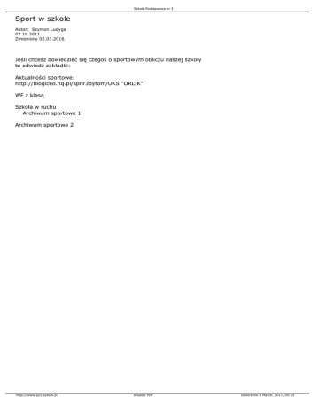 Szkoła Podstawowa nr 3 Sport w szkole Autor: Szymon Ludyga 07.10.2011. Zmieniony 02.03.2016. Jeśli chcesz dowiedzieć się czegoś o sportowym obliczu naszej szkoły to odwiedź zakładki: Aktualności sportowe: http://blogiceo.nq.pl/spnr3bytom/UKS "ORLIK" WF z klasą Szkoła w ruchu Archiwum sportowe 1 Archiwum sportowe 2 http://www.sp3.bytom.pl Kreator PDF Utworzono 8 March, 2017, 05:15
