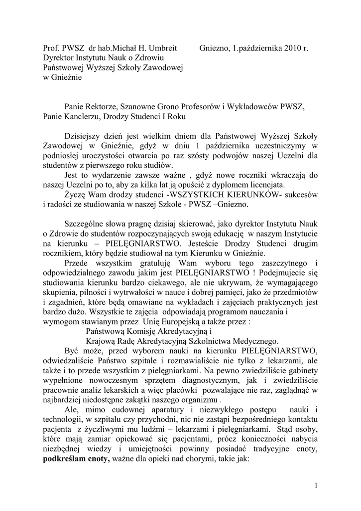 Prof. PWSZ dr hab.Michał H. Umbreit Dyrektor Instytutu Nauk o Zdrowiu Państwowej Wyższej Szkoły Zawodowej w Gnieźnie Gniezno, 1.października 2010 r. Panie Rektorze, Szanowne Grono Profesorów i Wykładowców PWSZ, Panie Kanclerzu, Drodzy Studenci I Roku Dzisiejszy dzień jest wielkim dniem dla Państwowej Wyższej Szkoły Zawodowej w Gnieźnie, gdyż w dniu 1 października uczestniczymy w podniosłej uroczystości otwarcia po raz szósty podwojów naszej Uczelni dla studentów z pierwszego roku studiów. Jest to wydarzenie zawsze ważne , gdyż nowe roczniki wkraczają do naszej Uczelni po to, aby za kilka lat ją opuścić z dyplomem licencjata. Życzę Wam drodzy studenci -WSZYSTKICH KIERUNKÓW- sukcesów i radości ze studiowania w naszej Szkole - PWSZ –Gniezno. Szczególne słowa pragnę dzisiaj skierować, jako dyrektor Instytutu Nauk o Zdrowie do studentów rozpoczynających swoją edukację w naszym Instytucie na kierunku – PIELĘGNIARSTWO. Jesteście Drodzy Studenci drugim rocznikiem, który będzie studiował na tym Kierunku w Gnieźnie. Przede wszystkim gratuluję Wam wyboru tego zaszczytnego i odpowiedzialnego zawodu jakim jest PIELĘGNIARSTWO ! Podejmujecie się studiowania kierunku bardzo ciekawego, ale nie ukrywam, że wymagającego skupienia, pilności i wytrwałości w nauce i dobrej pamięci, jako że przedmiotów i zagadnień, które będą omawiane na wykładach i zajęciach praktycznych jest bardzo dużo. Wszystkie te zajęcia odpowiadają programom nauczania i wymogom stawianym przez Unię Europejską a także przez : Państwową Komisję Akredytacyjną i Krajową Radę Akredytacyjną Szkolnictwa Medycznego. Być może, przed wyborem nauki na kierunku PIELĘGNIARSTWO, odwiedzaliście Państwo szpitale i rozmawialiście nie tylko z lekarzami, ale także i to przede wszystkim z pielęgniarkami. Na pewno zwiedziliście gabinety wypełnione nowoczesnym sprzętem diagnostycznym, jak i zwiedziliście pracownie analiz lekarskich a więc placówki pozwalające nie raz, zaglądnąć w najbardziej niedostępne zakątki naszego organizmu . Ale, mimo cudownej aparatury i niezwykłego postępu nauki i technologii, w szpitalu czy przychodni, nic nie zastąpi bezpośredniego kontaktu pacjenta z życzliwymi mu ludźmi – lekarzami i pielęgniarkami. Stąd osoby, które mają zamiar opiekować się pacjentami, prócz konieczności nabycia niezbędnej wiedzy i umiejętności powinny posiadać tradycyjne cnoty, podkreślam cnoty, ważne dla opieki nad chorymi, takie jak: 1 - zdolność empatii i współczucia, - umiejętność wzbudzania zaufania, a także biorąc pod uwagę obszary wiedzy pielęgniarskiej i odwiecznej tradycji opieki nad chorymi przez ludzi z tego zawodu ( gdyż przecież ból i choroby towarzyszą ludzkości od jej pobytu na planecie Ziemia) widzimy , że wielką uwagę musimy kierować na potrzeby: - pojedynczej osoby - pacjenta , - jego rodziny pogrążonej często w przerażeniu i bólu psychicznym z powodu choroby bliskiej osoby, a także w czasie kataklizmów nieraz całych grup społecznych, jak na przykład, po straszliwych atakach terrorystycznych , czy wielkim tsunami w Malezji. W takich przypadkach wielką rolę odgrywają pielęgniarki, udzielając masowo pierwszej pomocy, jako wysoko wyspecjalizowany personel medyczny. Wtedy to właśnie pielęgniarka /pielęgniarz (tak mogę powiedzieć, gdyż zarówno Panie jak i Panowie podjęli studia na kierunku Pielęgniarstwo) – jako kompetentne osoby muszą: -podejmować decyzje dotyczące właściwego sposobu udzielania pierwszej pomocy a następnie, -są odpowiedzialne, nie tylko za realizację , ale i także za właściwą organizację opieki nad chorymi, za jakości oferowanych świadczeń i usług. Stąd w systemie nowoczesnego kształcenia kadr pielęgniarskich kładzie się nacisk na przygotowanie absolwentów studiów na kierunkach pielęgniarstwo do wykonywania funkcji: terapeutycznych, ratowniczych, rehabilitacyjnych, profilaktycznych, wychowawczych, promujących zdrowie oraz zadań opiekuńczych, nie mówiąc już, co jest oczywiste, ich uczestniczenia jako instrumentariuszy na salach operacyjnych i opatrunkowych. Jak Państwo wiecie, do niedawna, szkolono pielęgniarki w Szkołach lub Liceach Medycznych, które miały profil kształcenia : 2, 2,5, 3. 5-cio letni. Od niedawna w Polsce obowiązuje profil kształcenia w systemie 3 – letnich studiów licencjackich ( to ten który realizujemy w PWSZ w Gnieźnie), po których, absolwenci mogą ubiegać się o przyjęcie na studia magisterskie w Uniwersytetach Medycznych. Dlatego obowiązuje zasada , że wszystkie pielęgniarki już pracujące muszą zdobyć także , co najmniej tytuł licencjata, nie zależnie od tego czy kończyły wcześniej szkołę 2-wu , czy 5-cio letnią, lub ukończyły liceum ogólnokształcące. Stąd w PWSZ w Gnieźnie kształcimy studentów w dwóch systemach: - w systemie studiów stacjonarnych – dla młodzieży, która ukończyła szkołę średnią i uzyskała świadectwo maturalne, - i w drugim systemie, to jest w systemie studiów pomostowych, zorganizowanych dla absolwentów szkół pielęgniarskich, dla tych osób które już pracują w zawodzie pielęgniarskim. 2 Nie ukrywam, że uniwersyteckie studia licencjackie - pielęgniarskie stały się studiami trudnymi, bo generalnie trudne zadania stają przed zawodem pielęgniarskim, o czym mówiłem już wcześniej. Abyście drodzy studenci naszej Państwowej Wyższej Szkoły Zawodowej w Gnieźnie mogli sprostać stawianym wam w przyszłości zadaniom, zatrudniliśmy do realizacji tego programu doświadczonych nauczycieli akademickich w tym: 13 doktorów habilitowanych z grona których 7 jest profesorami, 22 doktorów i 43 magistrów, nie tylko różnych dyscyplin medycznych , ale także innych uniwersyteckich specjalności. To właśnie ta wysoko wyspecjalizowana kadra nauczycieli akademickich wyłoży Państwu zarówno teorię jak i poprowadzi zajęcia prakty