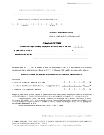 .................................................................................................... Krzeszowice, .............................. .................................................................................................... imię i nazwisko przedsiębiorcy albo nazwa osoby prawnej ..................................................................................................... ..................................................................................................... adres zamieszkania przedsiębiorcy albo siedziba osoby prawnej nr telefonu tel. kom. Burmistrz Gminy Krzeszowice Referat Wspierania Przedsiebiorczości OŚWIADCZENIE o wartości sprzedaży napojów alkoholowych za rok w placówce przy ul. ...........................................................................w……………………………… zezwolenie(a) Nr .............................................................................................................. ……………………………………………………………………………………………………… .............................................................................................................. Na podstawie art. 111 ust. 4 ustawy z dnia 26 października 1982 r. o wychowaniu w trzeźwości i przeciwdziałaniu alkoholizmowi (Dz.U. z 2007 r. Nr 70, poz. 473 z późn. zm.) zw. dalej Ustawą oświadczam(y), że wartość sprzedaży brutto napojów alkoholowych* wynosiła: do 4,5% zawartości alkoholu oraz piwa zł gr od 4,5% do 18% zawartości alkoholu ( z wyjątkiem piwa) zł gr powyżej 18% zawartości alkoholu zł gr Powyższe dane zostały złożone zgodnie ze stanem faktycznym na podstawie prawidłowo i rzetelnie prowadzonej ewidencji księgowej ze świadomością konsekwencji prawnych za podanie niezgodnych z prawdą danych, tj.: odpowiedzialności karnej z art. 233 § 1 ustawy z dnia 6 czerwca 1997 r. Kodeks karny (Dz.U. z 1997 r. Nr 88, poz. 553 z późn. zm.) – „Kto, składając zeznanie mające służyć za dowód w postępowaniu sądowym lub w innym postępowaniu prowadzonym na podstawie ustawy, zeznaje nieprawdę lub zataja prawdę, podlega karze pozbawienia wolności do lat 3.” - cofnięcia zezwolenia na podstawie art. 18 ust. 10 pkt 5 Ustawy. .................................................................................................. Czytelny podpis(y) i pieczęć imienna przedsiębiorcy(ów) lub pełnomocnika(ów) ** * wartość sprzedaży – kwota należna sprzedawcy za sprzedane napoje alkoholowe, z uwzględnieniem podatku od towarów i usług oraz podatku akcyzowego (art. 2¹ pkt 8 Ustawy). ** W przypadku prowadzenia działalności na podstawie umowy spółki cywilnej – podpisy wszystkich wspólników.