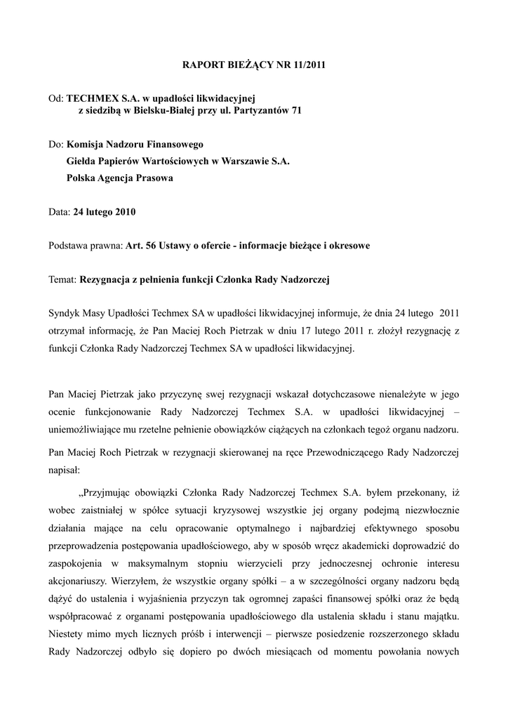 RAPORT BIEŻĄCY NR 11/2011 Od: TECHMEX S.A. w upadłości likwidacyjnej z siedzibą w Bielsku-Białej przy ul. Partyzantów 71 Do: Komisja Nadzoru Finansowego Giełda Papierów Wartościowych w Warszawie S.A. Polska Agencja Prasowa Data: 24 lutego 2010 Podstawa prawna: Art. 56 Ustawy o ofercie - informacje bieżące i okresowe Temat: Rezygnacja z pełnienia funkcji Członka Rady Nadzorczej Syndyk Masy Upadłości Techmex SA w upadłości likwidacyjnej informuje, że dnia 24 lutego 2011 otrzymał informację, że Pan Maciej Roch Pietrzak w dniu 17 lutego 2011 r. złożył rezygnację z funkcji Członka Rady Nadzorczej Techmex SA w upadłości likwidacyjnej. Pan Maciej Pietrzak jako przyczynę swej rezygnacji wskazał dotychczasowe nienależyte w jego ocenie funkcjonowanie Rady Nadzorczej Techmex S.A. w upadłości likwidacyjnej – uniemożliwiające mu rzetelne pełnienie obowiązków ciążących na członkach tegoż organu nadzoru. Pan Maciej Roch Pietrzak w rezygnacji skierowanej na ręce Przewodniczącego Rady Nadzorczej napisał: „Przyjmując obowiązki Członka Rady Nadzorczej Techmex S.A. byłem przekonany, iż wobec zaistniałej w spółce sytuacji kryzysowej wszystkie jej organy podejmą niezwłocznie działania mające na celu opracowanie optymalnego i najbardziej efektywnego sposobu przeprowadzenia postępowania upadłościowego, aby w sposób wręcz akademicki doprowadzić do zaspokojenia w maksymalnym stopniu wierzycieli przy jednoczesnej ochronie interesu akcjonariuszy. Wierzyłem, że wszystkie organy spółki – a w szczególności organy nadzoru będą dążyć do ustalenia i wyjaśnienia przyczyn tak ogromnej zapaści finansowej spółki oraz że będą współpracować z organami postępowania upadłościowego dla ustalenia składu i stanu majątku. Niestety mimo mych licznych próśb i interwencji – pierwsze posiedzenie rozszerzonego składu Rady Nadzorczej odbyło się dopiero po dwóch miesiącach od momentu powołania nowych członków Rady Nadzorczej – co jest opieszałością nie do przyjęcia, zważając na trwające postępowanie upadłościowe i dynamicznie pojawiające się nowe fakty i okoliczności. Dla właściwego i sprawnego przeprowadzenia postępowania upadłościowego konieczna jest stała wymiana informacji z syndykiem. Mimo informowania Pana o tym fakcie, na żadne z posiedzeń nie został zaproszony syndyk, co bezpośrednio uniemożliwiło pozyskanie informacji źródłowych i opracowanie właściwych planów likwidacji majątku. Jako rażąco niewłaściwe uważam procesowanie nad uchwałą w sprawie wyboru biegłego rewidenta. W tym zakresie mimo zarządzenia głosowania za pośrednictwem elektronicznych środków przekazu – nie przeprowadzono pełnego i transparentnego głosowania z poinformowaniem wszystkich członków o jego wyniku. Nie rozważono i nie przegłosowano innych kandydatur prócz podmiotów zgłoszonych li tylko przez Zarząd (sic!), zaś na skutek tegoż ułomnego w moim przekonaniu głosowanie – zdecydował Pan Przewodniczący wybrać do dalszego procesowania ofertę dotkniętą rażącymi błędami. Również dalsze procesowanie odbyło się w sposób ułomny i mało transparentny. Treść uchwały została sformułowana w sposób błędny delegując na zarząd spółki uprawnienie do zawarcia umowy wbrew bezwzględnemu zakazowi ustanowionemu przepisami prawa upadłościowego i naprawczego. Mimo głosowania pisemnego nad uchwałą o wyborze biegłego rewidenta – nie uznał Pan Przewodniczący za stosowne poinformować członków rady o wynikach tegoż głosowania – a o fakcie podjęcia tej wadliwej uchwały dowiedziałem się z pisma syndyka słusznie wytykającego błędy i nieprawidłowości tak prawno-formalne jak i etyczne – o których wspomniał już na wcześniejszym etapie Pan Jacek Piotrowski w swym mailu skierowanym do wszystkich członków Rady Nadzorczej. W tym stanie rzeczy nie widzę możliwości dalszego pełnienia obowiązków członka Rady Nadzorczej – a tym bardziej stanowienia mają osobą swoistego „parawanu” dla poprzednich oraz obecnych działań i zaniechań organów spółki Techmex S.A.”