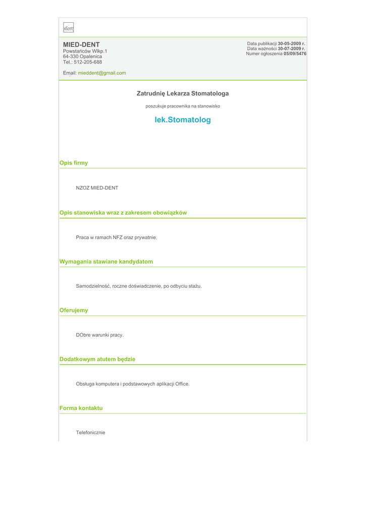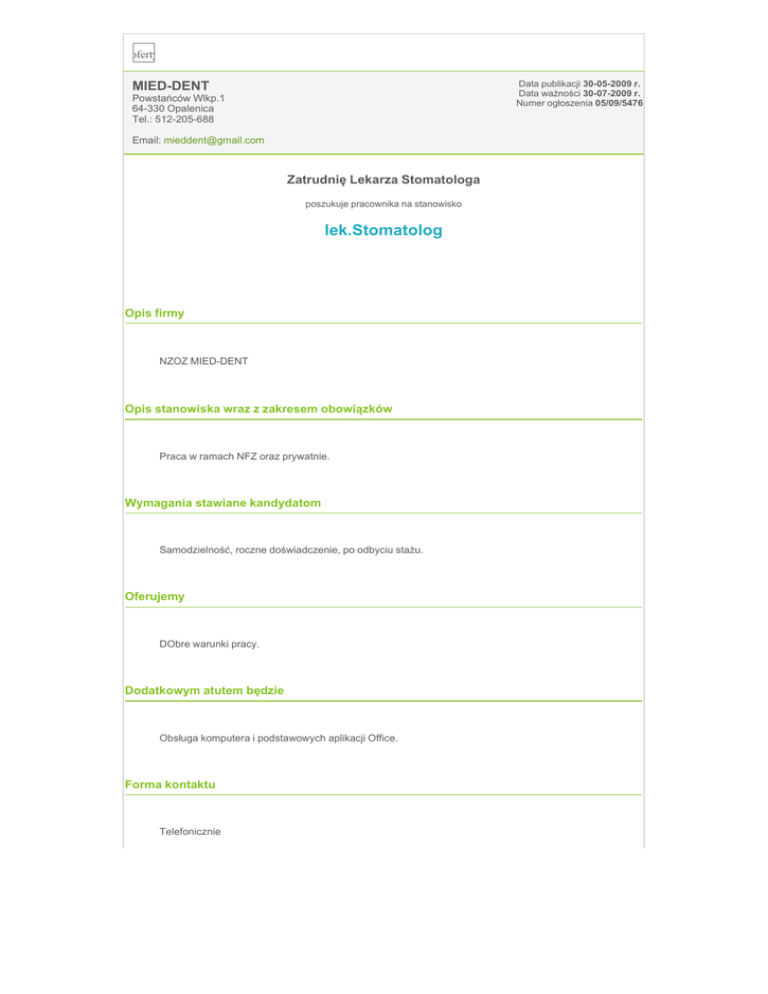 praca, oferty pracy Data publikacji 30-05-2009 r. Data ważności 30-07-2009 r. Numer ogłoszenia 05/09/5476 MIED-DENT Powstańców Wlkp.1 64-330 Opalenica Tel.: 512-205-688 Email: [email protected] Zatrudnię Lekarza Stomatologa poszukuje pracownika na stanowisko lek.Stomatolog Opis firmy NZOZ MIED-DENT Opis stanowiska wraz z zakresem obowiązków Praca w ramach NFZ oraz prywatnie. Wymagania stawiane kandydatom Samodzielność, roczne doświadczenie, po odbyciu stażu. Oferujemy DObre warunki pracy. Dodatkowym atutem będzie Obsługa komputera i podstawowych aplikacji Office. Forma kontaktu Telefonicznie Informacje dodatkowe Minimalne wykształcenie: wyższe Branża: Medycyna, Farmacja i Służba zdrowia Forma zatrudnienia: umowa o pracę Wymiar pracy: ½ etatu Wynagrodzenie (netto): nie podano Lokalizacja: Polska Województwo: wielkopolskie, Miejsce pracy miasto(a) lub kraj(e): Opalenica Prawo jazdy: Znajomość języka obcego: Ogłoszenie pochodzi z portalu www.i-praca.pl - Internetowy Portal Pracy ilość wyświetleń: 11002