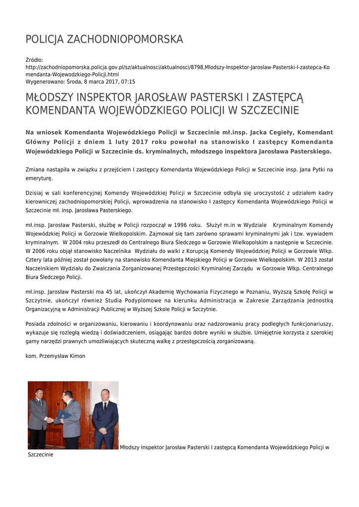 POLICJA ZACHODNIOPOMORSKA Źródło: http://zachodniopomorska.policja.gov.pl/sz/aktualnosci/aktualnosci/8798,Mlodszy-Inspektor-Jaroslaw-Pasterski-I-zastepca-Ko mendanta-Wojewodzkiego-Policji.html Wygenerowano: Środa, 8 marca 2017, 07:15 MŁODSZY INSPEKTOR JAROSŁAW PASTERSKI I ZASTĘPCĄ KOMENDANTA WOJEWÓDZKIEGO POLICJI W SZCZECINIE Na wniosek Komendanta Wojewódzkiego Policji w Szczecinie mł.insp. Jacka Cegieły, Komendant Główny Policji z dniem 1 luty 2017 roku powołał na stanowisko I zastępcy Komendanta Wojewódzkiego Policji w Szczecinie ds. kryminalnych, młodszego inspektora Jarosława Pasterskiego. Zmiana nastąpiła w związku z przejściem I zastępcy Komendanta Wojewódzkiego Policji w Szczecinie insp. Jana Pytki na emeryturę. Dzisiaj w sali konferencyjnej Komendy Wojewódzkiej Policji w Szczecinie odbyła się uroczystość z udziałem kadry kierowniczej zachodniopomorskiej Policji, wprowadzenia na stanowisko I zastępcy Komendanta Wojewódzkiego Policji w Szczecinie mł. insp. Jarosława Pasterskiego. mł.insp. Jarosław Pasterski, służbę w Policji rozpoczął w 1996 roku. Służył m.in w Wydziale Kryminalnym Komendy Wojewódzkiej Policji w Gorzowie Wielkopolskim. Zajmował się tam zarówno sprawami kryminalnymi jak i tzw. wywiadem kryminalnym. W 2004 roku przeszedł do Centralnego Biura Śledczego w Gorzowie Wielkopolskim a następnie w Szczecinie. W 2006 roku objął stanowisko Naczelnika Wydziału do walki z Korupcją Komendy Wojewódzkiej Policji w Gorzowie Wlkp. Cztery lata później został powołany na stanowisko Komendanta Miejskiego Policji w Gorzowie Wielkopolskim. W 2013 został Naczelnikiem Wydziału do Zwalczania Zorganizowanej Przestępczości Kryminalnej Zarządu w Gorzowie Wlkp. Centralnego Biura Śledczego Policji. mł.insp. Jarosław Pasterski ma 45 lat, ukończył Akademię Wychowania Fizycznego w Poznaniu, Wyższą Szkołę Policji w Szczytnie, ukończył również Studia Podyplomowe na kierunku Administracja w Zakresie Zarządzania Jednostką Organizacyjną w Administracji Publicznej w Wyższej Szkole Policji w Szczytnie. Posiada zdolności w organizowaniu, kierowaniu i koordynowaniu oraz nadzorowaniu pracy podległych funkcjonariuszy, wykazuje się rozległą wiedzą i doświadczeniem, osiągając bardzo dobre wyniki w służbie. Umiejętnie korzysta z szerokiej gamy narzędzi prawnych umożliwiających skuteczną walkę z przestępczością zorganizowaną. kom. Przemysław Kimon Młodszy Inspektor Jarosław Pasterski I zastępcą Komendanta Wojewódzkiego Policji w Szczecinie Młodszy Inspektor Jarosław Pasterski I zastępcą Komendanta Wojewódzkiego Policji w Szczecinie Młodszy Inspektor Jarosław Pasterski I zastępcą Komendanta Wojewódzkiego Policji w Szczecinie Młodszy Inspektor Jarosław Pasterski I zastępcą Komendanta Wojewódzkiego Policji w Szczecinie Młodszy Inspektor Jarosław Pasterski I zastępcą Komendanta Wojewódzkiego Policji w Szczecinie Młodszy Inspektor Jarosław Pasterski I zastępcą Komendanta Wojewódzkiego Policji w Szczecinie Młodszy Inspektor Jarosław Pasterski I zastępcą Komendanta Wojewódzkiego Policji w Szczecinie Młodszy Inspektor Jarosław Pasterski I zastępcą Komendanta Wojewódzkiego Policji w Szczecinie Młodszy Inspektor Jarosław Pasterski I zastępcą Komendanta Wojewódzkiego Policji w Szczecinie Młodszy Inspektor Jarosław Pasterski I zastępcą Komendanta Wojewódzkiego Policji w Szczecinie Młodszy Inspektor Jarosław Pasterski I zastępcą Komendanta Wojewódzkiego Policji w Szczecinie Młodszy Inspektor Jarosław Pasterski I zastępcą Komendanta Wojewódzkiego Policji w Szczecinie Młodszy Inspektor Jarosław Pasterski I zastępcą Komendanta Wojewódzkiego Policji w Szczecinie Młodszy Inspektor Jarosław Pasterski I zastępcą Komendanta Wojewódzkiego Policji w Szczecinie Młodszy Inspektor Jarosław Pasterski I zastępcą Komendanta Wojewódzkiego Policji w Szczecinie Ocena: 0.8/5 (4) Tweetnij