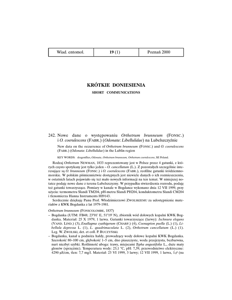 Wiad. entomol. 19 (1) Poznań 2000 KRÓTKIE DONIESIENIA SHORT COMMUNICATIONS 242. Nowe dane o występowaniu Orthetrum brunneum (FONSC .) i O. coerulescens (FABR.) (Odonata: Libellulidae) na Lubelszczyźnie New data on the occurrence of Orthetrum brunneum (F ONSC.) and O. coerulescens (FABR .) (Odonata: Libellulidae) in the Lublin region KEY WORDS: dragonflies, Odonata, Orthetrum brunneum, Orthetrum coerulescens, SE Poland. Rodzaj Orthetrum NEWMAN, 1833 reprezentowany jest w Polsce przez 4 gatunki, z których często spotykany jest tylko jeden – O. cancellatum (L.). Z pozostałych szczególnie interesujące są O. brunneum (FONSC .) i O. coerulescens (FABR .), reofilne gatunki śródziemnomorskie. W polskim piśmiennictwie dostępnych jest niewiele danych o ich rozmieszczeniu, w ostatnich latach pojawiało się też mało nowych informacji na ten temat. W niniejszej notatce podaję nowe dane z terenu Lubelszczyzny. W przypadku stwierdzenia rozrodu, podaję też gatunki towarzyszące. Pomiary w kanale w Bogdance wykonano dnia 12 VII 1999, przy użyciu: termometru Slandi TM204, pH-metru Slandi PH204, konduktometru Slandi CM204 i tlenomierza Hanna Instruments HI9143. Serdecznie dziękuję Panu Prof. Włodzimierzowi ZWOLSKIEMU za udostępnienie materiałów z KWK Bogdanka z lat 1979-1981. Orthetrum brunneum (FONSCOLOMBE, 1837) – Bogdanka (UTM: FB48; 23°01' E, 51°19' N), zbiornik wód dołowych kopalni KWK Bogdanka. Materiał: 25 X 1979, 1 larwa. Gatunki towarzyszące (larwy): Ischnura elegans (VAND. LIND.) (3), Enallagma cyathigerum (CHARP.) (4), Coenagrion puella (L.) (1), Libellula depressa L. (1), L. quadrimaculata L. (2), Orthetrum cancellatum (L.) (1). Leg. W. ZWOLSKI, det. et coll. P. B UCZYŃSKI. – Bogdanka, kanał u podnóża hałdy, prowadzący wody dołowe kopalni KWK Bogdanka. Szerokość 80–100 cm, głębokość 1–5 cm, dno piaszczyste, woda przejrzysta, bezbarwna, nurt niezbyt szybki. Roślinność uboga: trawy, miejscami Typha angustifolia L., duże maty glonów (sprzężnic). Temperatura wody: 23,1 °C, pH: 7,39, przewodnictwo elektryczne: 4290 mS/cm, tlen: 7,7 mg/l. Materiał: 23 VI 1999, 3 larwy; 12 VII 1999, 1 larwa, 1% (na 52 KRÓTKIE DONIESIENIA 100 m kanału zliczono ok. 30%%, większość terytorialnych). Larw innych gatunków nie stwierdzono, towarzyszące imagines: I. elegans, I. pumilio (CHARP.), C. puella (wszystkie nielicznie). – Siemień ad Parczew (UTM: FC21; 22°46' E, 51°38' N), pola. 7 VII 1941, 1&. Leg. et det. W. B AZYLUK, coll. Muzeum i Instytut Zoologii PAN w Warszawie. Orthetrum coerulescens (F ABRICIUS, 1778) – Bogdanka, rów wyprowadzający wodę ze zbiornika pośrodku hałdy KWK Bogdanka (koło śluzy). Materiał: 25 X 1979, 6 larw. Gatunki towarzyszące (larwy): Calopteryx splendens (HARR.) (1), I. elegans (3), I. pumilio (1), E. cyathigerum (3), C. puella (6), L. depressa (1). Leg. W. ZWOLSKI, det. et coll. P. B UCZYŃSKI. – Stulno (UTM: FB79; 51°24' N, 23°36' E), jez. Płotycze, otoczone torfowiskiem wysokim. Materiał: 16 VII 1999, 1&, z oblepioną zaschniętymi jajami dolną stroną odwłoka. Leg. et det. et coll. P. B UCZYŃSKI. Omawiane gatunki były dotychczas wykazywane na terenie Lubelszczyzny bardzo rzadko: O. brunneum jest znany tylko z 3 stanowisk, O. coerulescens – z 1 (B UCZYŃSKI 1996: Wiad. entomol., 15, 1: 1-10; ŁABĘDZKI 1989: Pr. Kom. Nauk roln. Kom. Nauk leśn. PTPN, 48: 39-45). Wydaje się, że są one częstsze, niż to wynika z piśmiennictwa. Ich poszukiwania wymagają jednak penetracji określonego typu siedlisk (drobne cieki o stałym, najlepiej niskim poziomie wody; dla O. coerulescens – bogate, dla O. brunneum – ubogie w roślinność). Stwierdzenie O. brunneum na Podlasiu jest też interesujące o tyle, że przez środkowe Podlasie przebiega północna granica areału tego gatunku. Najbardziej wysunięte na północ jego stanowisko (J ÖDICKE 1998: Libellula, 18, 1/2: 31-48.) jest oddalone od Bogdanki o ok. 200 km. Stwierdzenie O. coerulescens nad jeziorem Płotycze jest raczej przypadkowe, rozwija się on jednak zapewne w którymś z pobliskich cieków – o czym może też świadczyć oblepienie odwłoka jajami (złapany okaz musiał je niedawno składać). Trudno interpretować, w związku z brakiem danych, stanowisko O. brunneum w Siemieniu. Na szczególną uwagę zasługuje stwierdzenie obydwu omawianych gatunków w wodach KWK Bogdanka, w tym O. brunneum – tak w latach 70-tych, jak i obecnie, co może świadczyć o stałości jego występowania. Zjawisko to, bez wątpienia zasługujące na uwagę, nie było dotychczas badane na terenie Polski. Jest jednak wiele doniesień ze wschodnich Niemiec o obecności (nieraz licznej) O. brunneum na terenach kopalni węgla (m.in. DONATH 1983: Ent. Nachr. Ber., 27: 123-126; MÜLLER 1992: Ent. Nachr. Ber., 36: 111-113; XYLANDER, STEPHAN 1998: Abh. Ber. Naturkundemus. Görlitz, 70, 2: 65-80). Wydaje się, że O. brunneum znajduje w tym silnie przekształconym krajobrazie korzystne warunki rozwoju, przy czym nie przeszkadza mu wysoka mineralizacja wód kopalnianych (w Bogdance – wnosząc z przewodnictwa elektrycznego wody – ponad 400 mg/l). Pomiary wykonane w Bogdance wskazują, że pozostałe czynniki środowiska były dla reofilów korzystne: umiarkowane pH, wysokie natlenienie i jednocześnie wysoka temperatura wody, co nie jest bez znaczenia dla śródziemnomorskiego O. brunneum. Ponieważ badany kanał stanowi odpływ wód ze stale eksploatowanej kopalni, musi też być często udrażniany, co sprzyja utrzymaniu wczesnego stadium sukcesji roślinności (kolejny czynnik korzystny dla O. brunneum, który jest gatunkiem pionierskim). Paweł BUCZYŃSKI, Lublin