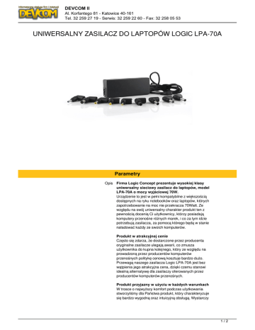 DEVCOM II Al. Korfantego 81 - Katowice 40-161 Tel. 32 259 27 19 - Serwis: 32 259 22 60 - Fax: 32 258 05 53 UNIWERSALNY ZASILACZ DO LAPTOPÓW LOGIC LPA-70A Parametry Opis Firma Logic Concept prezentuje wysokiej klasy uniwersalny sieciowy zasilacz do laptopów, model LPA-70A o mocy wyjściowej 70W. Urządzenie to jest w pełni kompatybilne z większością dostępnych na ryku notebooków oraz laptopów, których zapotrzebowanie na moc nie przekracza 70Watt. Ze względu na swój uniwersalny charakter produkt ten z pewnością docenią Ci użytkownicy, którzy posiadają komputery przenośne różnych marek, i co za tym idzie potrzebują zasilacza, za pomocą którego będą w stanie naładować każdy ze swoich komputerów. Produkt w atrakcyjnej cenie Często się zdarza, że dostarczone przez producenta oryginalne zasilacze ulegają awarii, co zmusza użytkownika do kupna kolejnego, który ze względu na prowadzoną przez producentów komputerów przenośnych politykę cenową kosztuje bardzo dużo. Przewagą naszego zasilacza Logic LPA-70A jest bez wątpienia jego atrakcyjna cena, dzięki czemu stanowi idealną alternatywę dla zasilaczy oferowanych przez producentów komputerów przenośnych. Produkt przyjazny w użyciu w każdych warunkach W trosce o najwyższy komfort podczas użytkowania stworzyliśmy dla Państwa produkt, który charakteryzuje się bardzo wygodną oraz intuicyjną obsługą. Wystarczy 1/2 DEVCOM II Al. Korfantego 81 - Katowice 40-161 Tel. 32 259 27 19 - Serwis: 32 259 22 60 - Fax: 32 258 05 53 tylko podłączyć odpowiednią końcówkę do Państwa laptopa i po chwili zasilacz gotowy jest już do pracy. Z kolei dzięki masywnej budowie zasilacz Logic LPA-70A jest odporny na wszelkiego rodzaju uszkodzenia mechaniczne, co czyni z niego produkt, który można używać niemalże w każdych warunkach. Produkt bezpieczny w użyciu Używając naszego zasilacza Logic LPA-70A możesz mieć pewność, że Twój komputer będzie ładowany zawsze bezpiecznym prądem o stabilnym napięciu. Z myślą o najwyższym poziomie bezpieczeństwa Państwa sprzętu, nasz najnowszy zasilacz został wyposażony w szereg filtrów zabezpieczających, które chronią Państwa laptop przed: - Przeciążeniem (OP) - Przegrzaniem (OH) - Zwarciem (SC) - Zbyt wysokim prądem (OC) - Przepięciem (OV) Przeznaczenie sieciowy Moc zasilacza 70 Wtyczka - 15 V 6.3*3.0 TOSHIBA - 19.5 V 4.5*3.0 HP - 16 V 6.5*4.4 SONY - 16 V 4.8*1.7 SONY,HP - 19 V 5.5*2.5 TOSHIBA, ASUS,LITEON - 19 V 5.3*3.0 SAMSUNG - 19 V 5.5*1.7 ACER, TOSHIBA - 19.5 V 6.5*4.4 SONY, LG - 19.5 V 7.4*5.0 DELL - 18.5 V 7.4*5.0 HP W opakowaniu 9 wtyczek (konektorów) Pasuje do - Acer - Asus - Dell - HP - LG - Samsung - Sony - Toshiba 2/2 Powered by TCPDF (www.tcpdf.org)