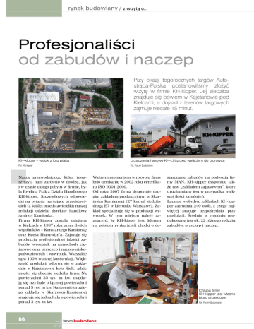 rynek budowlany / z wizytą u... Profesjonaliści od zabudów i naczep Przy okazji tegorocznych targów Autostrada-Polska postanowiliśmy złożyć wizytę w firmie KH-kipper. Jej siedziba znajduje się bowiem w Kajetanowie pod Kielcami, a dojazd z terenów targowych zajmuje niecałe 15 minut. KH-kipper – widok z lotu ptaka Urządzenia hakowe KH-Lift przed wejściem do biurowca Fot. KH-kipper Fot. Forum Budowlane Naszą przewodniczką, która towarzyszyła nam zarówno w drodze, jak i w czasie całego pobytu w firmie, była Ewelina Ptak z Działu Handlowego KH-kipper. Szczegółowych odpowiedzi na pytania nurtujące przedstawicieli (a ściślej przedstawicielki) naszej redakcji udzielał dyrektor handlowy Andrzej Kamionka. Firma KH-kipper została założona w Kielcach w 1997 roku przez dwóch wspólników – Konstantego Kamionkę oraz Keesa Harrewijn’a. Zajmuje się produkcją profesjonalnej jakości zabudów wywrotek na samochody ciężarowe oraz przyczep i naczep niskopodwoziowych i wywrotek. Wszystkie są w 100% własnej konstrukcji. Większość produkcji odbywa się w zakładzie w Kajetanowie koło Kielc, gdzie mieści się obecnie siedziba firmy. Na powierzchni 35 tys. m kw. znajdują się trzy hale o łącznej powierzchni ponad 5 tys. m kw. Na terenie drugiego zakładu w Skarżysku-Kamiennej znajduje się jedna hala o powierzchni ponad 3 tys. m kw. 66 Ważnym momentem w rozwoju firmy było uzyskanie w 2002 roku certyfikatu ISO 9001:2000. Od roku 2007 firma dysponuje drugim zakładem produkcyjnym w Skarżysku Kamiennej (27 km od siedziby drogą E7 w kierunku Warszawy). Zakład specjalizuje się w produkcji wywrotek. W tym miejscu należy zaznaczyć, że KH-kipper jest liderem na polskim rynku jeżeli chodzi o do- maj forum budowlane 2 010 starczanie zabudów na podwozia firmy MAN. KH-kipper dysponuje także tzw. „zakładem zapasowym”, który uruchamiany jest w przypadku większej ilości zamówień. Łącznie w obydwu zakładach KH-kipper zatrudnia 240 osób, z czego najwięcej pracuje bezpośrednio przy produkcji. Średnio w tygodniu produkowane jest ok. 22 różnego rodzaju zabudów, przyczep i naczep. Chlubą firmy KH-kipper jest własne biuro projektowe Fot. Forum Budowlane z wizytą u... Na placu wystawowym eksponowane są wybrane zabudowy i naczepy / rynek budowlany Podwozia Mercedes i MAN czekające na „swoje” zabudowy Fot. Forum Budowlane Fot. Forum Budowlane W Kajetanowie zlokalizowane jest biuro konstrukcyjne, w którym na stałe zatrudnionych jest ośmiu inżynierów. Zajmują się oni zarówno projektowaniem nowych, jak i udoskonalaniem istniejących już produktów KH-kipper. Biuro projektuje pojazdy „szyte na miarę”. Klient może wybrać wymiary zabudowy, grubość i rodzaj użytych materiałów, i dodatkowe opcje wyposażenia. Uwzględnione są także rodzaj przewożonego materiału i podłoże, na którym pojazd będzie użytkowany. Wszystkie prace związane z wycinaniem elementów i spawaniem wykonywane są przez KH-kipper we własnym zakresie. Firma dysponuje specjalistycznymi maszynami do cięcia i gięcia stali oraz robotem spawalniczym. Posiada oczywiście, nieodzowne w tej branży, własną lakiernię i śrutownię. W Kajetanowie znajduje się również serwis. Dział serwisu zajmuje się naprawami gwarancyjnymi i pogwarancyjnymi, przeglądami okresowymi zabudów (za dopłatą istnieje możliwość dojazdu do klienta), reklamacjami (szybka reakcja – 48 godzin od zgłoszenia) oraz sprzedażą części zamiennych do zabudów KH-kipper. Mobilny serwis KH-kipper jest w stanie dotrzeć do klienta w dowolne miejsce w kraju i za granicą. Usługi wykonywane są też w sieci autoryzowanych stacji serwisowych. Serwis w Kajetanowie ma autoryzację takich firm jak HMF, Hyva i Haldex. Zajmuje się także organizacją różnego rodzaju szkoleń, zarówno praktycznych, jak i teoretycznych. Za szkolenia odpowiedzialni są Mariusz Tarłowski i Damian Sidło. szerzenie oferty produktowej o nowe modele zabudów, przyczep i naczep. Zamierza położyć większy nacisk na eksport swoich produktów, głównie do krajów ościennych. Nie sposób w tak krótkim opracowaniu przekazać wszystkich informacji dotyczących zarówno firmy KH-kipper, jak i jej szerokiej oferty. Polecamy stronę www.kh-kipper.pl oraz kontakt z wymienionymi na początku artykułu osobami. Robot spawalniczy jest w firmie KH-kipper od 2008 roku Wnętrze hali montażowej Fot. KH-kipper Fot. KH-kipper Pomimo, że w 2009 roku firma zanotowała spadek produkcji o ok. 60% w chwili obecnej jest ona na poziomie produkcji z lat 2006–2007. Pomyślne są więc prognozy na koniec roku. W planach KH-kipper ma dalsze po- Na załączonych zdjęciach przedstawiamy natomiast jedynie namiastkę tego, co udało się nam zobaczyć podczas krótkiej wizyty w firmie.