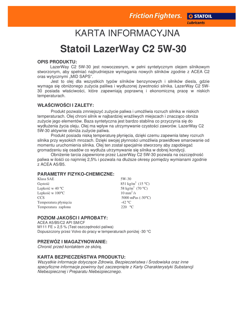 KARTA INFORMACYJNA Statoil LazerWay C2 5W-30 OPIS PRODUKTU: LazerWay C2 5W-30 jest nowoczesnym, w pełni syntetycznym olejem silnikowym stworzonym, aby spełnia najtrudniejsze wymagania nowych silników zgodnie z ACEA C2 oras wytycznymi „MID SAPS”. Jest to olej dla wszystkich typów silników benzynowych i silników diesla, gdzie wymaga si obni onego zu ycia palilwa i wydłuzonej ywotno ci silnika. LazerWay C2 5W30 posiada wła ciwo ci, które zapewniaj poprawn i ekonomiczn prac w niskich temperaturach. WŁA CIWO CI I ZALETY: Produkt pozwala zmniejszy zu ycie paliwa i umo liwia rozruch silnika w niskich temperaturach. Olej chroni silnik w najbardziej wra liwych miejscach i znacz co obni a zu ycie jego elementów. Baza syntetyczna jest bardzo stabilna co przyczynia si do wydłu enia ycia oleju. Olej ma wpływ na utrzymywanie czysto ci zaworów. LazerWay C2 5W-30 aktywnie obni a zu ycie paliwa. Produkt posiada nisk temperatur płyni cia, dzi ki czemu zapewnia łatwy rozruch silnika przy wysokich mrozach. Dzi ki swojej płynno ci umo liwia prawidłowe smarowanie od momentu uruchomienia silnika. Olej ten został specjalnie stworzony aby zapobiega gromadzeniu si osadów co wydłu a utrzymywanie si silnika w dobrej kondycji. Obni enie tarcia zapewnione przez LazerWay C2 5W-30 pozwala na oszcz dno paliwa w ilo i co najmniej 2,5% i pozwala na dłu sze okresy pomi dzy wymianami zgodnie z ACEA A5/B5. PARAMETRY FIZYKO-CHEMICZNE: Klasa SAE G sto Lepko w 40 °C Lepko w 100°C CCS Temperatura płyni cia Temperatura zapłonu 5W-30 851 kg/m3 (15 °C) 58 kg/m3 (70 °C) 10 mm2 /s 5000 mPas (-30°C) -42 °C 220 °C POZIOM JAKO CI I APROBATY: ACEA A5/B5/C2 API SM/CF M111 FE > 2,5 % (Test oszcz dno ci paliwa) Dopuszczony przez Volvo do pracy w temperaturach poni ej -30 °C PRZEWÓZ I MAGAZYNOWANIE: Chroni przed kontaktem ze skór . KARTA BEZPIECZE STWA PRODUKTU: Wszystkie informacje dotycz ce Zdrowia, Bezpiecze stwa i rodowiska oraz inne specyficzne informacje powinny by zaczerpni te z Karty Charakterystyki Substancji Niebezpiecznej i Preparatu Niebezpiecznego.