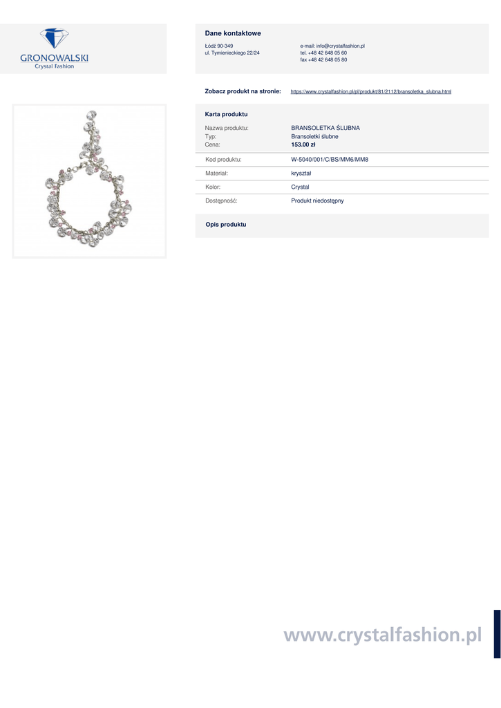 Powered by TCPDF (www.tcpdf.org) Dane kontaktowe Łódź 90-349 ul. Tymienieckiego 22/24 Zobacz produkt na stronie: e-mail: [email protected] tel. +48 42 648 05 60 fax +48 42 648 05 80 https://www.crystalfashion.pl/pl/produkt/81/2112/bransoletka_slubna.html Karta produktu Nazwa produktu: Typ: Cena: BRANSOLETKA ŚLUBNA Bransoletki ślubne 153.00 zł Kod produktu: W-5040/001/C/BS/MM6/MM8 Materiał: kryształ Kolor: Crystal Dostępność: Produkt niedostępny Opis produktu